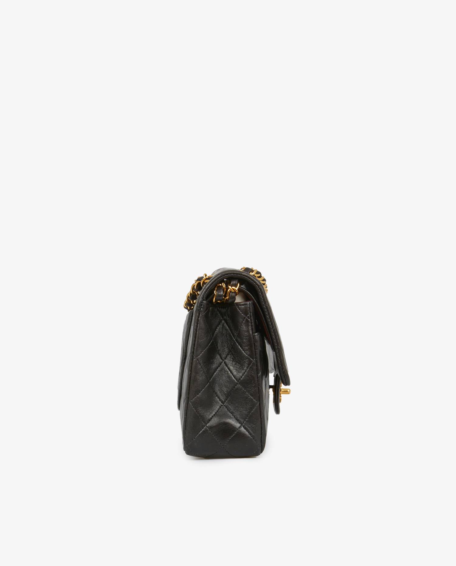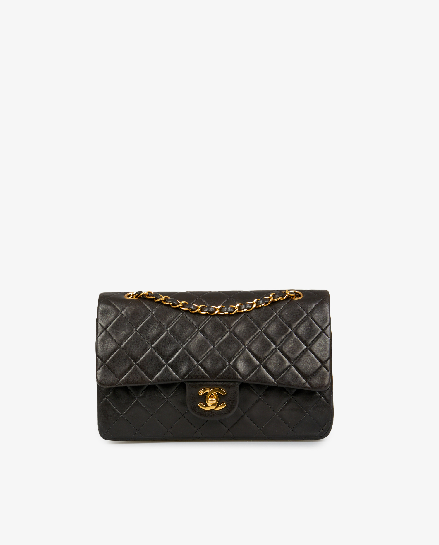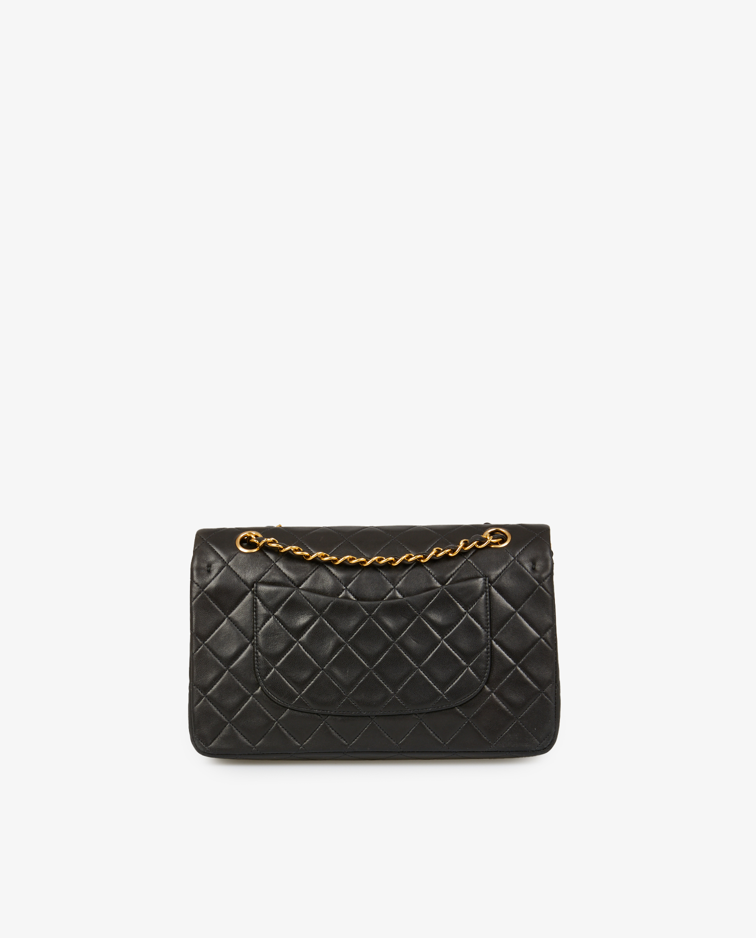 Classic vintage Chanel flap bag in black lambskin. Gold clasp. Double flap. Shoulder-mounted (91cm). In very good condition.