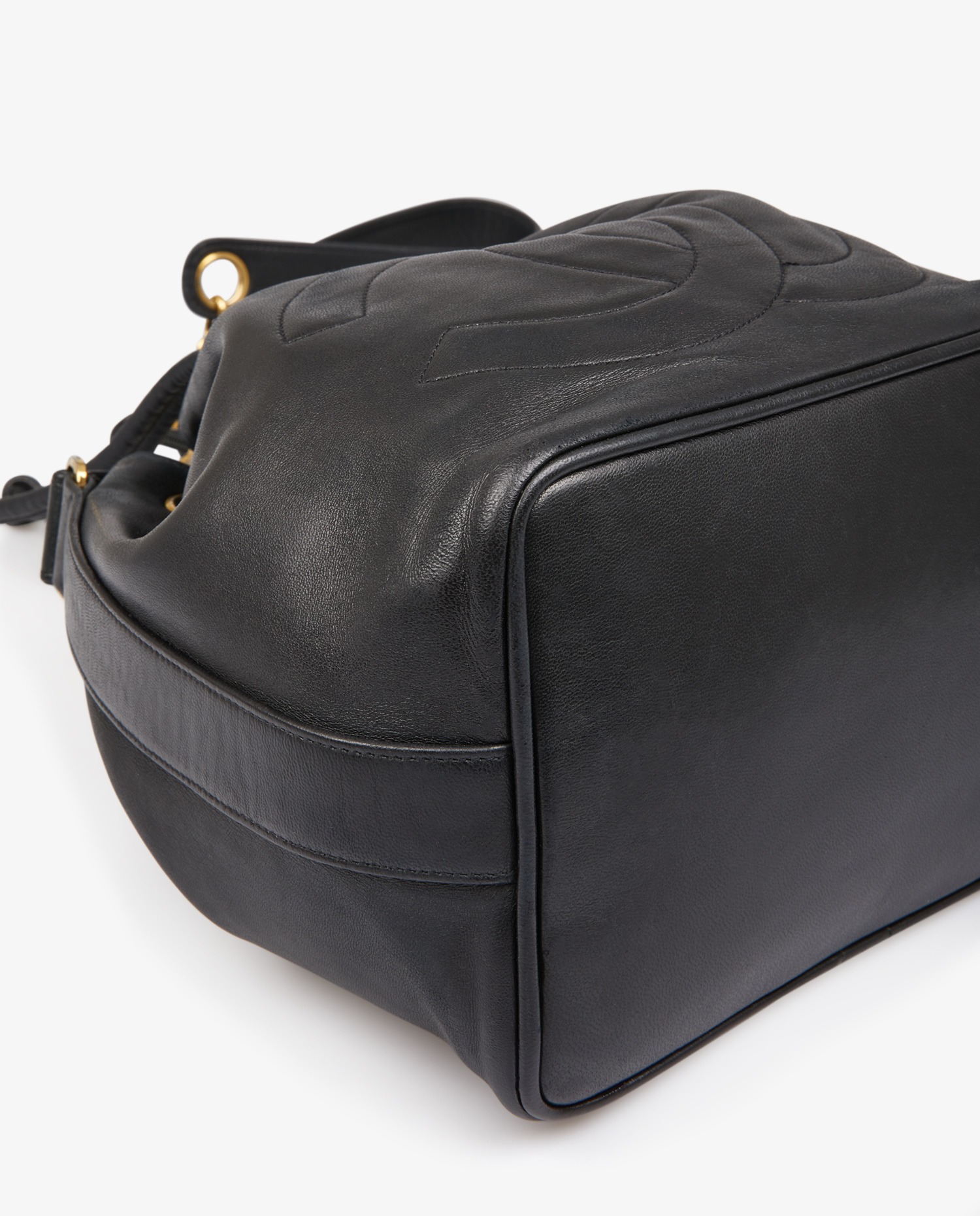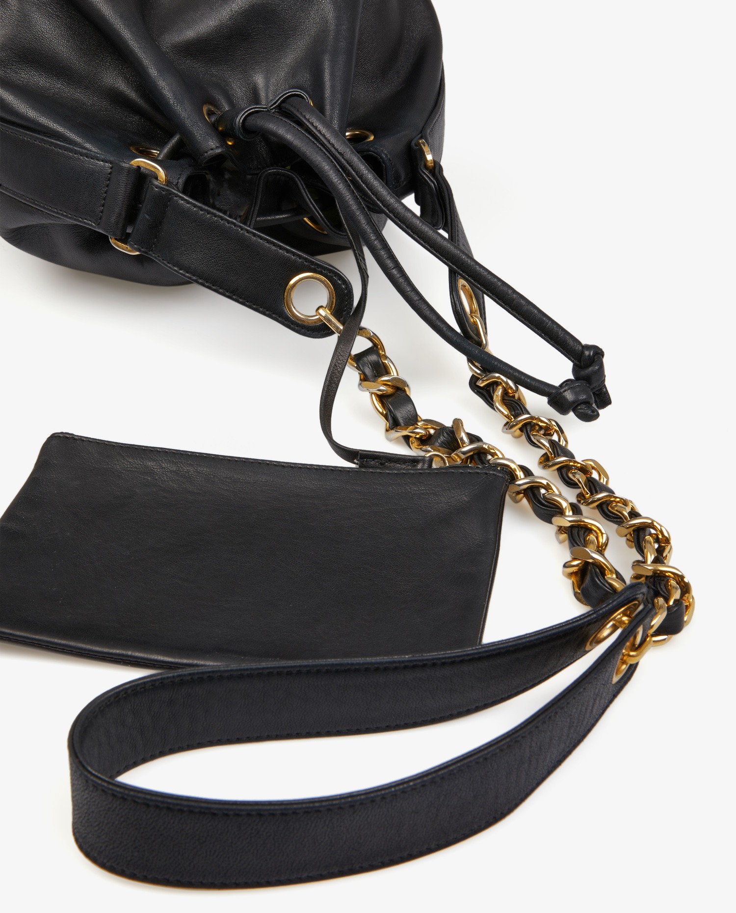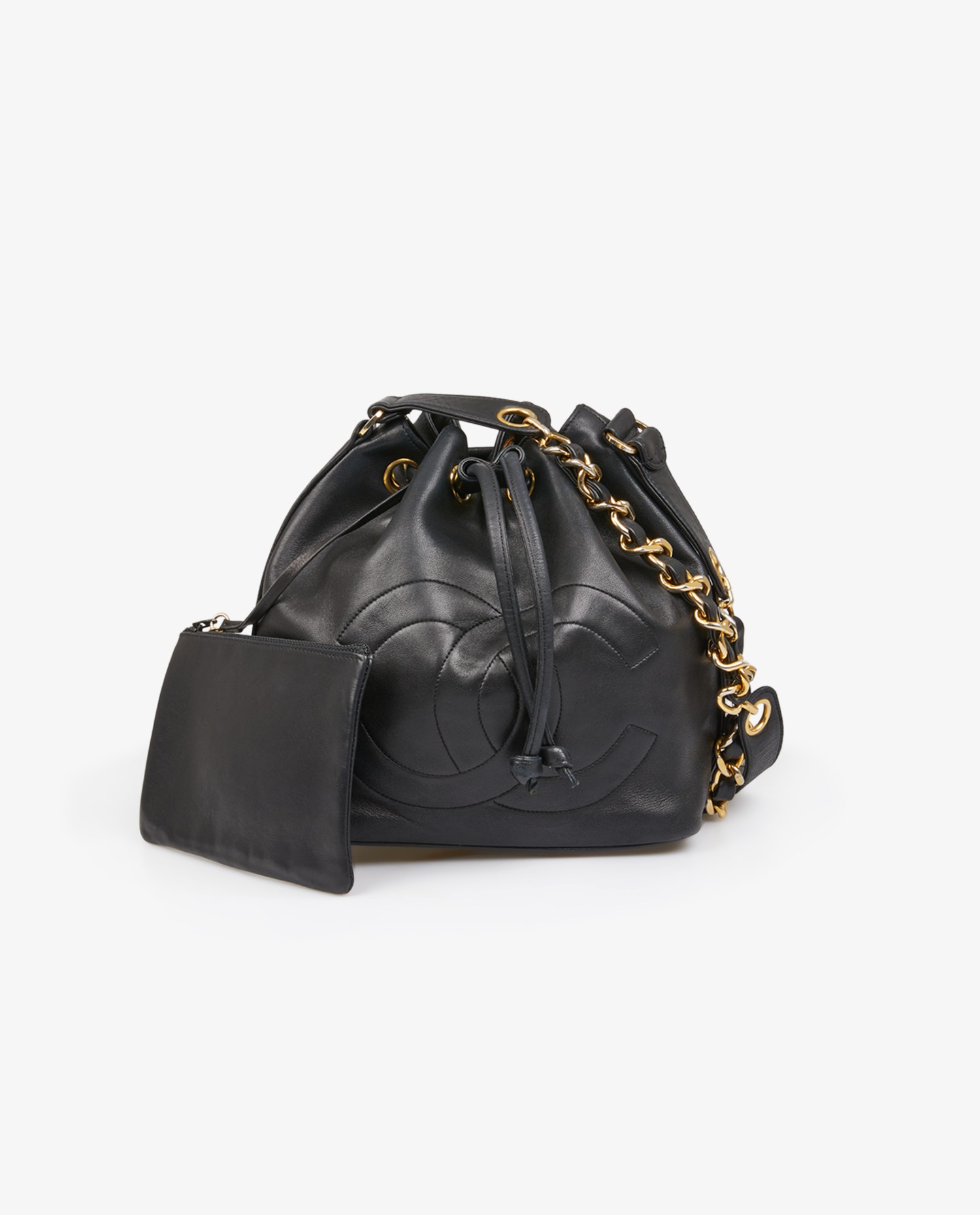 Chanel purse bag in black lambskin. Carried on the shoulder or crossbody (101 cm). Leather tie closure. In very good condition.