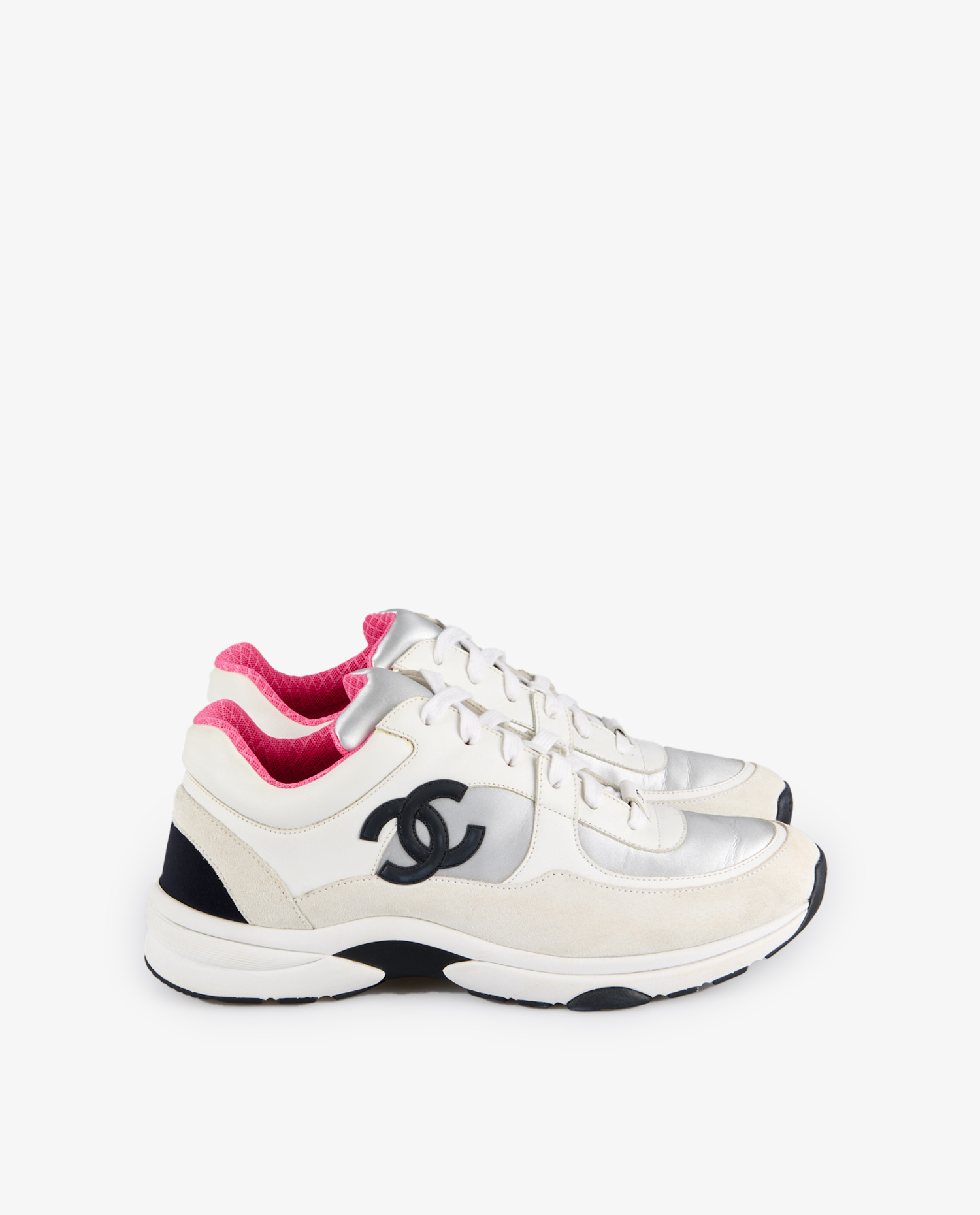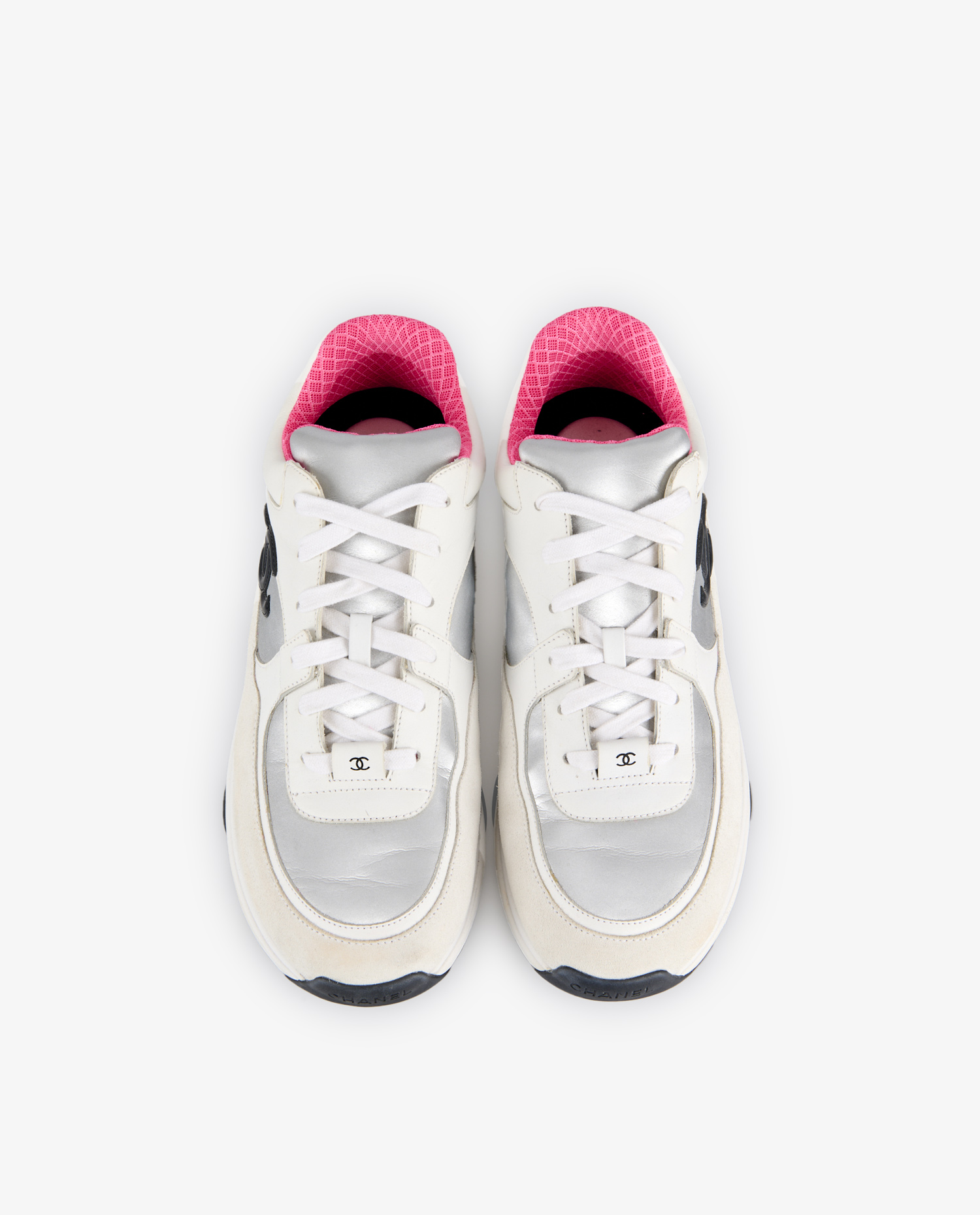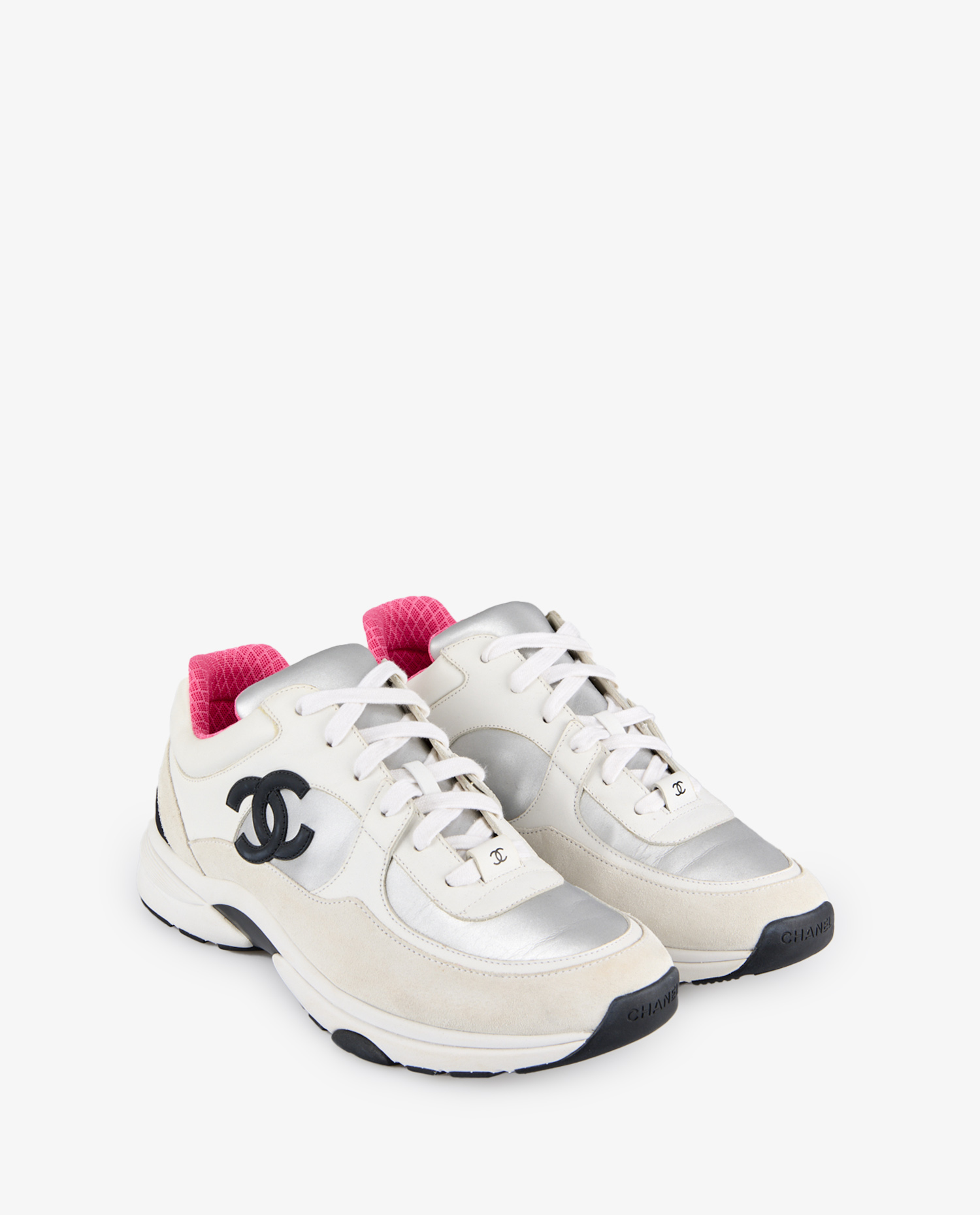 The upper is composed of smooth white leather, cream suede panels and silver metallic elements adding a futuristic touch. The Chanel logo in black gum is prominently embossed on the sides. The collar is lined with fuchsia-pink fabric in a textured geometric pattern, contrasting with the shoe’s overall sobriety. The black and white rubber outsole, marked with the double C, has a thick, notched profile, designed for grip and comfort.