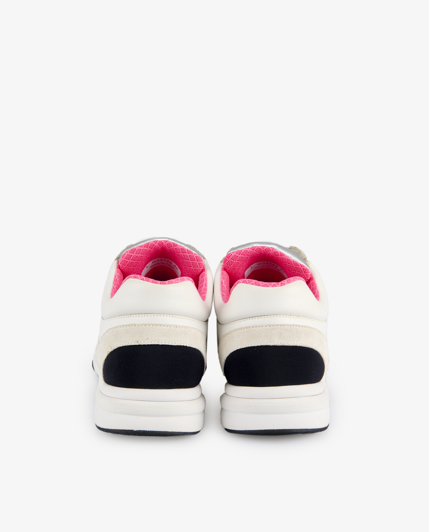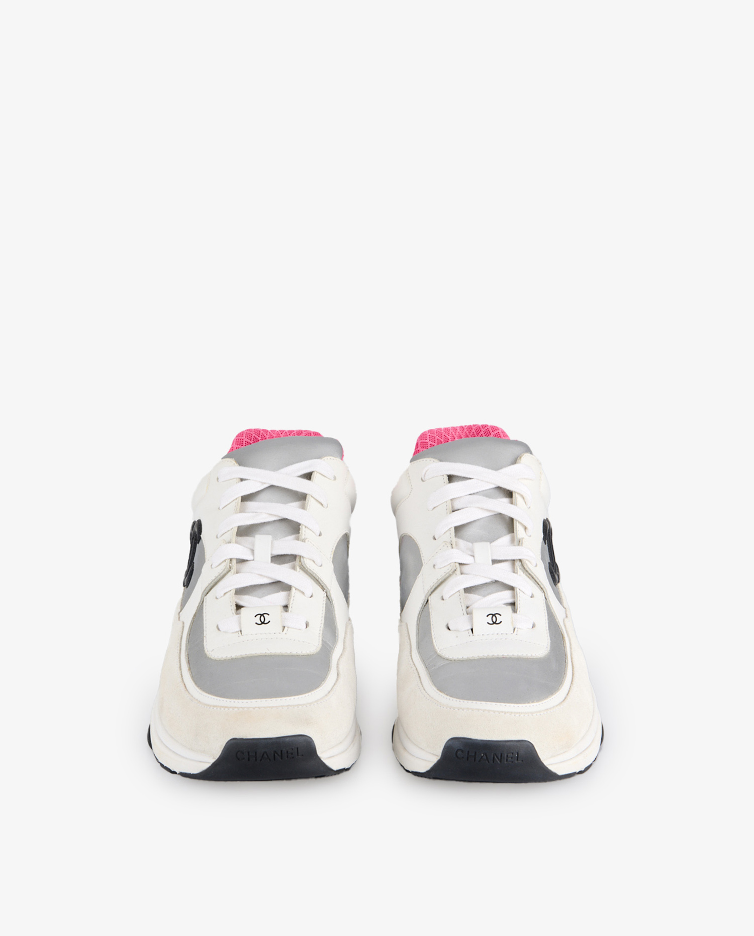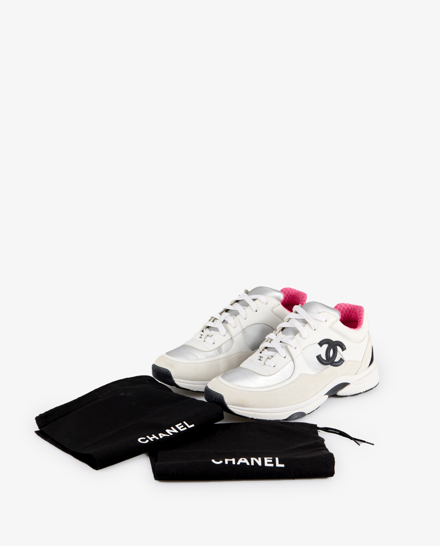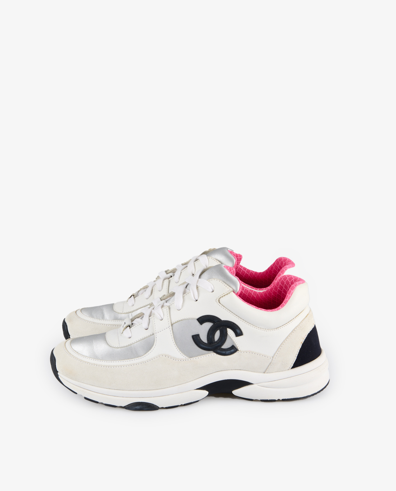 The upper is composed of smooth white leather, cream suede panels and silver metallic elements adding a futuristic touch. The Chanel logo in black gum is prominently embossed on the sides. The collar is lined with fuchsia-pink fabric in a textured geometric pattern, contrasting with the shoe’s overall sobriety. The black and white rubber outsole, marked with the double C, has a thick, notched profile, designed for grip and comfort.
