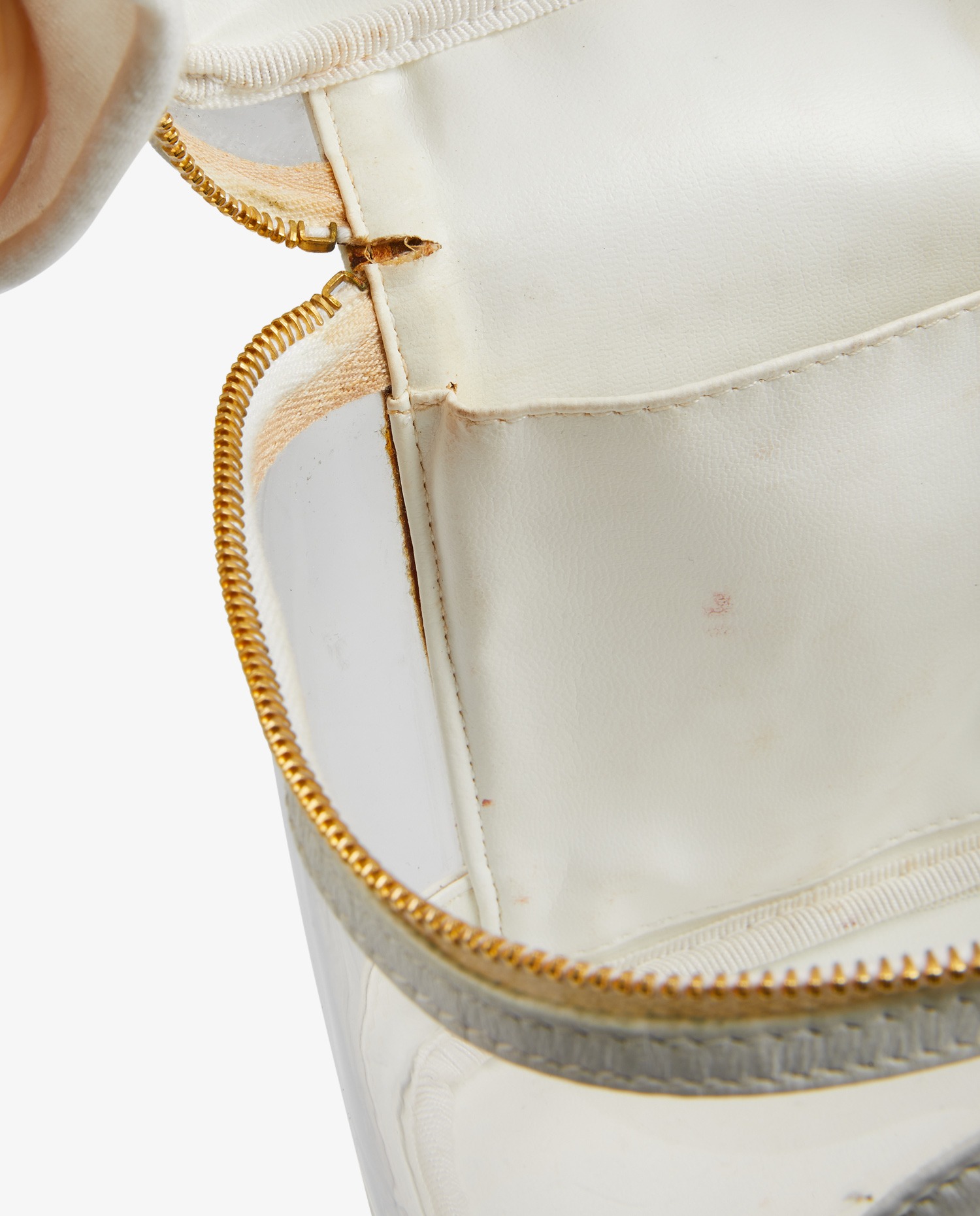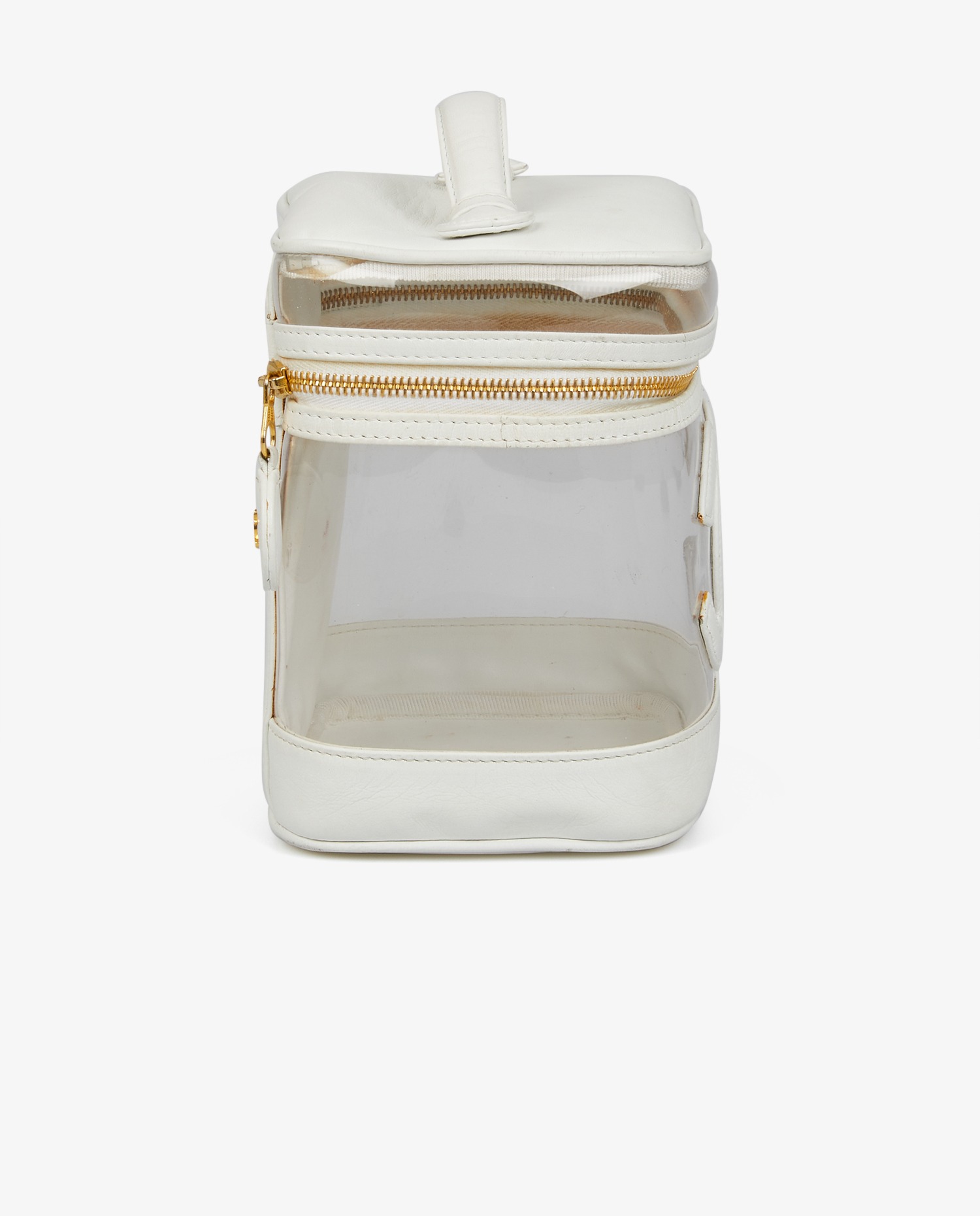 Small Chanel vanity case in white leather and Plexiglas. Zipper closure. Hand-carried. In good condition. A small tear inside (See photos). Some wear marks on the leather.