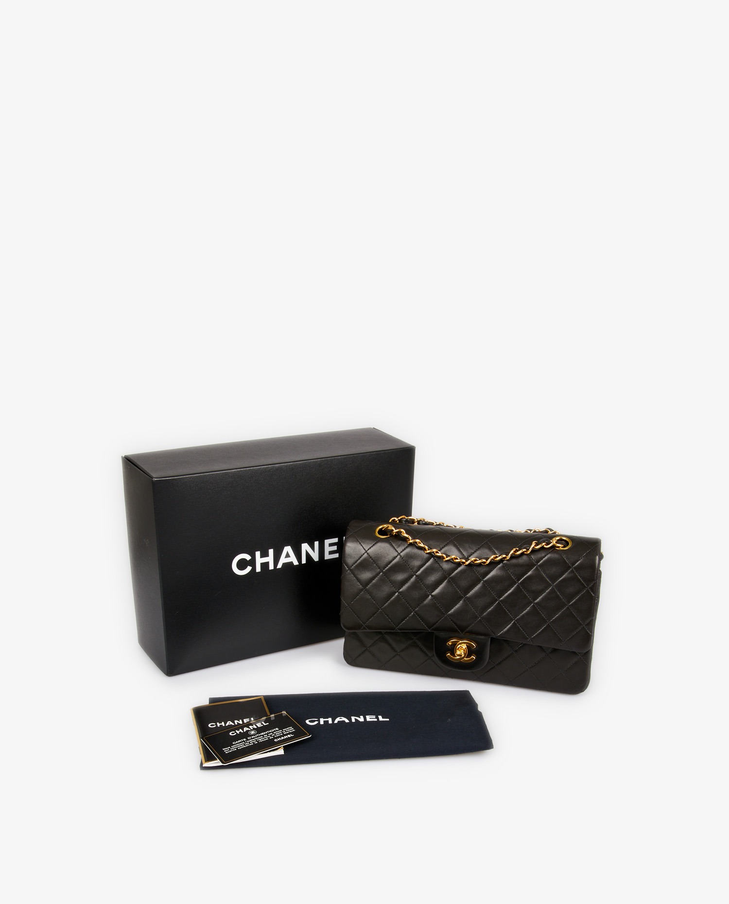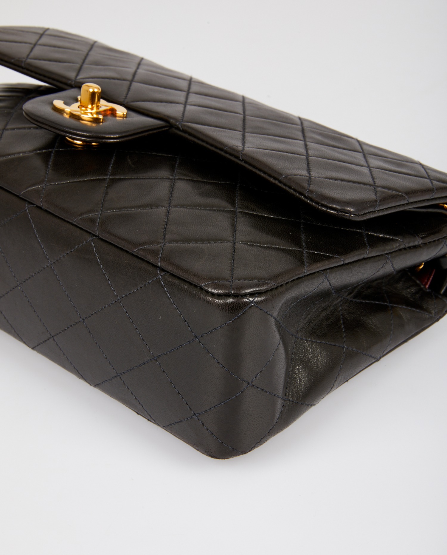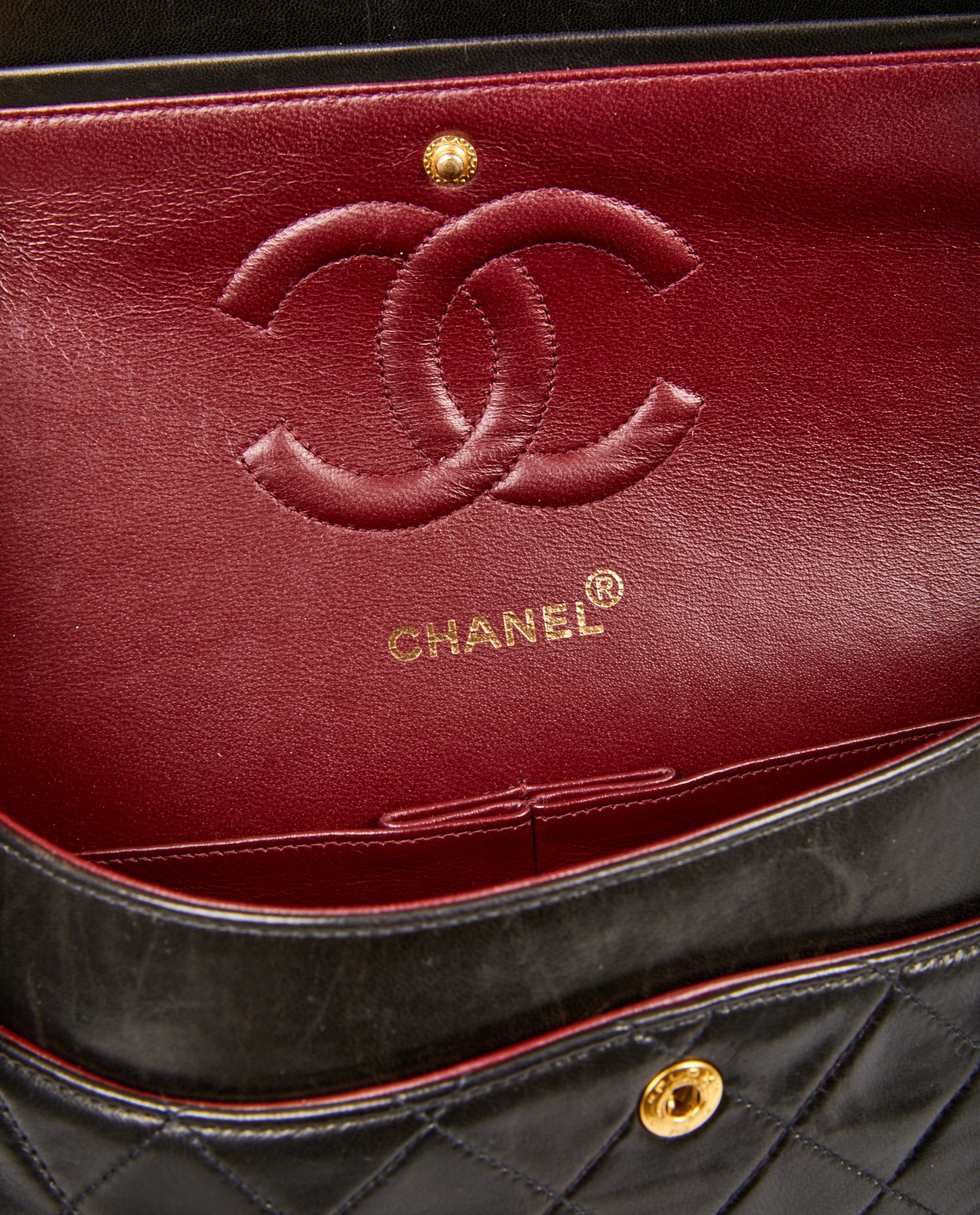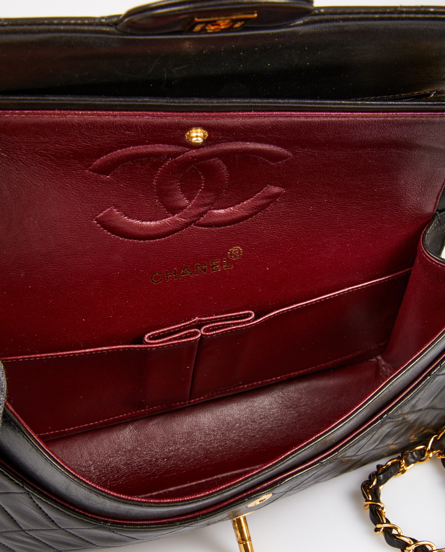 Vintage Chanel double flap in black quilted lambskin. Carried on the shoulder (88cm). Supplied with dustbag and original Chanel box. In very good condition. Some wear marks on the double flap, not visible when the bag is closed.