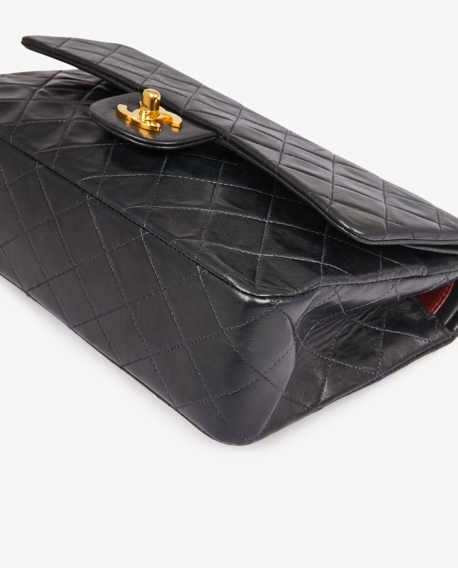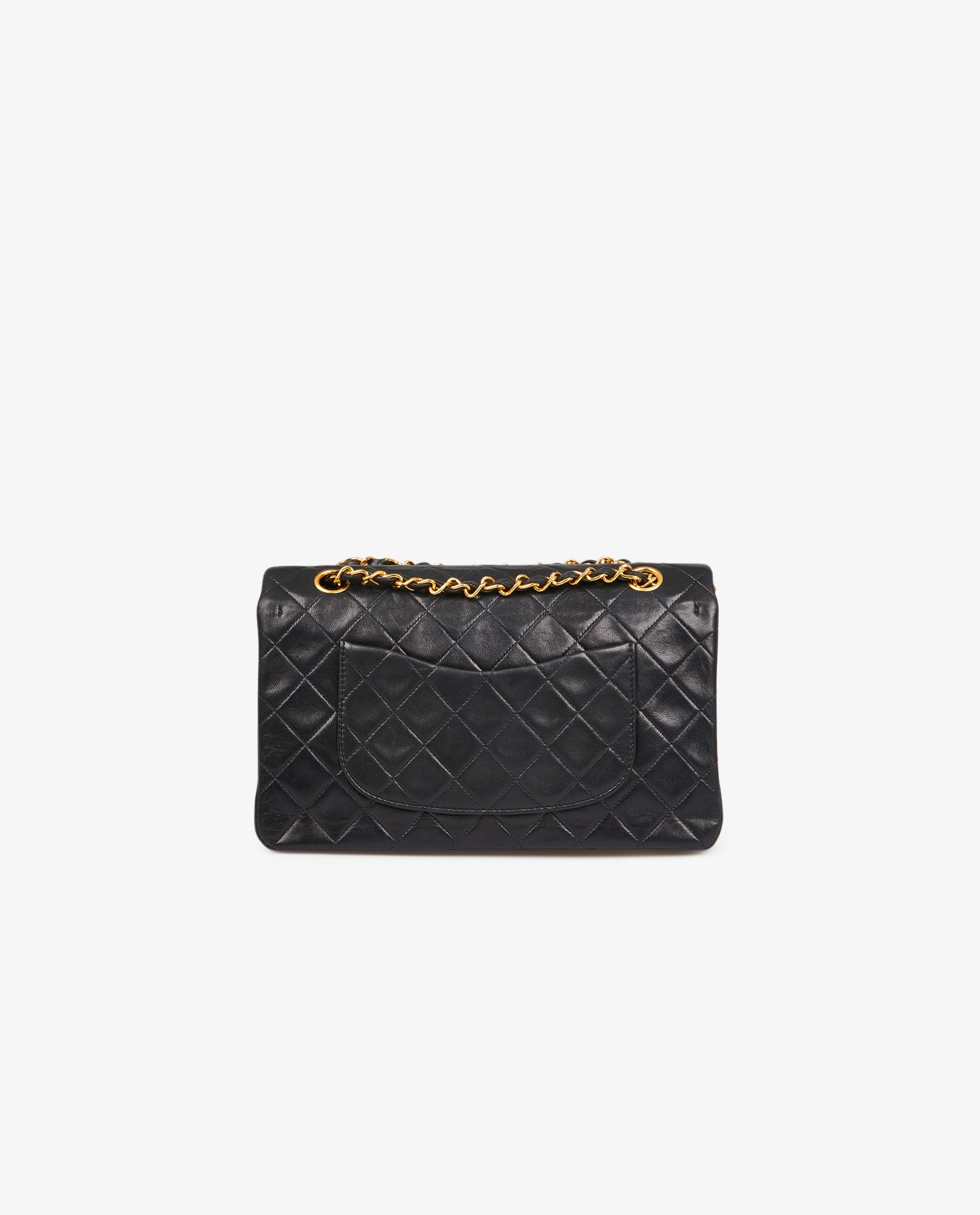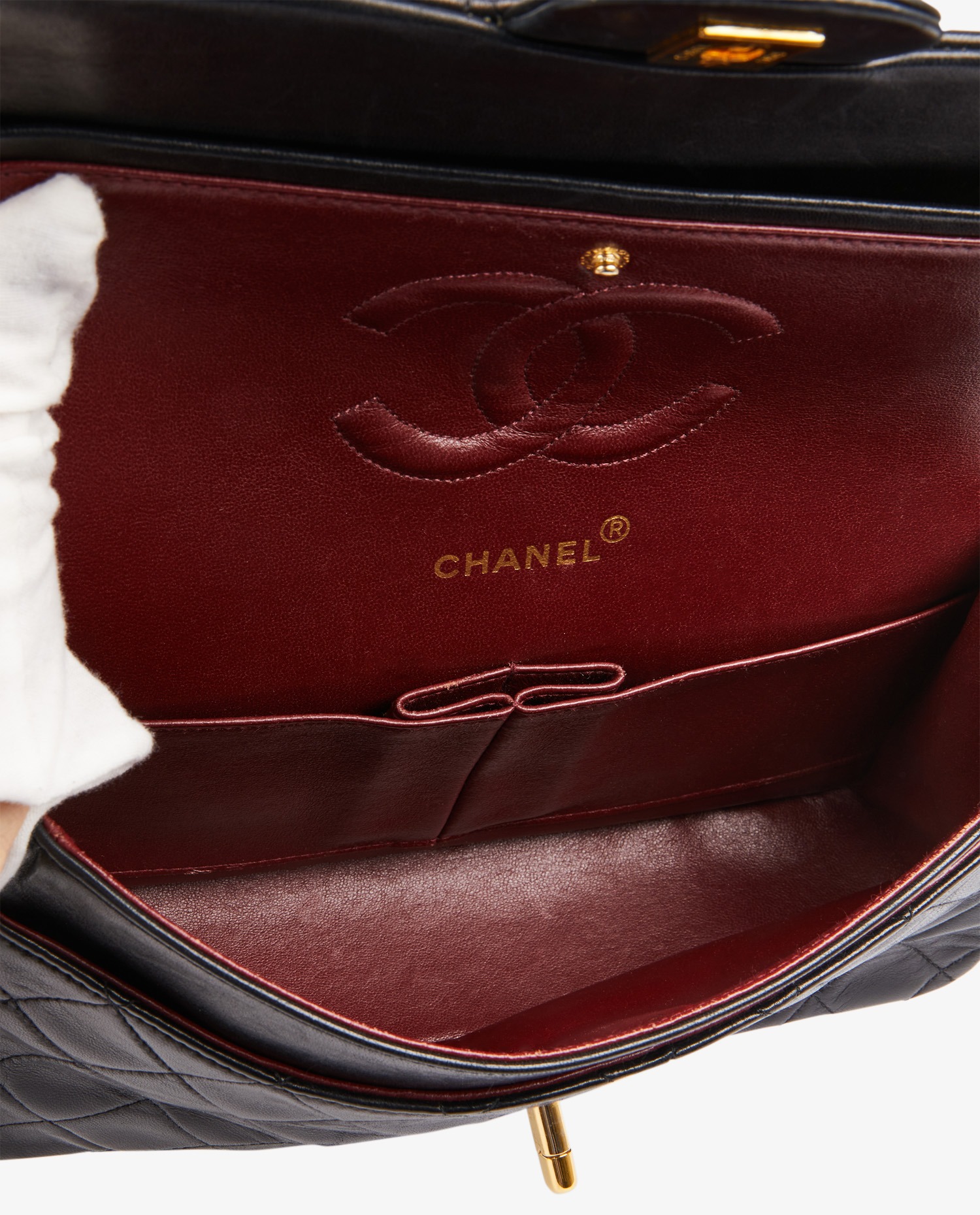Chanel medium classic in quilted black lambskin. Double flap. Golden jewelry. Clasp cc. Carried on the shoulder or crossbody. The shoulder strap measures 86cm. The hologram has come unstuck due to its advanced age. In very good condition.