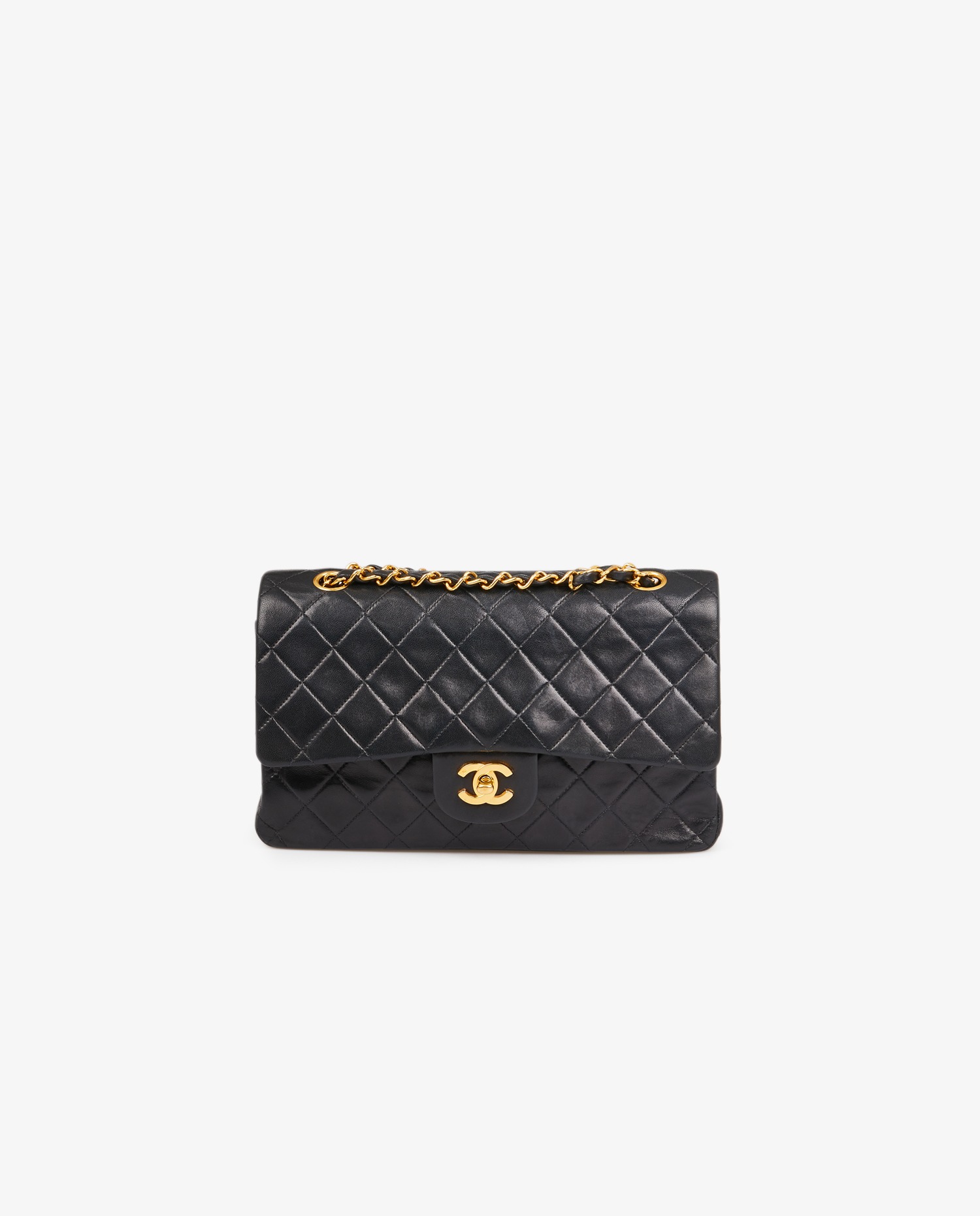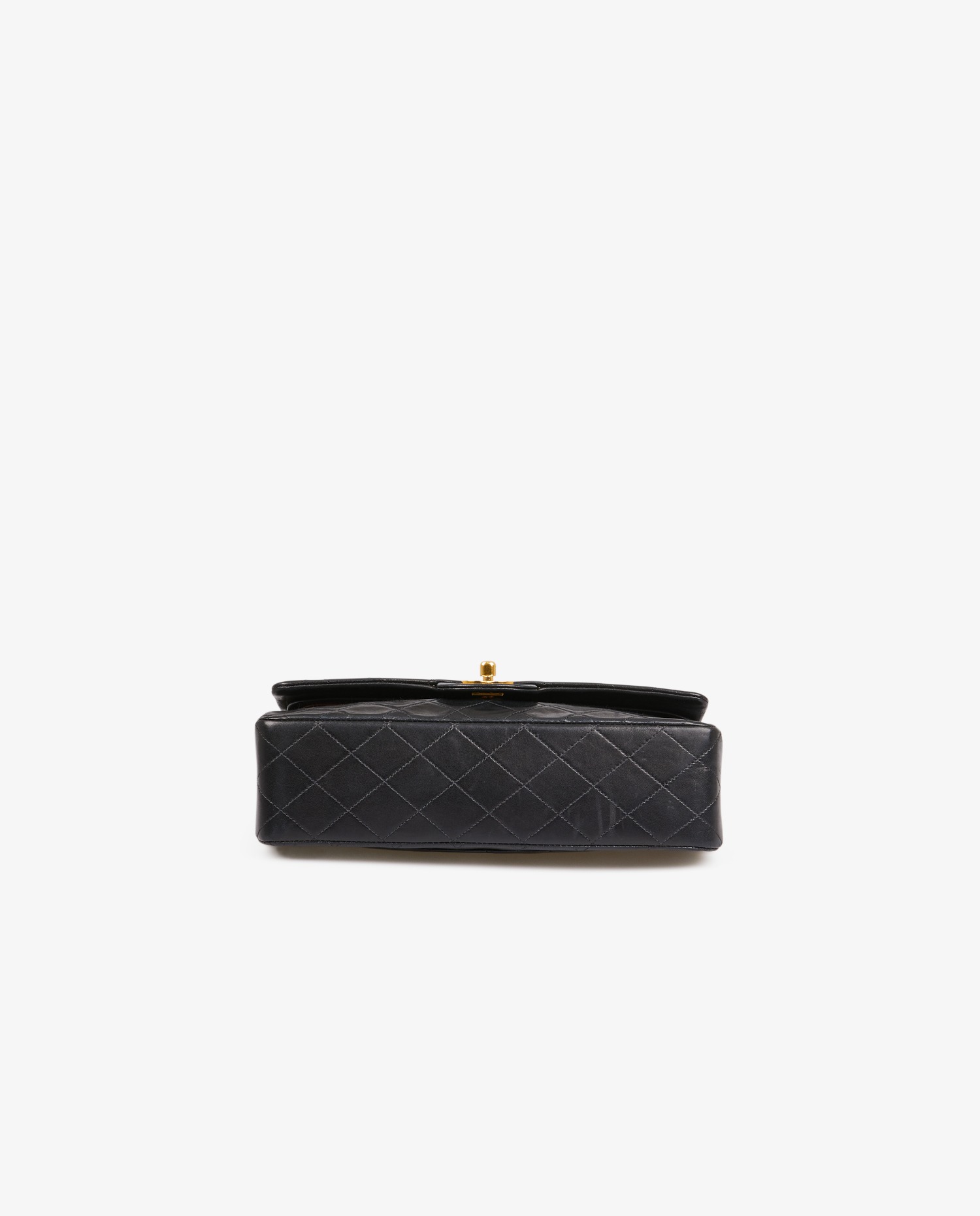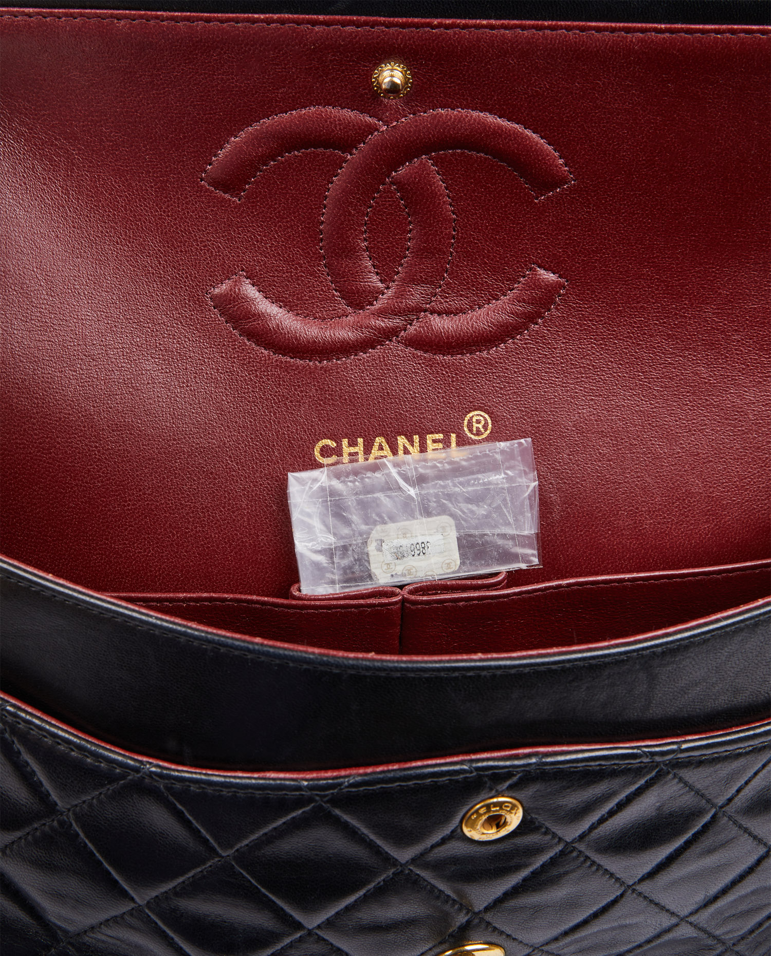 Chanel medium classic in quilted black lambskin. Double flap. Golden jewelry. Clasp cc. Carried on the shoulder or crossbody. The shoulder strap measures 86cm. The hologram has come unstuck due to its advanced age. In very good condition.