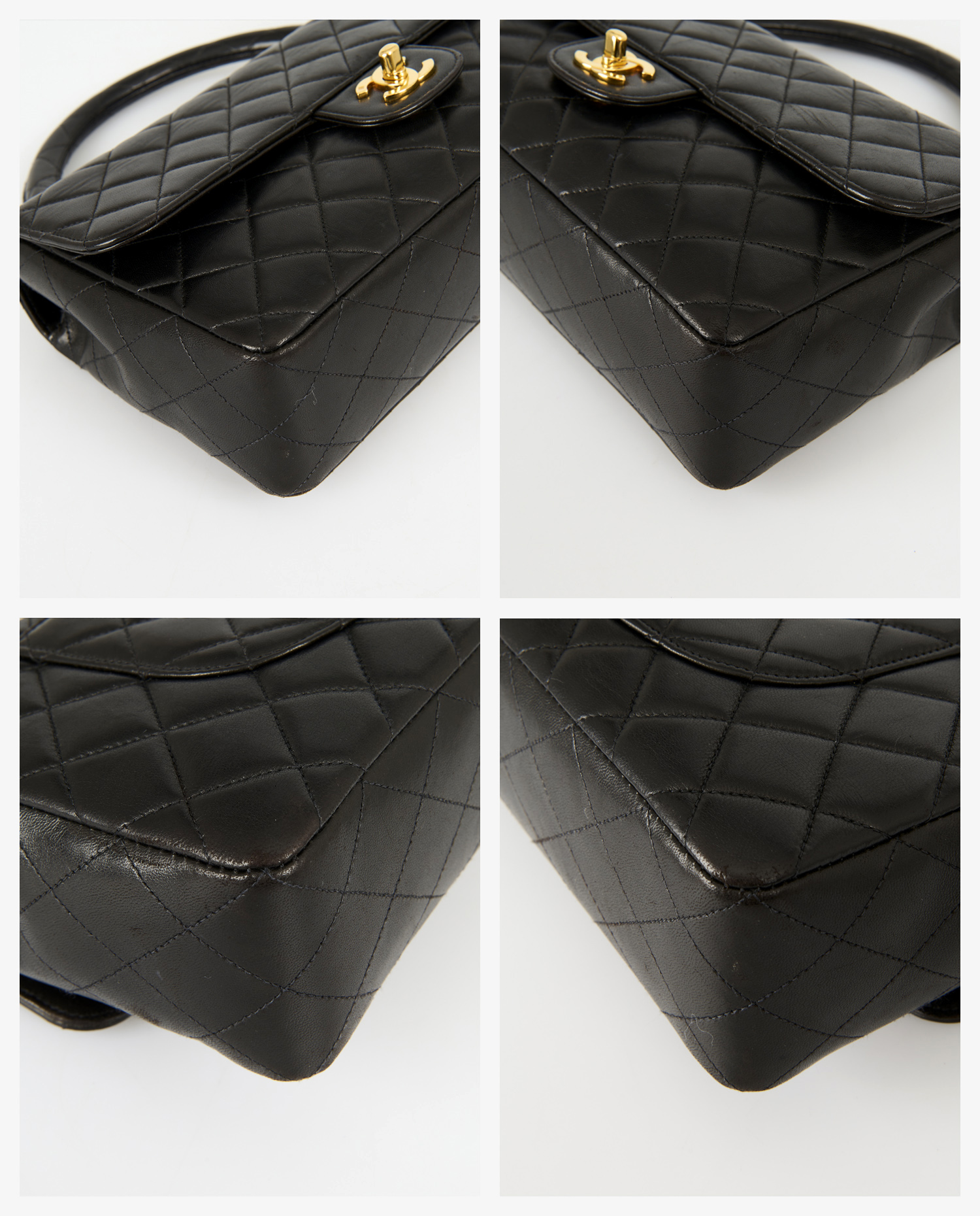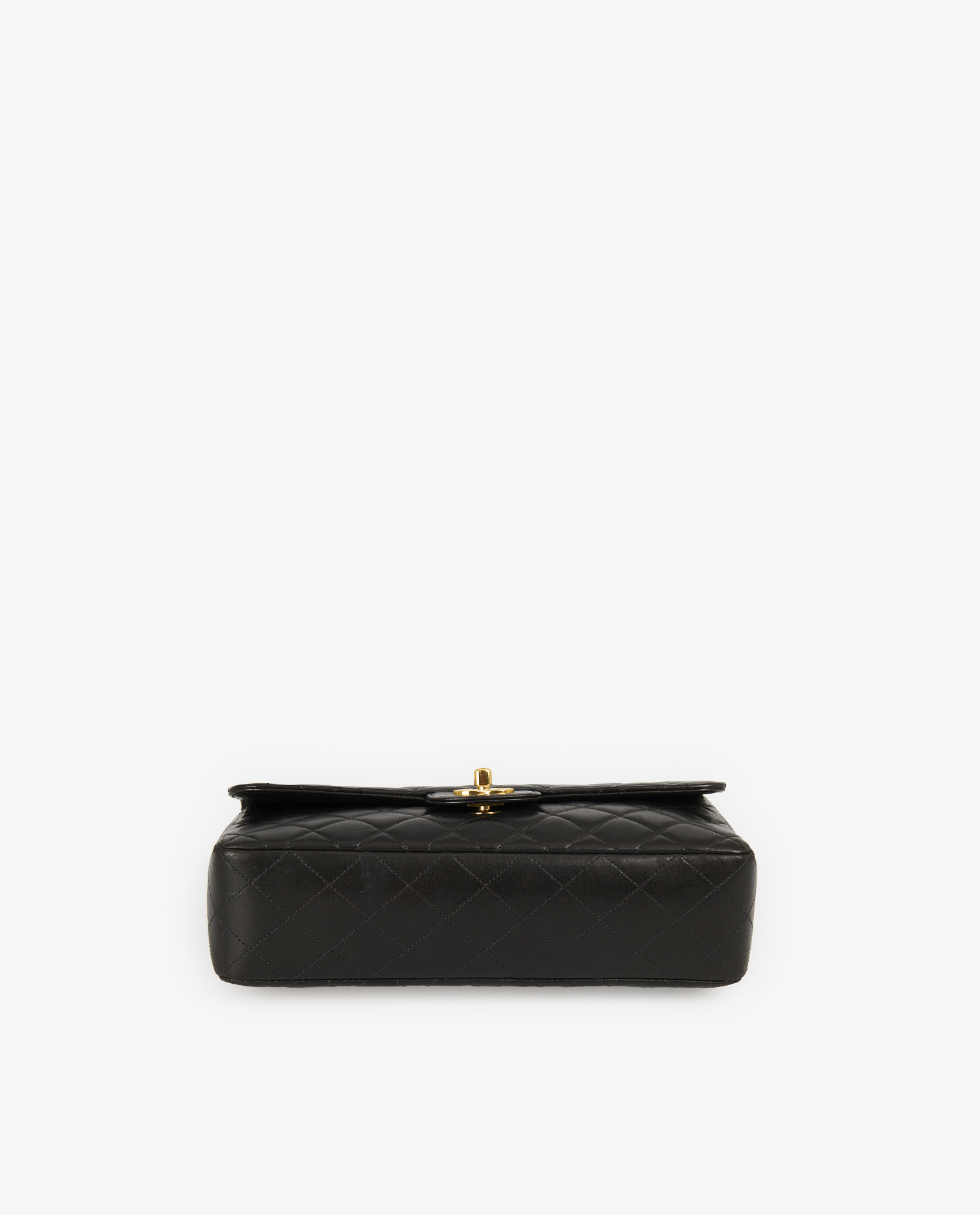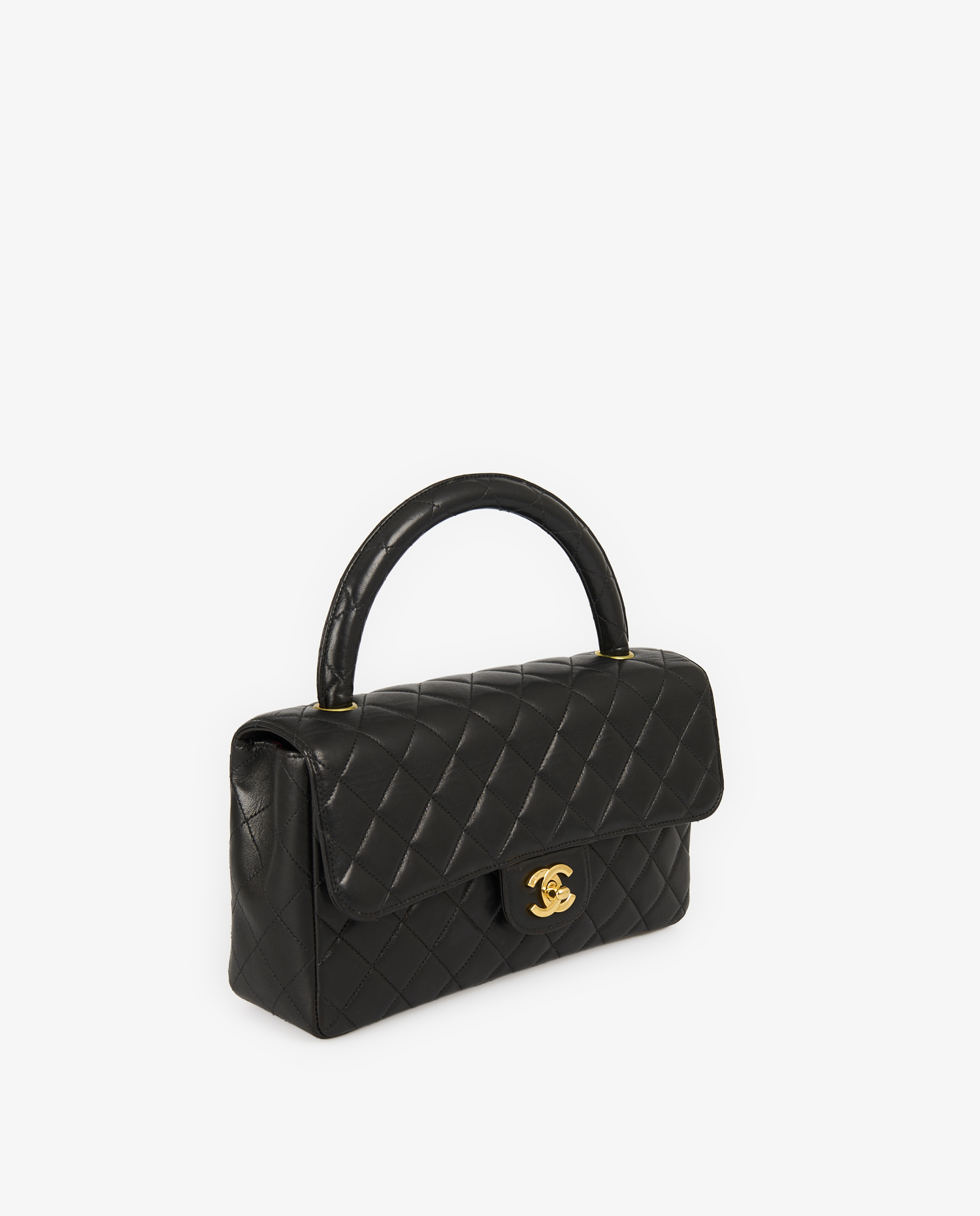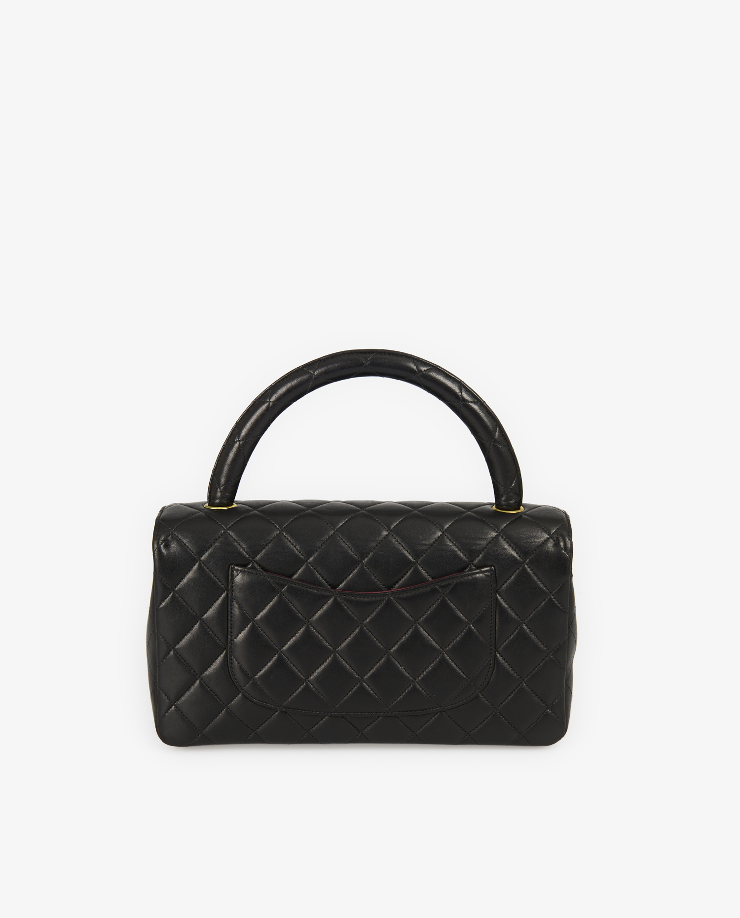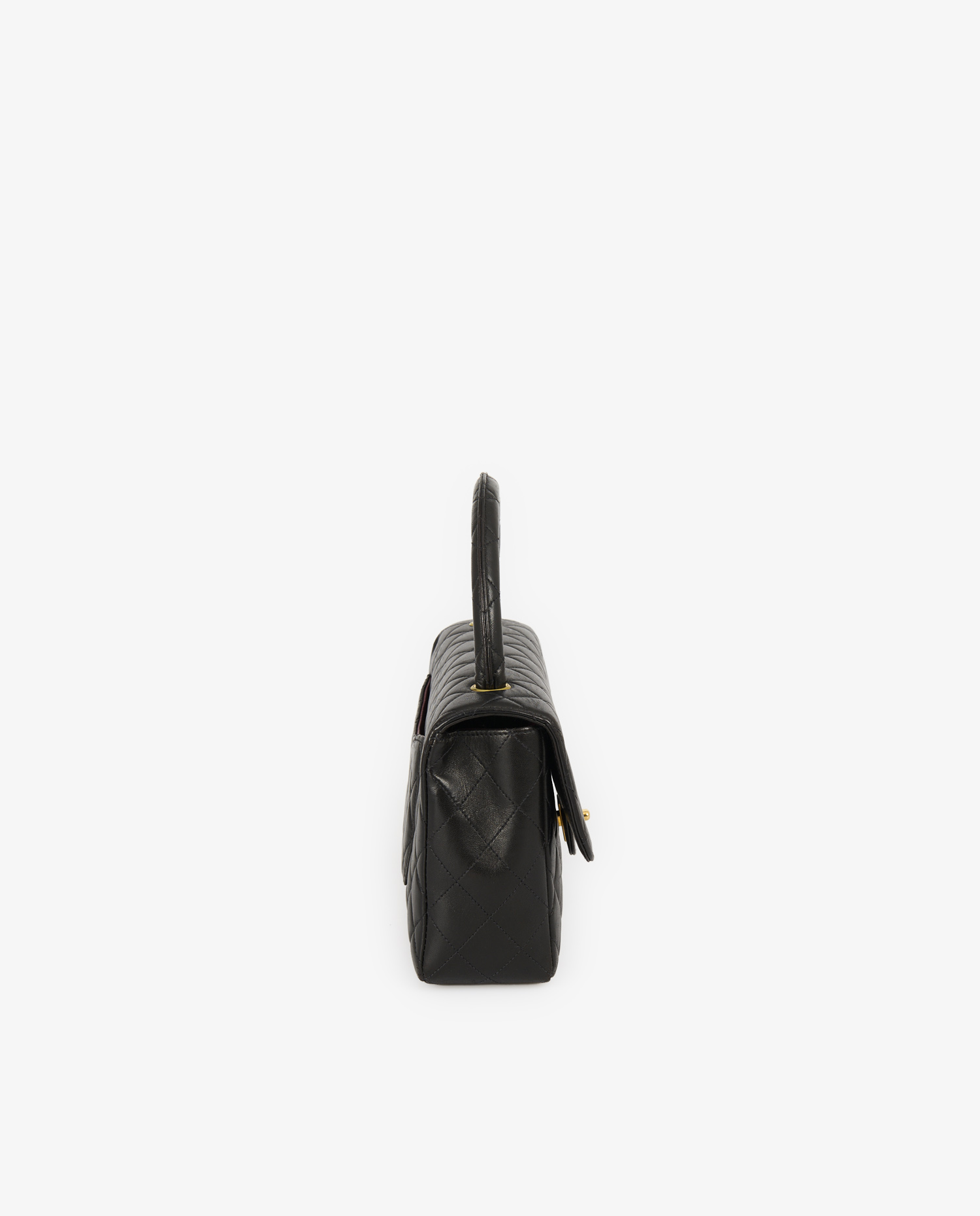 The bag is crafted in supple yet resistant black lambskin leather, with a quilted diamond pattern typical of the House of Chanel. The gilded, polished metal clasp features the brand’s iconic intertwined double C motif. The rigid handle is sheathed in tone-on-tone leather and secured by gold-plated metal rings. The bag rests on a flat base, without metal feet, and features a patch pocket on the back, practical for slipping in a small accessory or receipt.