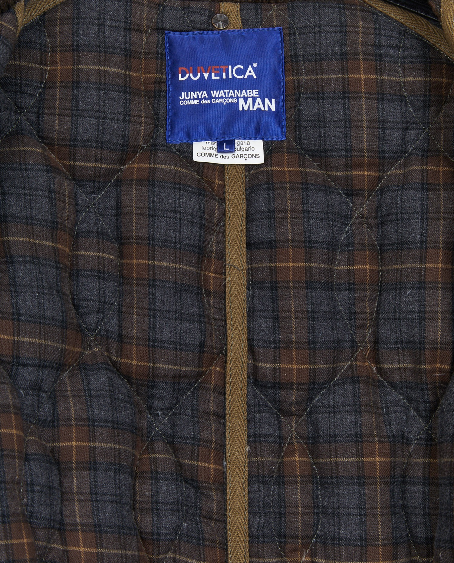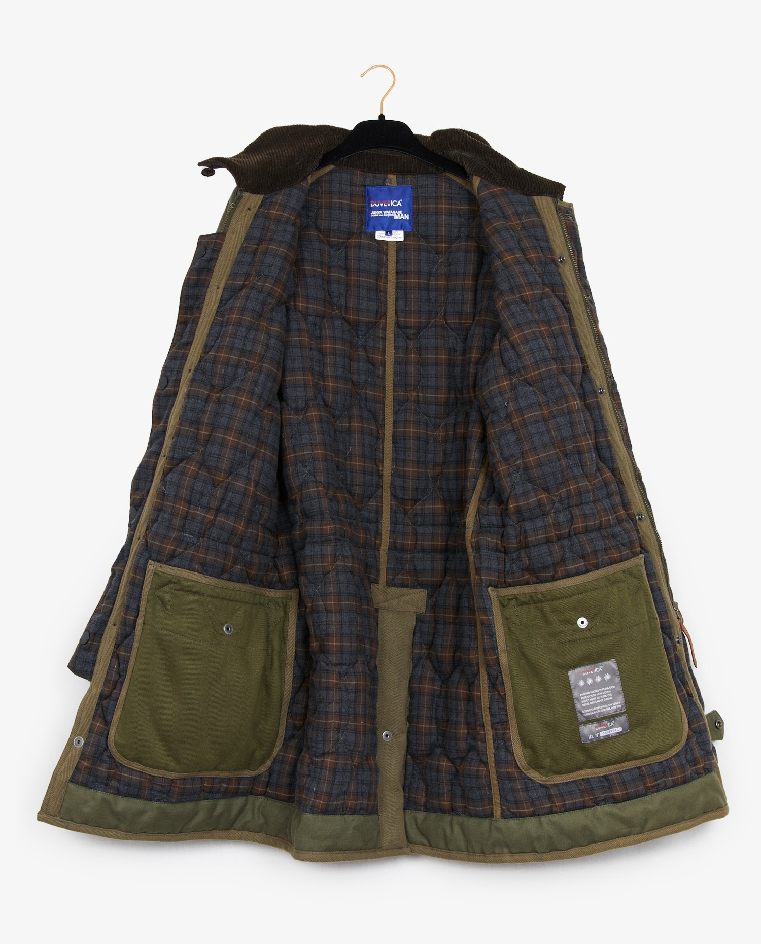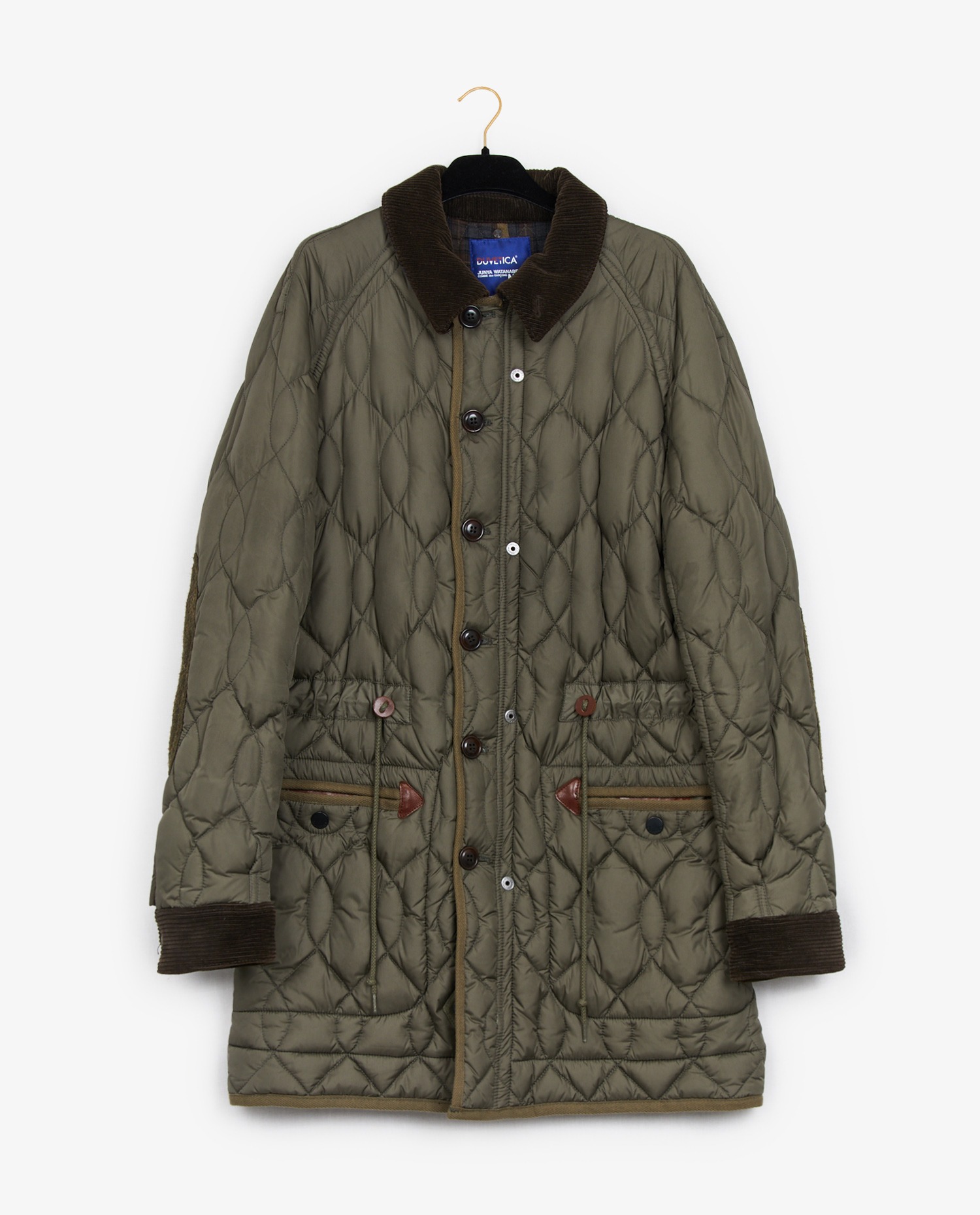 Comme des garçons long jacket by Junya Watanabe in khaki quilted canvas. Brown velvet collar. Size L. Tightened at the waist with a tie. In very good condition.