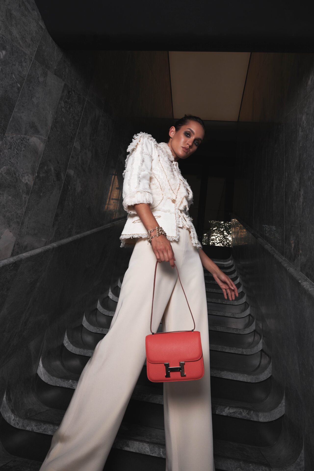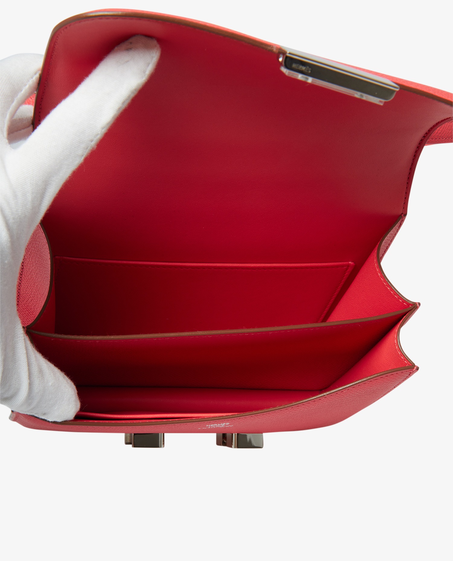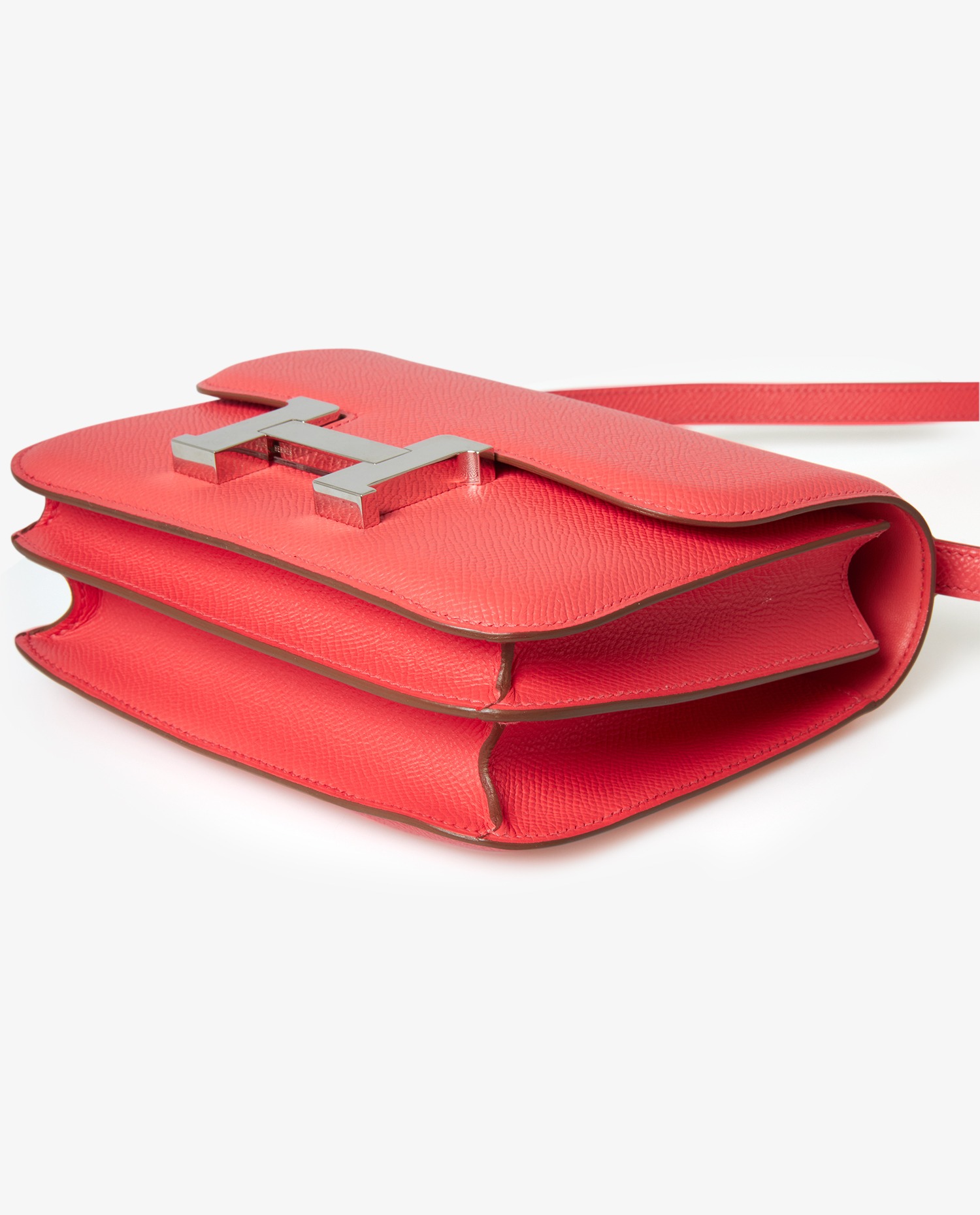Constance mini Hermes bag in Jaipur pink epsom leather. Silver jewelry. Carried on the shoulder. The shoulder strap measures 60cm. Never worn. The interior is in lambskin with two storage compartments, including two patch pockets. Delivered in a Hermès box.