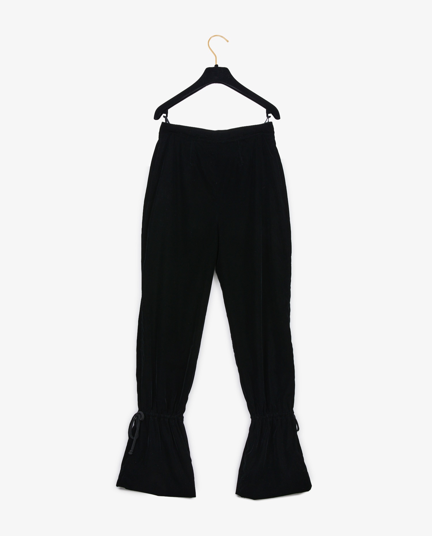 Courrèges pants in vintage black velvet. Tightened with a calf tie. Closes with a snap and zip. In very good condition.