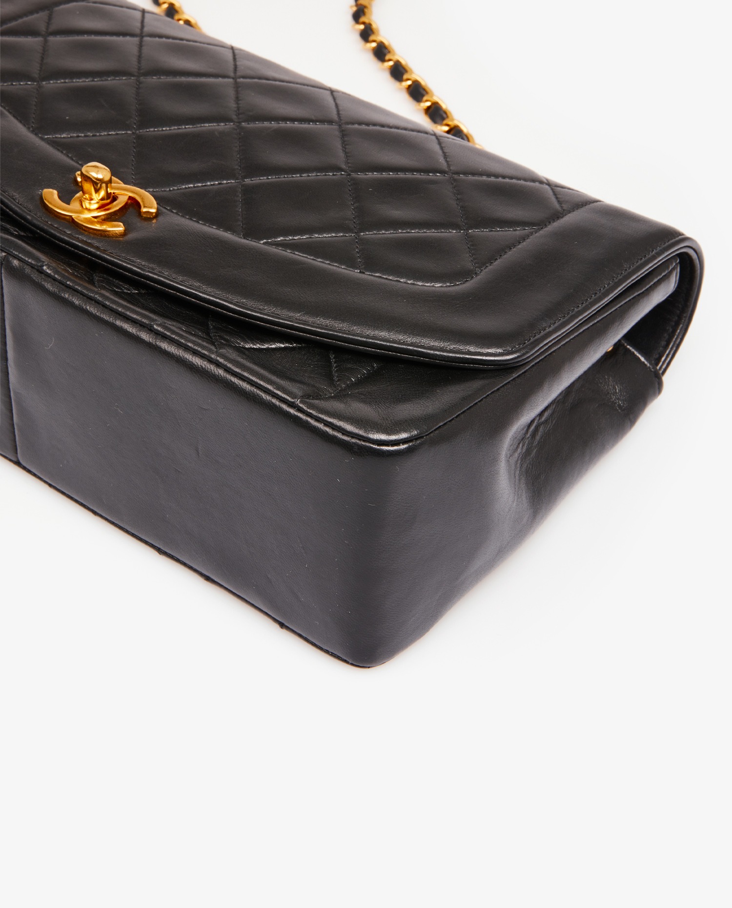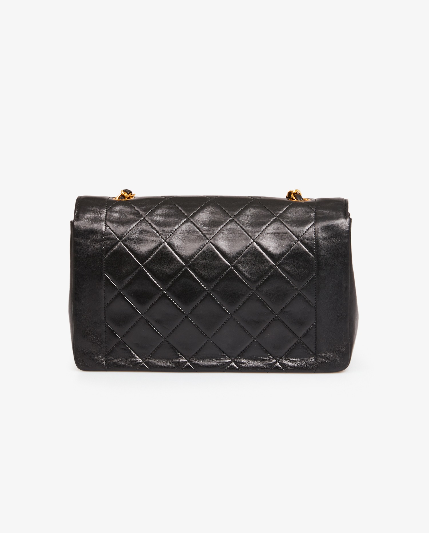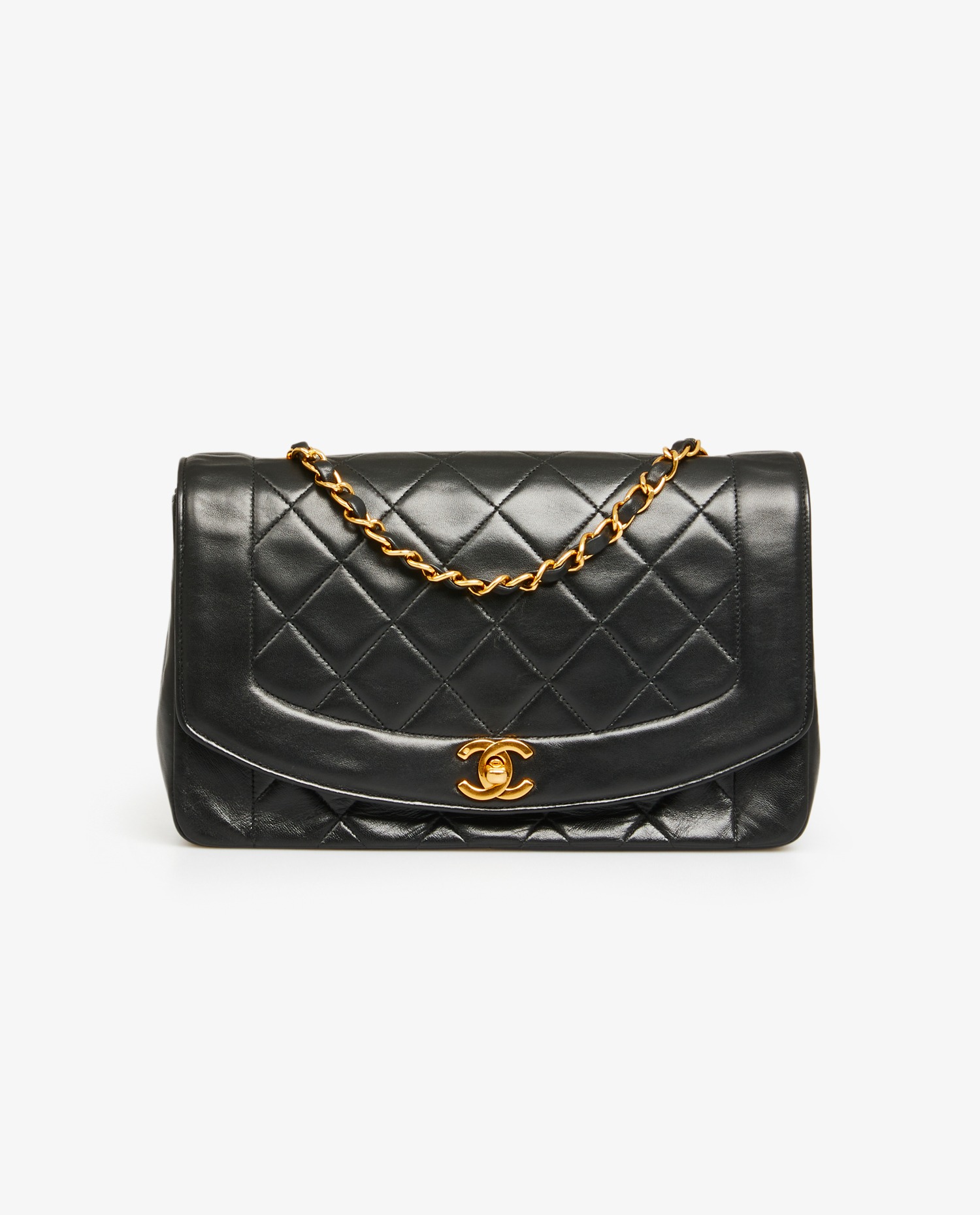 Diana Chanel bag in black quilted lambskin. CC clasp. Carried on the shoulder or crossbody. The shoulder strap measures 109cm. In very good condition.
