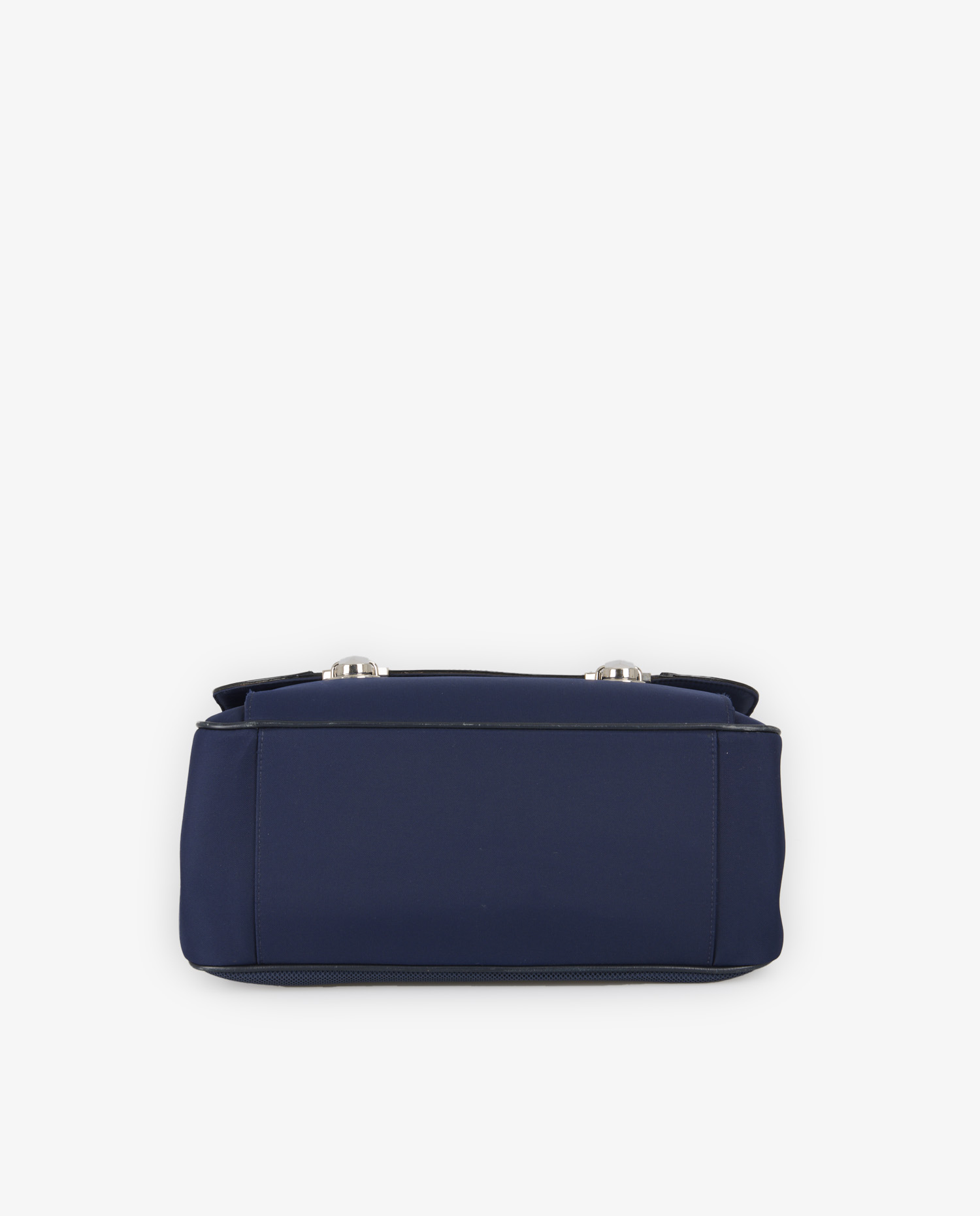 The bag features a blue Oblique printed canvas on the flap, framed by smooth navy blue leather trim on the corners and edges. The base of the bag, as well as its main body, is crafted in deep blue technical nylon, offering strength and lightness. Two metal clasps with chrome clips ensure closure, reinforcing the vintage satchel inspiration. At the back, two wide, adjustable straps in black webbing ensure comfortable carrying, while a rigid leather handle enables hand-carrying.