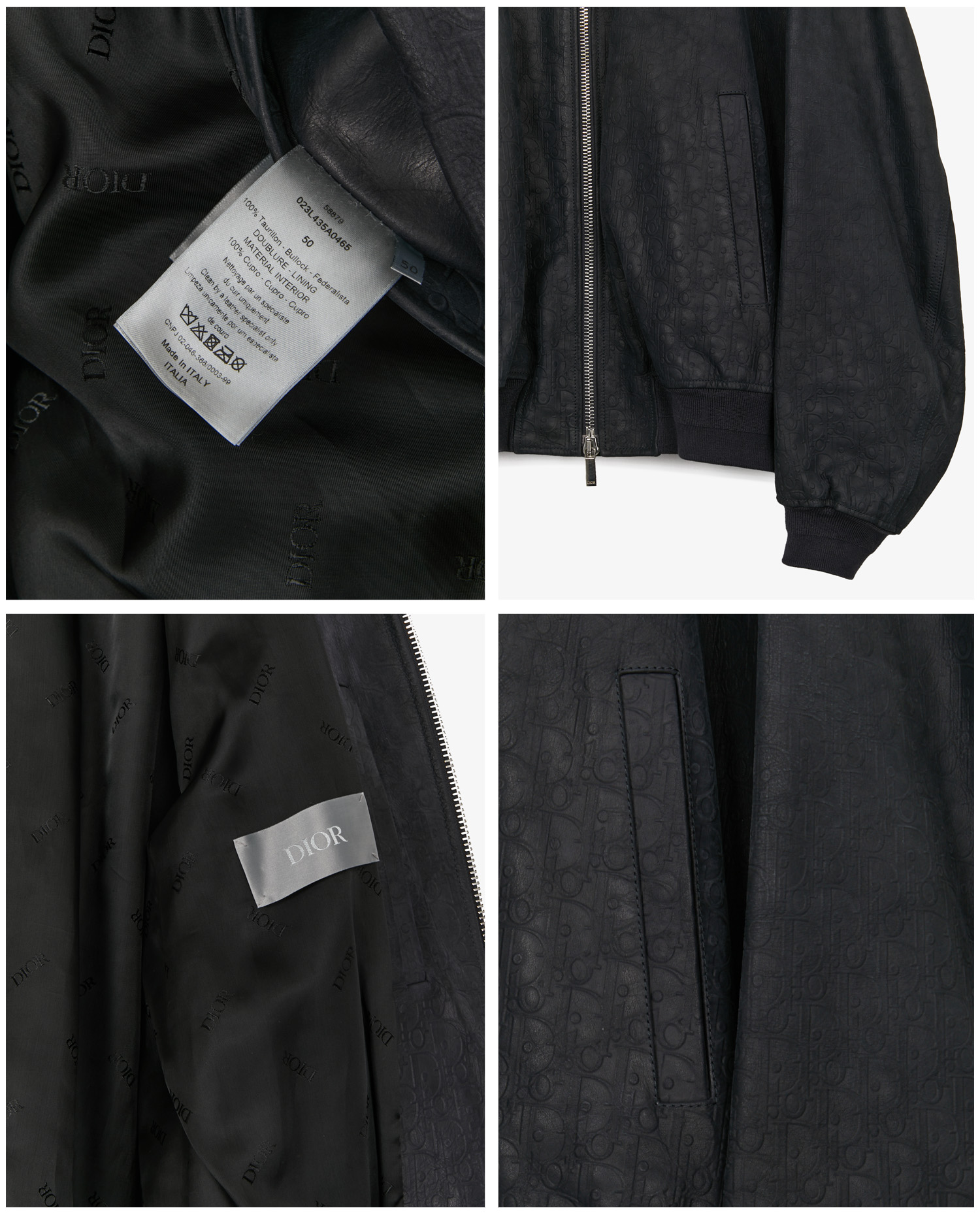 Dior bomber jacket in navy blue taurillon leather embossed with the Dior motif. It is distinguished by its meticulous finishing: two outside pockets, two inside pockets, silver metal zipper with the Dior logo engraved on the pull tabs. The black cupro lining, discreetly embossed with the logo, adds a neat, recognizable touch to the jacket’s interior. Size 50. In very good condition.