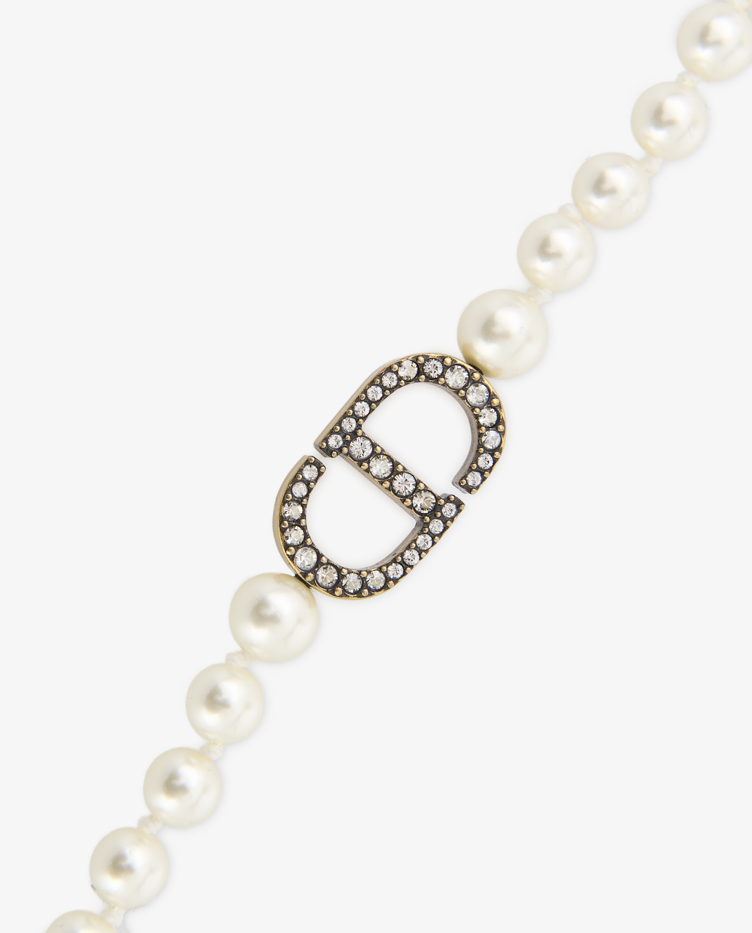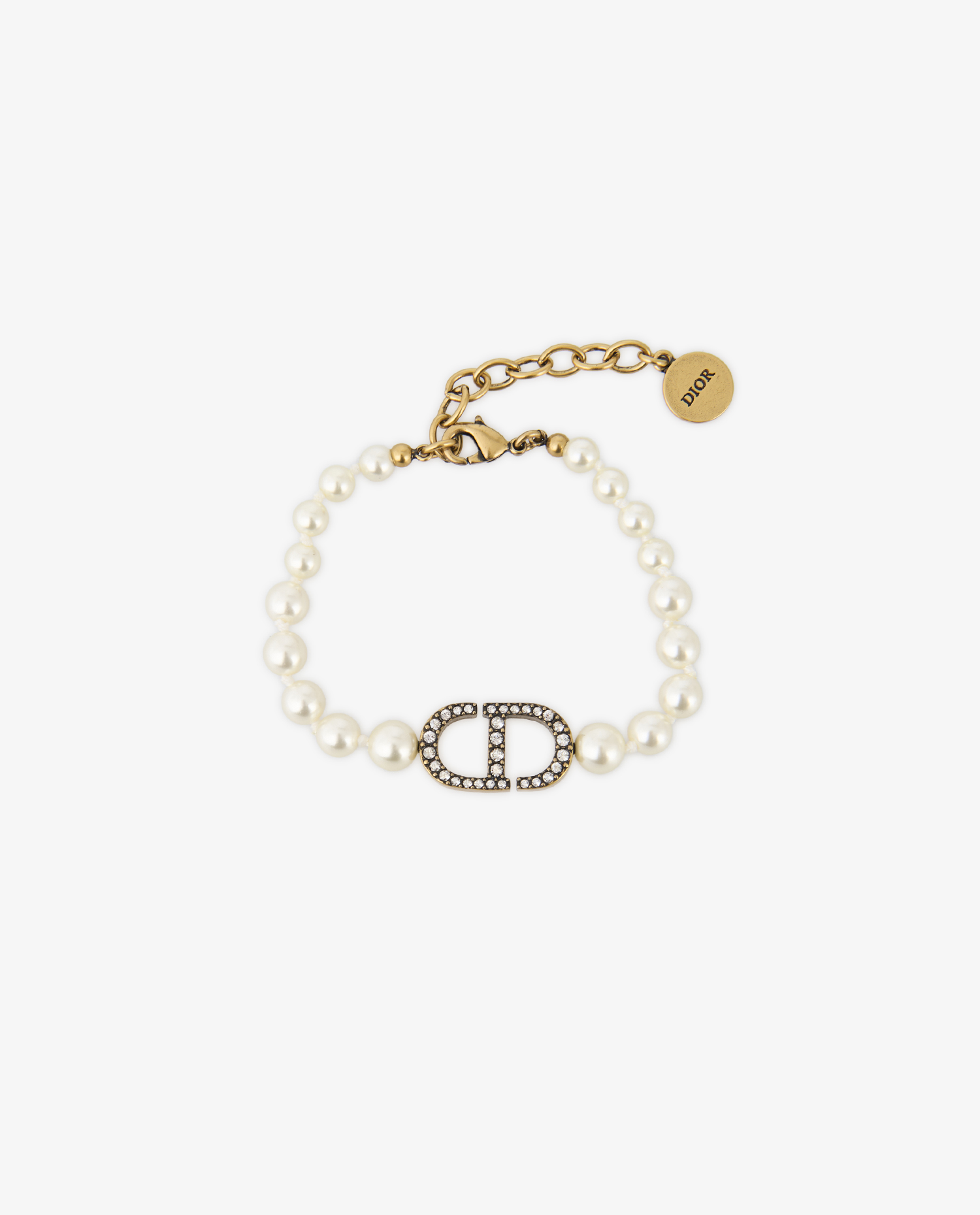 The jewel features a line of brilliant-finish white synthetic pearls, homogeneously sized, with a soft ivory hue perfectly imitating natural pearl. The central element consists of the “CD” logo in patinated gold metal, enhanced by clear crystals set into it, creating a luminous effect without excess. The gold-plated extension chain provides a precise fit around the wrist, while the lobster clasp ensures a reliable hold. The engraved “DIOR” medallion adds a subtle, recognizable detail.