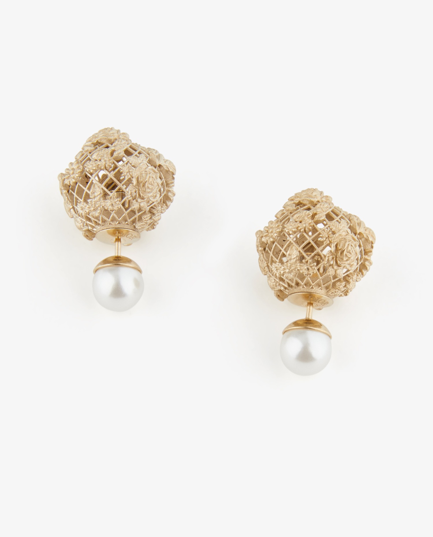Dior tribal earrings in gold-finish metal with white resin beads. Presented at the show, they are inspired by flowers to celebrate Andalusia, the Collection’s key theme. Never worn.