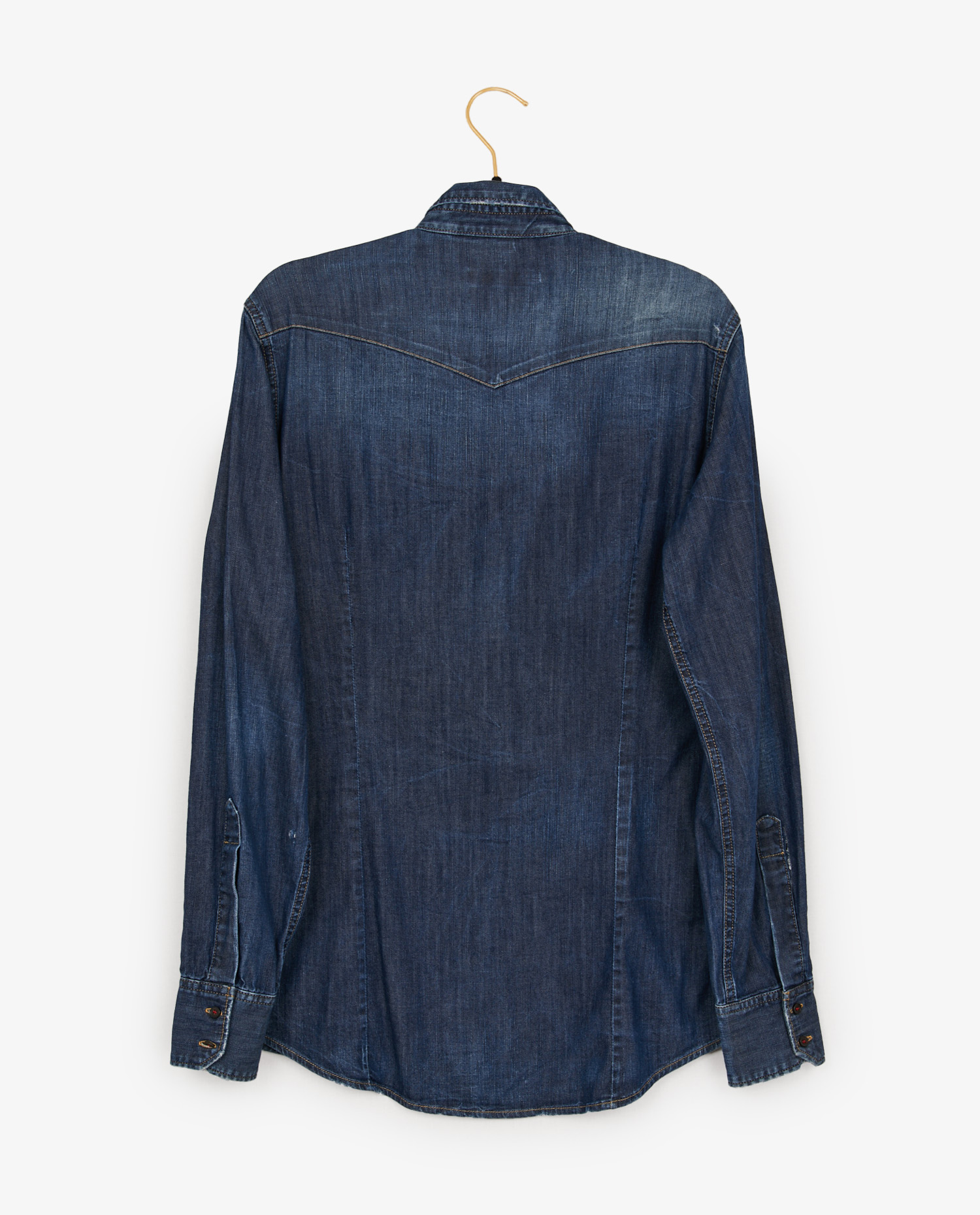 The cotton denim features a medium-blue color with a deliberate faded effect on the shoulders, elbows and pocket edges, creating a subtle contrast. Exposed seams in gold thread reinforce the shirt’s authentic character. Chest pockets with pointed flaps and metal buttons add a utilitarian touch, while the maple leaf crest recalls the company’s Canadian identity. Adjustable cuffs are fastened with double snap fasteners for added practicality.