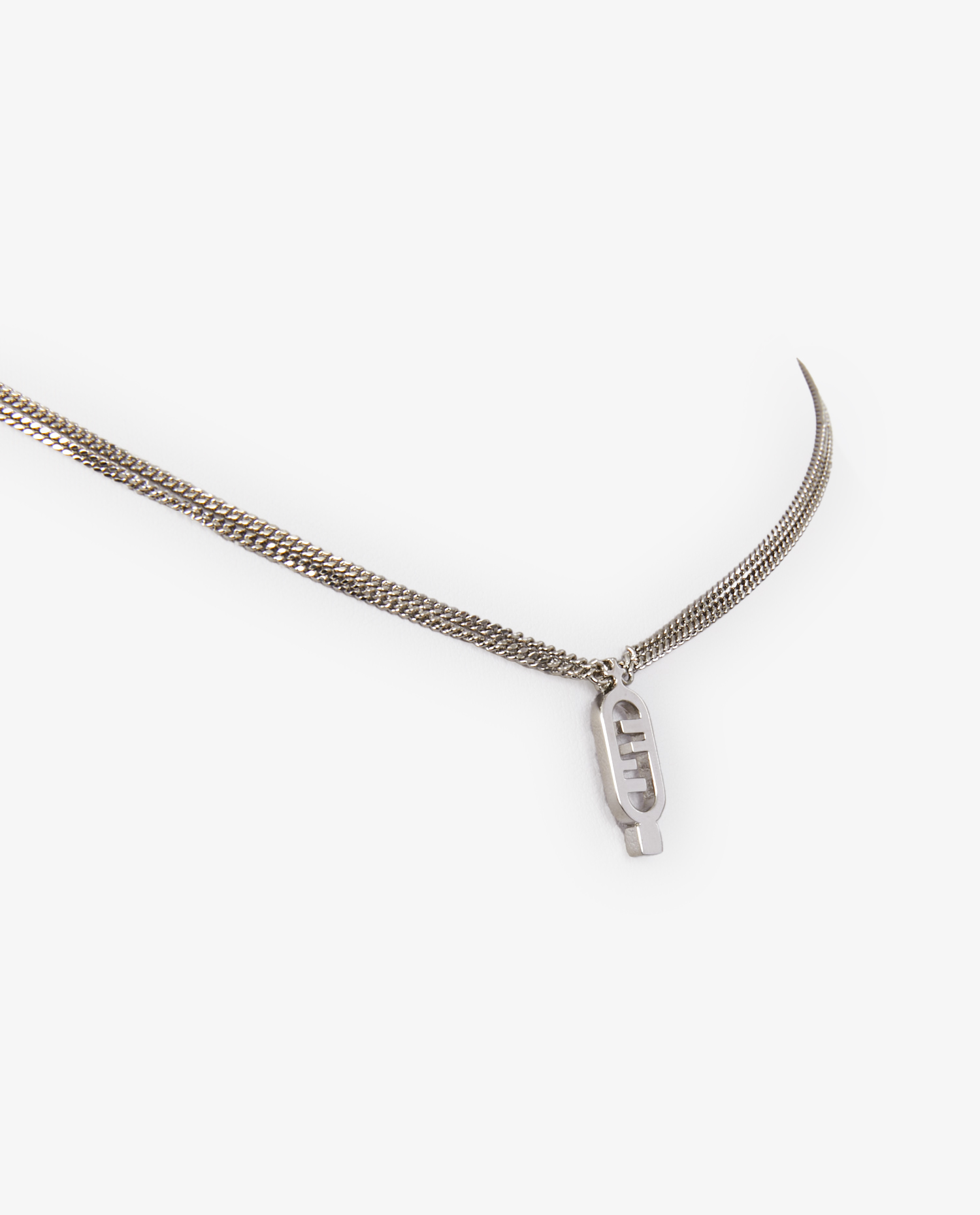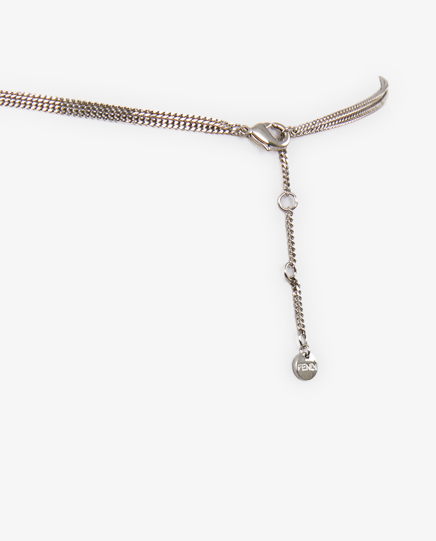 The necklace is made of palladium-finished brass, offering a shiny, oxidation-resistant silver look. The double chain adds volume while remaining light to wear. The central openwork pendant takes the form of a stylized vertical capsule, incorporating the Fendi logo. The lobster clasp is accompanied by an adjustable chain finished with a small Fendi-engraved medallion, allowing the length to be adjusted according to preference.
