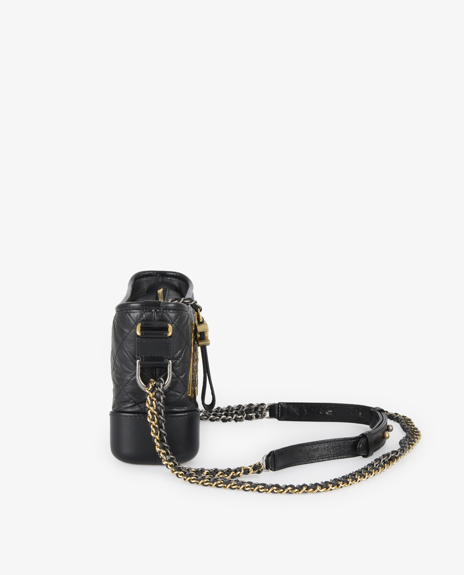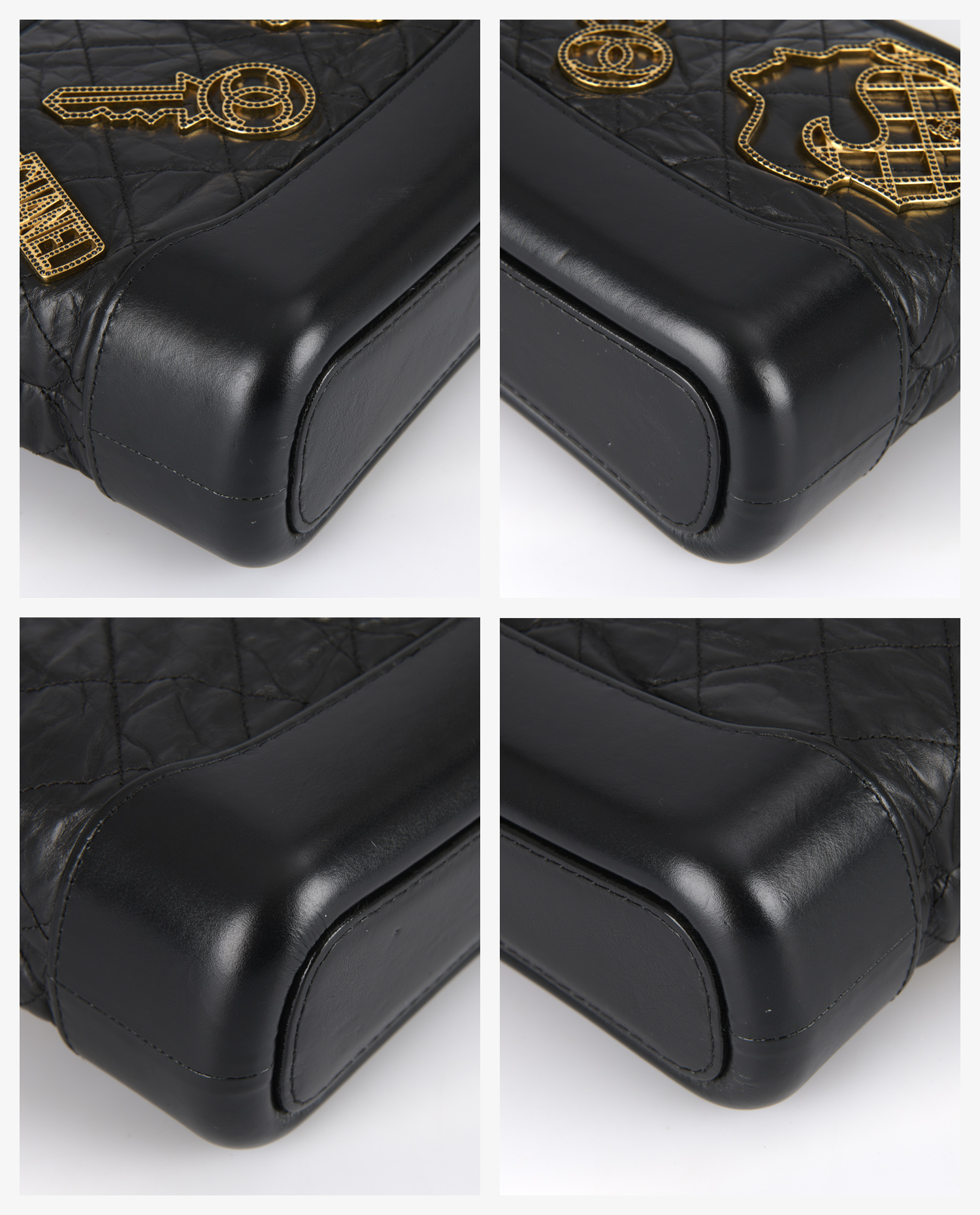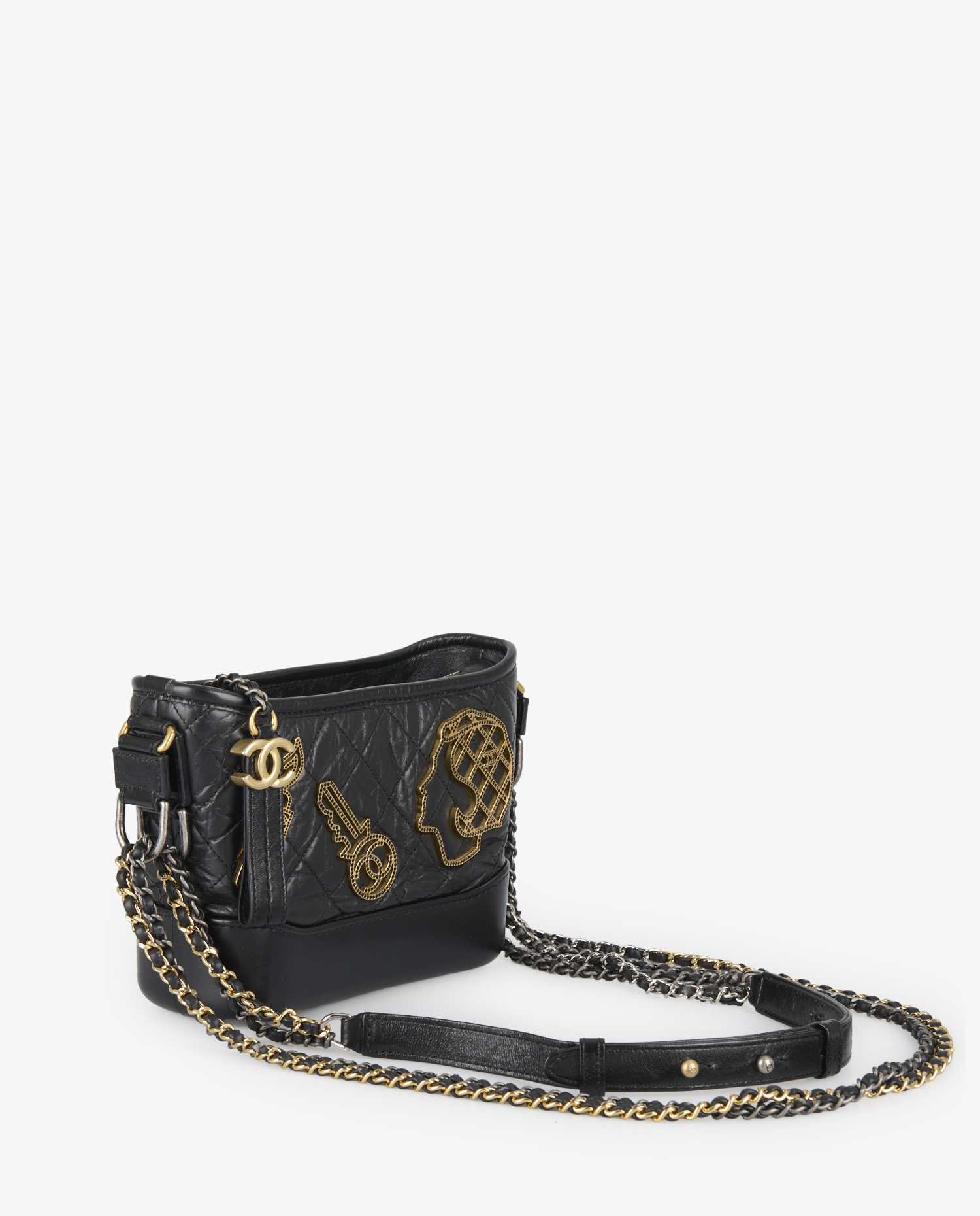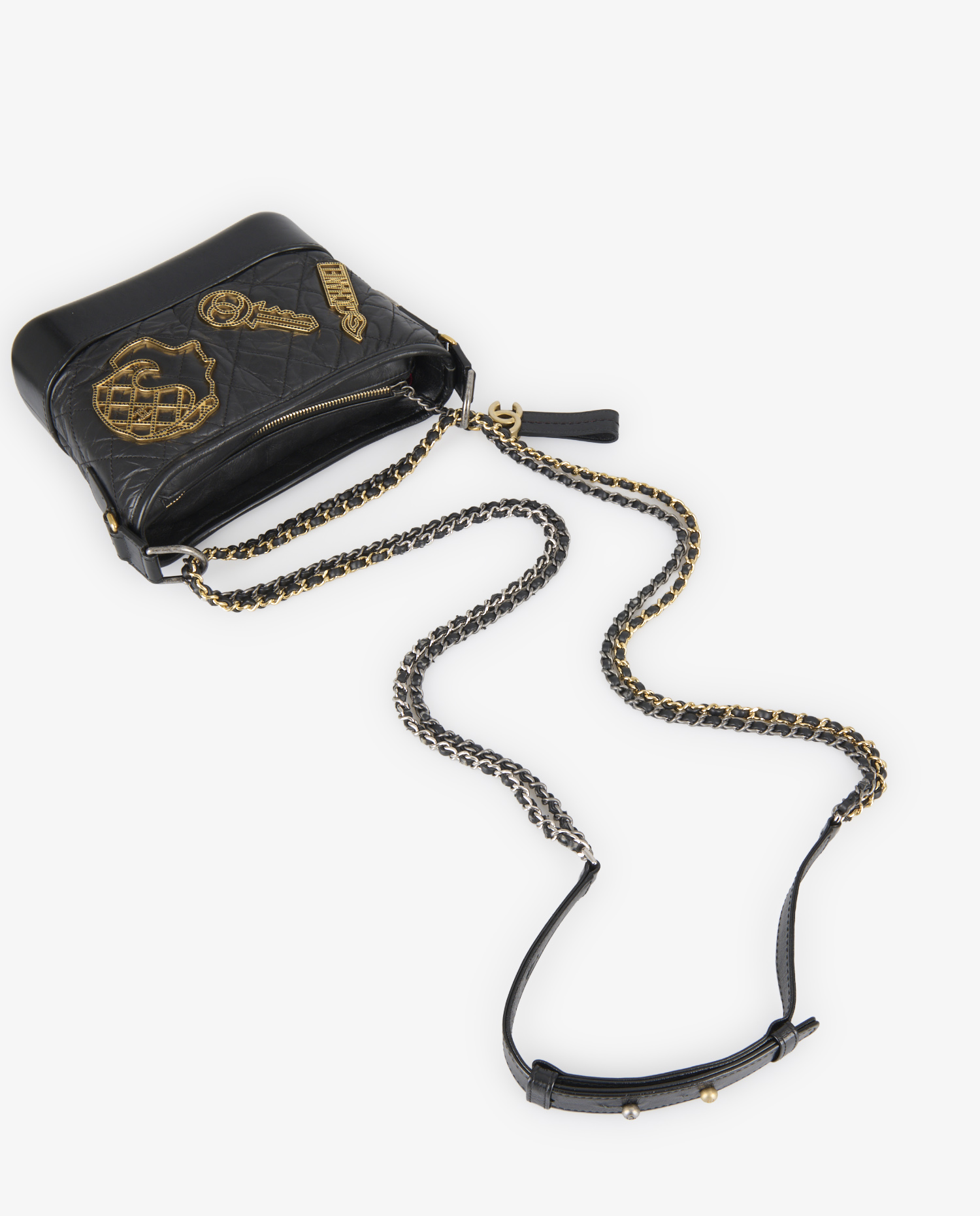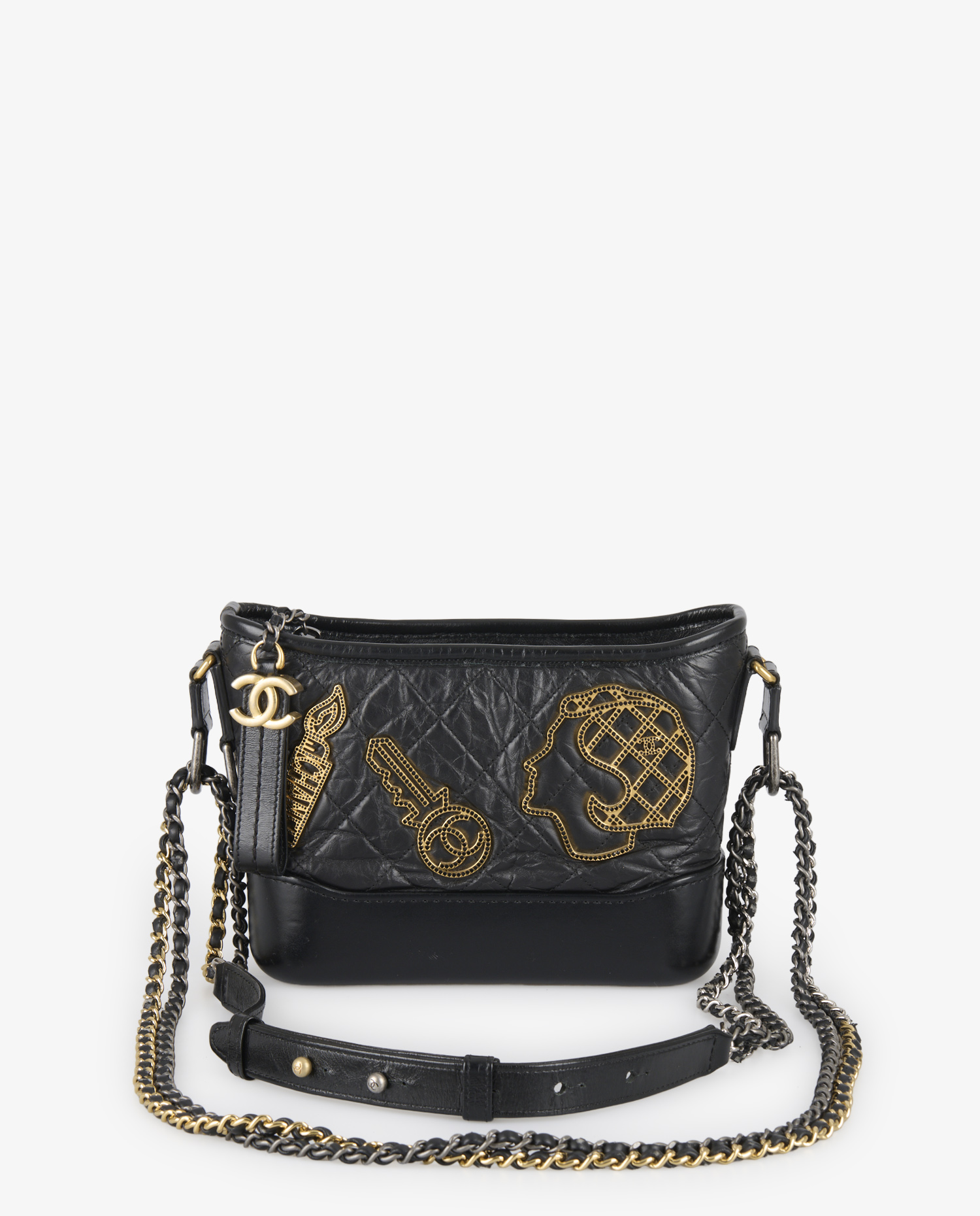 The Gabrielle bag, introduced in 2017 under the direction of Karl Lagerfeld, pays tribute to the free spirit of Gabrielle Chanel. Conceived to be functional and hybrid, it features a semi-rigid structure, a stable bottom and an innovative shoulder strap allowing multiple carries. This collector’s version, enriched with gold patches evoking the world of Chanel (key, flame, silhouette, stylized camellia), accentuates the bold character of the model, linking it to the visual heritage of the house. Designed to combine urban style with couture tradition, the Gabrielle is positioned as an emblematic model of contemporary Chanel.