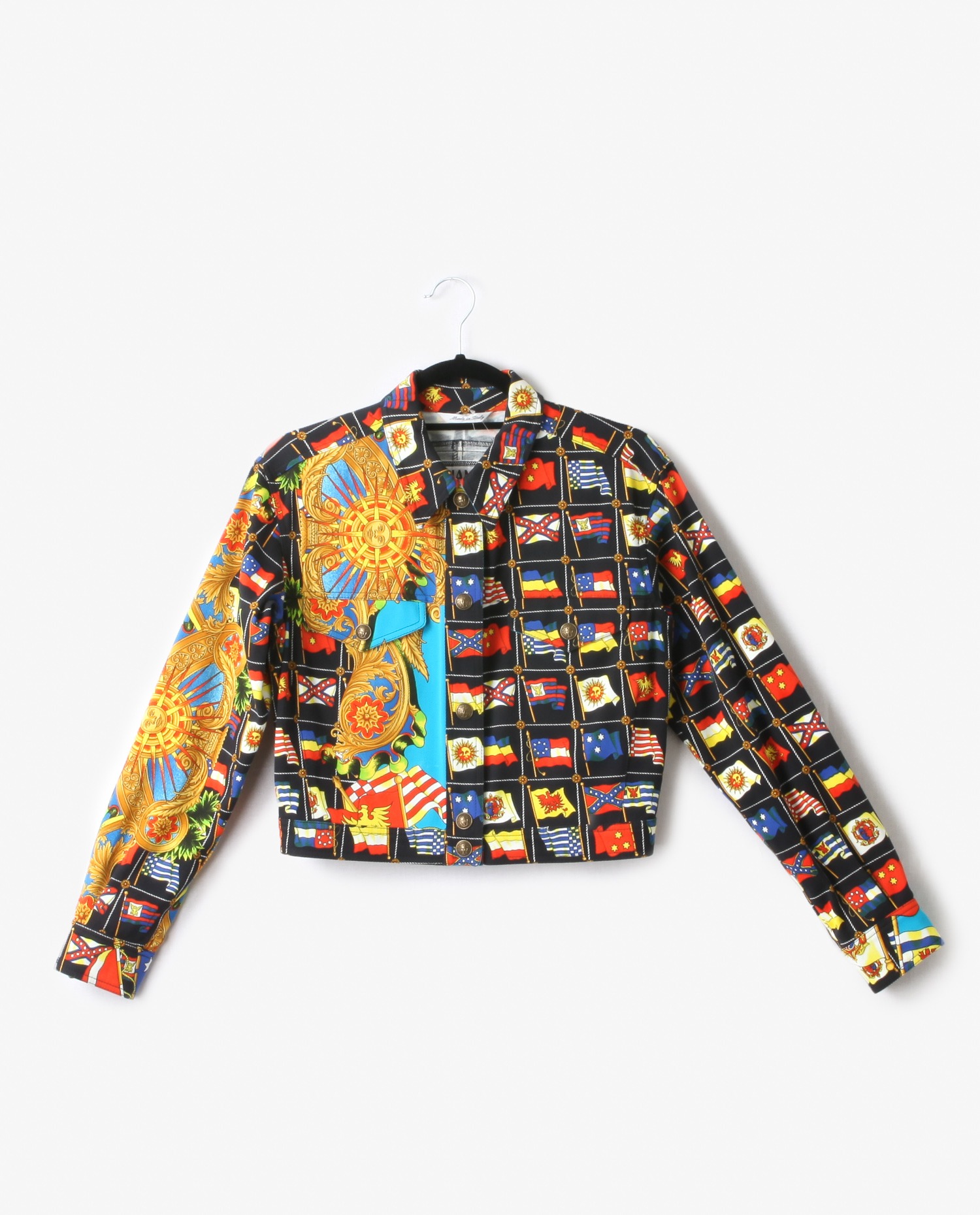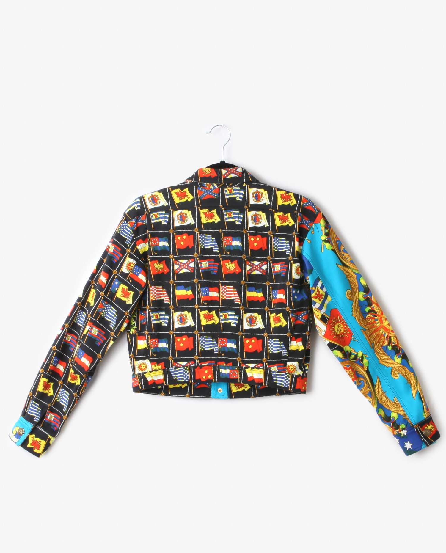 Gianni Versace slim-fit denim flag jacket from the 90s “Miami” collection. Médusa” bronze snap fastening.