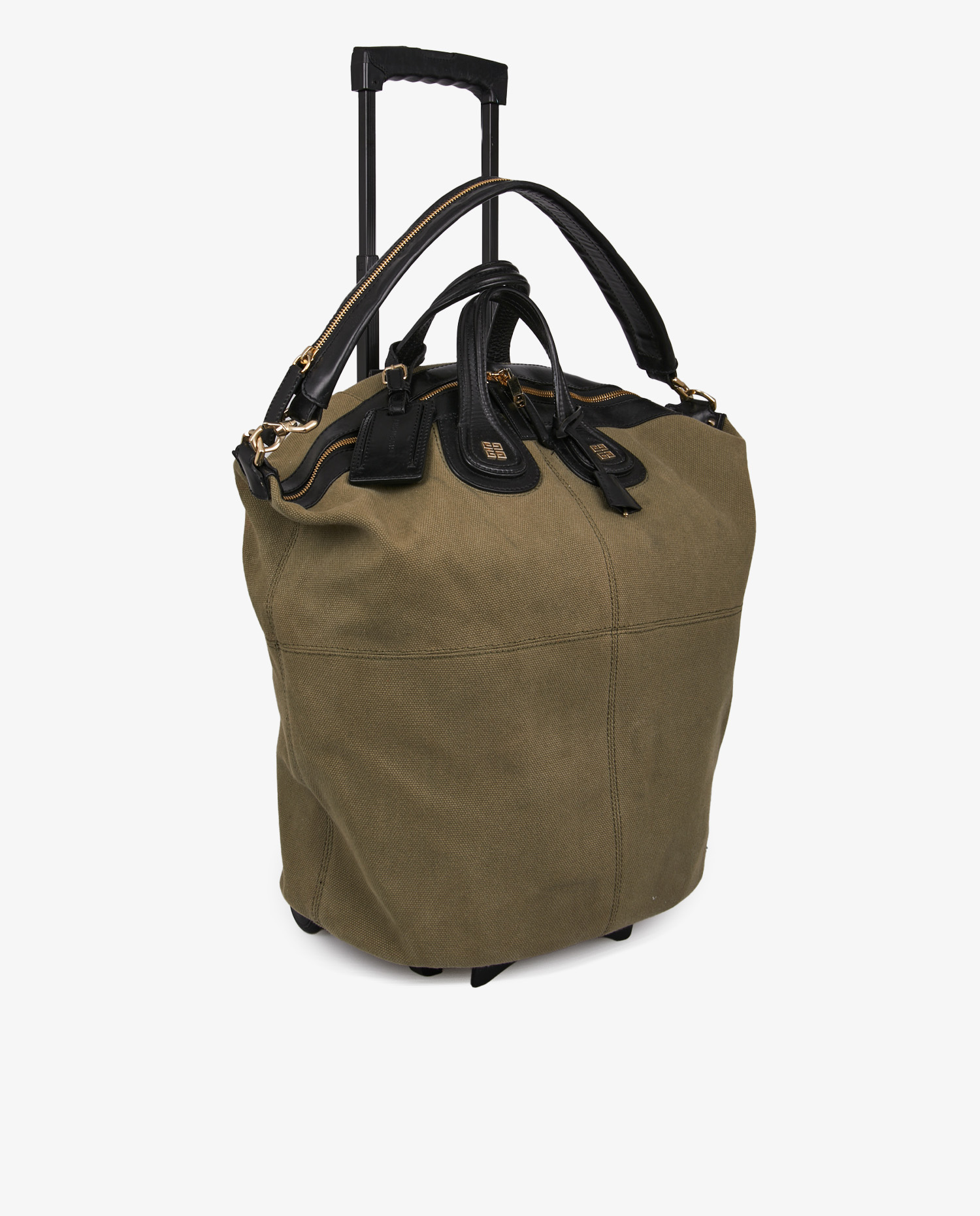 High-quality khaki canvas, dense and structured, is combined with smooth black leather that adorns the handles, the hand part of the metal fasteners, the badge and the zippers. The bag features an adjustable, removable shoulder strap in black leather, fitted with silver-tone metal snap hooks, for comfortable shoulder carrying. On the top of the bag are sturdy, rounded handles for hand-carrying. A black leather name tag inscribed Givenchy Paris hangs from one of the handles. The main zipper is accompanied by a leather flap. The bottom of the bag is slightly structured to improve fit.