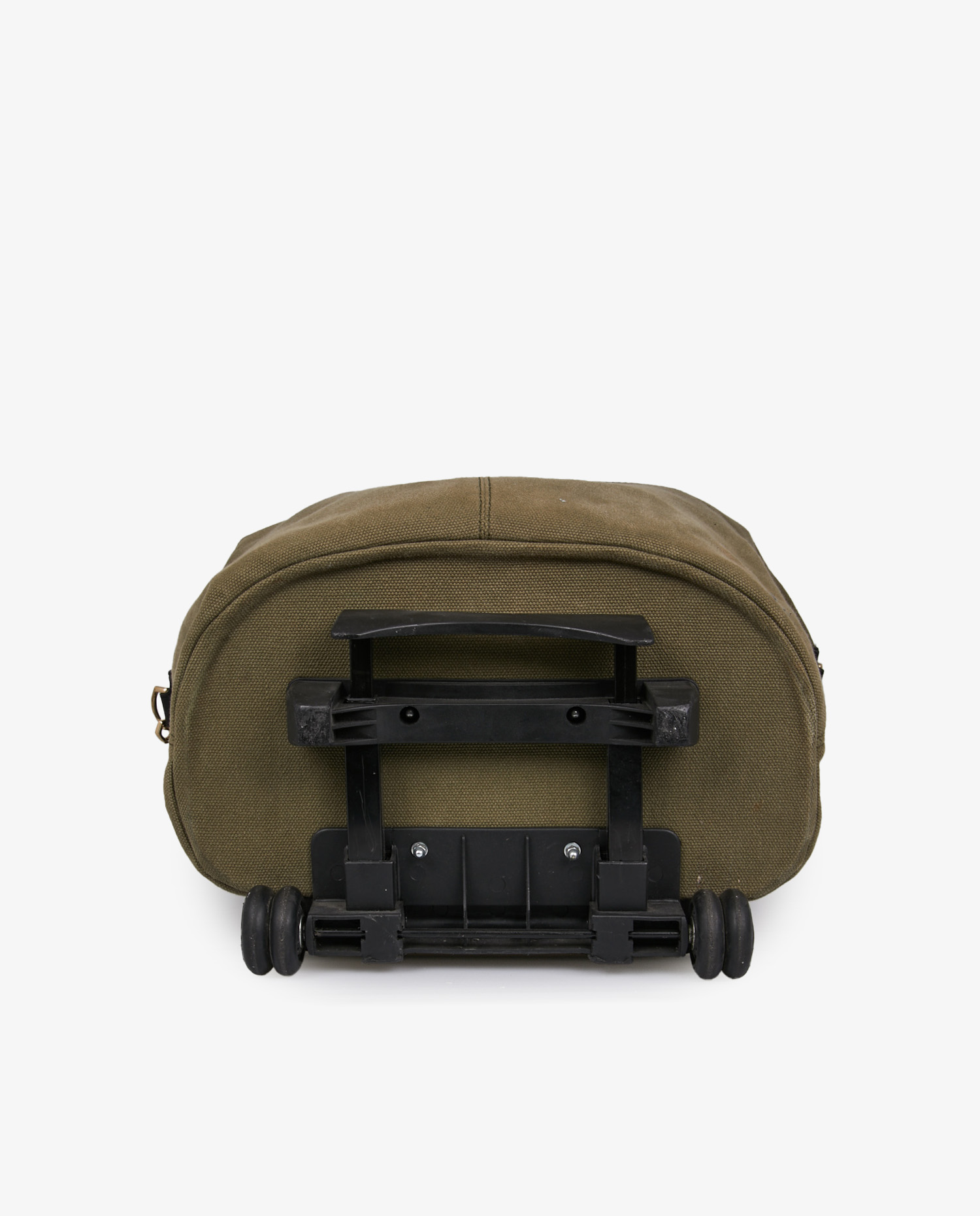 This vintage Nightingale suitcase from Givenchy stands out for its sober, functional look. It’s made from hard-wearing khaki canvas and enhanced with black leather trim on the top handles, shoulder straps and zipper corners. The model has a soft, slightly rounded silhouette and offers ample storage space. The gilded brass top zipper lends the bag a touch of elegance. On the back, a zipped pocket provides quick access to important items such as banknotes, passport or laptop. It comes with a black leather hard-shell nometag stamped “Givenchy”. On one handle is a bell with a key for the case lock. In good condition.