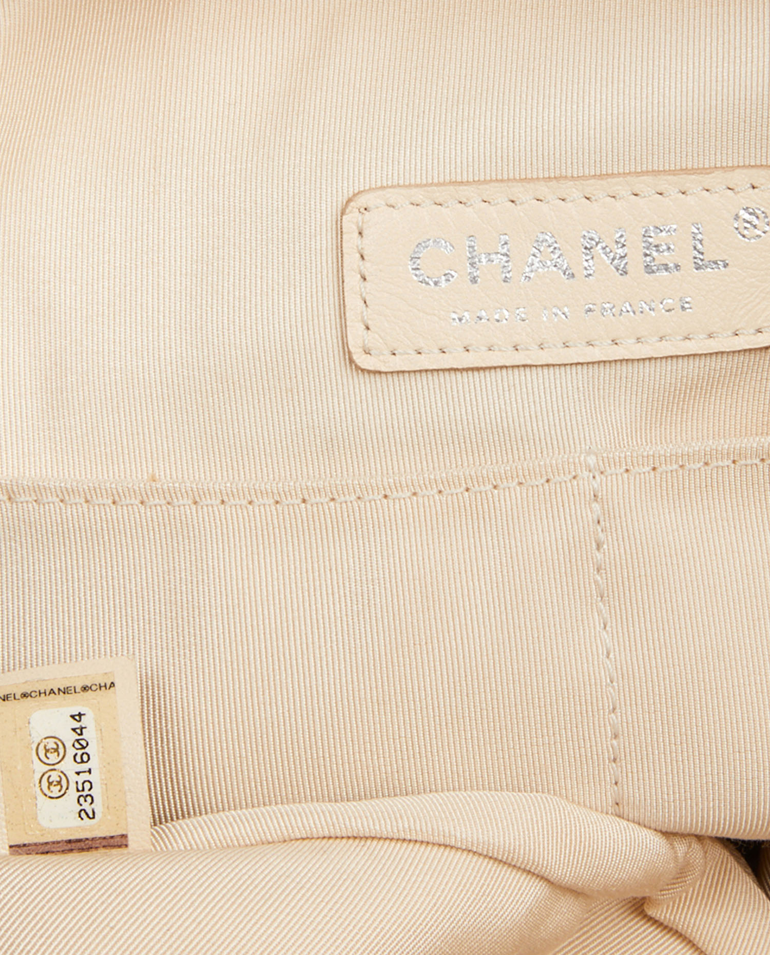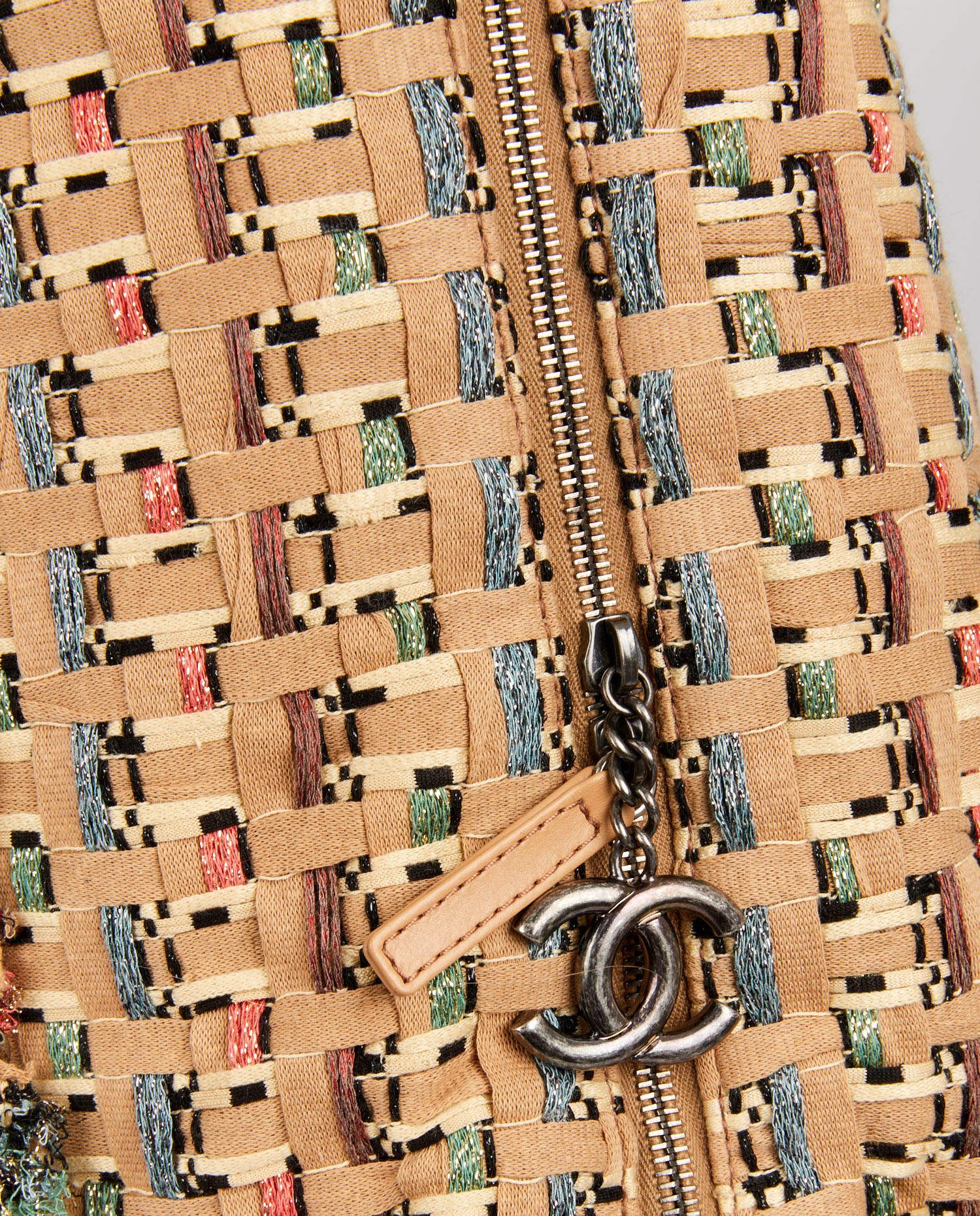 Chanel besace bag in beige tweed. Zipper closure. The interior is in beige fabric. Shoulder-mounted (71cm). In very good condition.