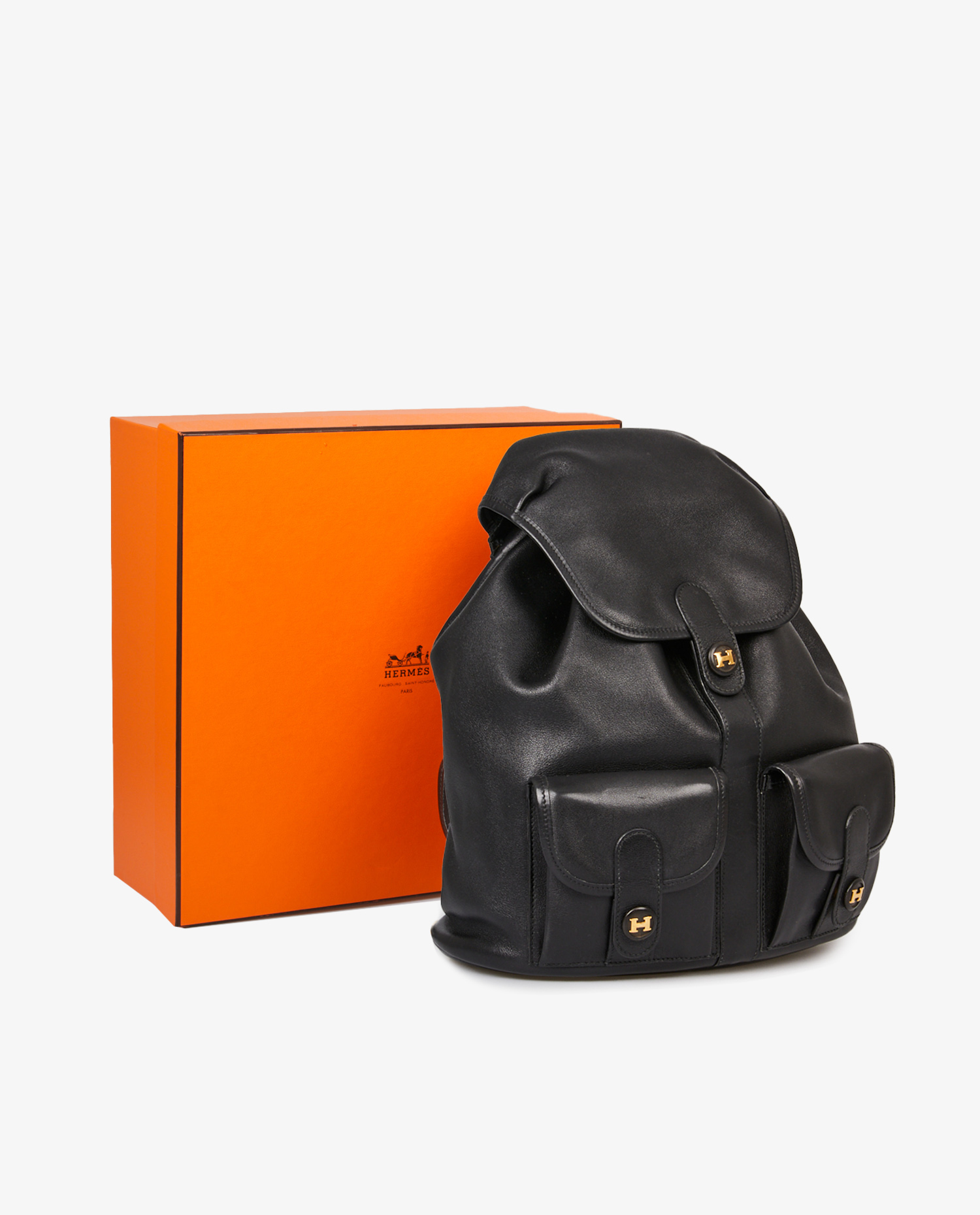 Vintage Hermès backpack in black leather. They are adjustable and measure 41cm at their shortest and 69cm at their longest. In very good condition. It will be delivered in its original box.