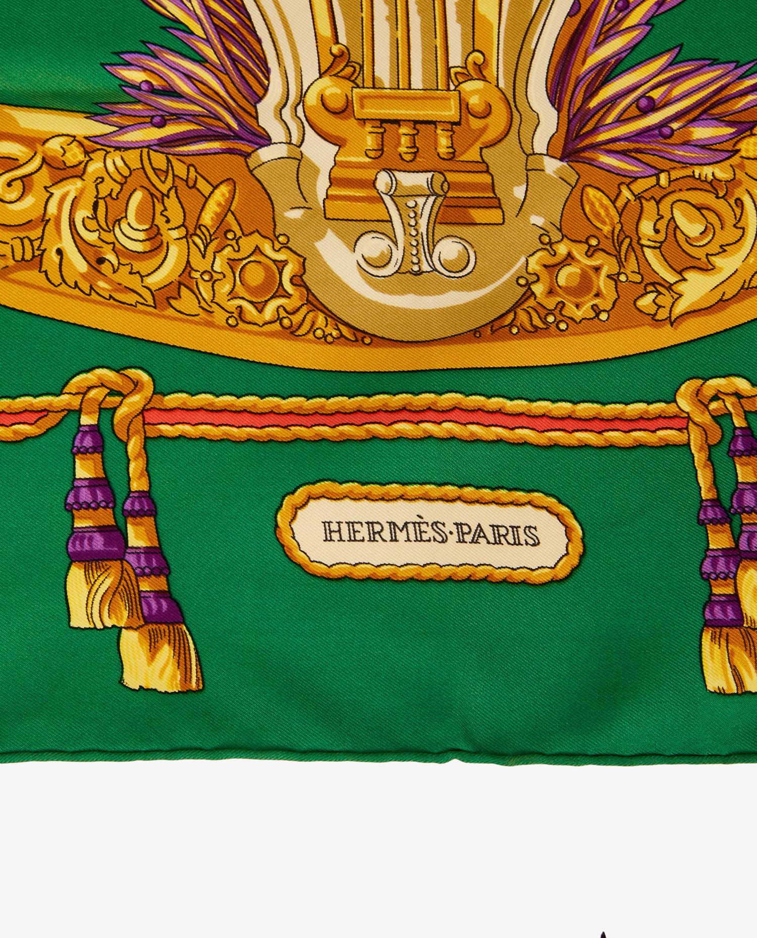 Vintage Hermès square in silk twill “Hommage à Charles Garnier”, designed by Cathy Latham and first published in 1989. This square is a vibrant tribute to Charles Garnier, famous architect of the Garnier opera house, a jewel of Napoleon III style inaugurated in 1875. At its center, the scarf reveals a portrait sculpture of Garnier, surrounded by details inspired by the Opera’s lavish decor: columns, sculptures, musical instruments and Baroque ornaments. The palette is dominated by deep green, gold and ivory. A very fine piece. In very good condition.