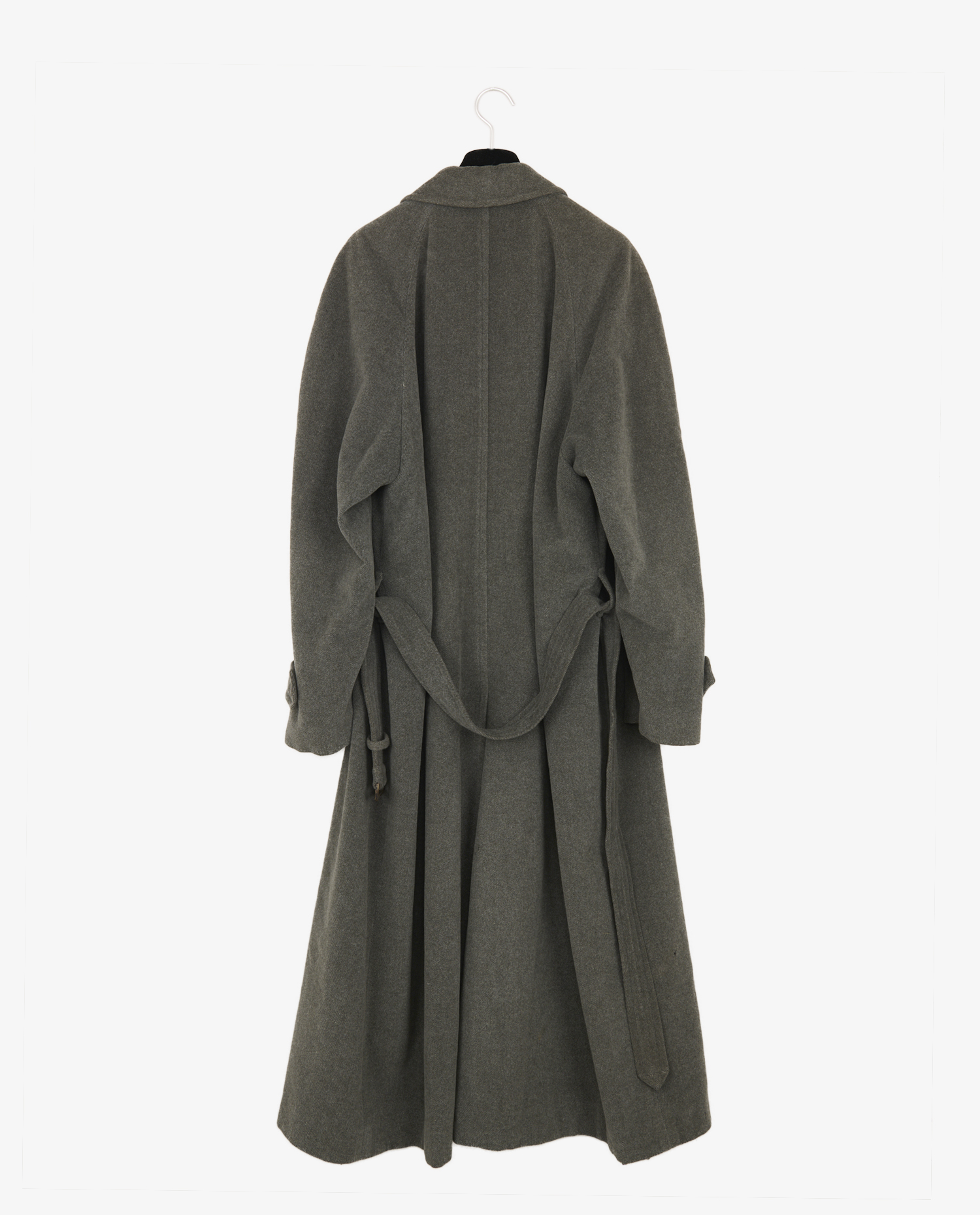 The coat is distinguished by its slightly mottled gray fabric, tightly woven but soft to the touch. The lines are sober, with no decorative inserts, allowing the quality of the fabric to speak for itself. The classic collar can be worn up or flat, and the cuffs feature an adjustable button placket. Two side pockets are discreetly integrated into the seams. The tone-on-tone belt, with imitation horn resin buckle, structures the silhouette without stiffness.