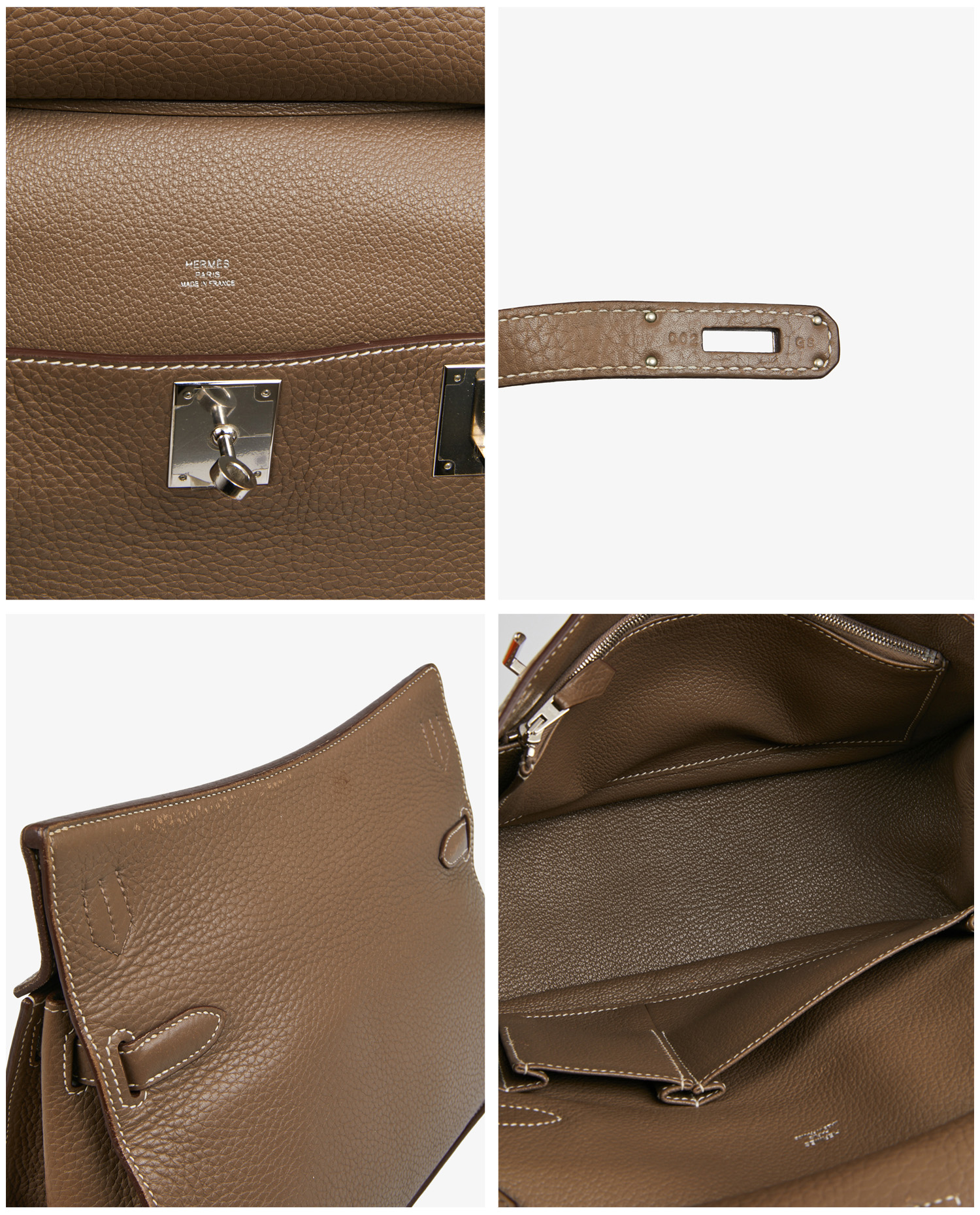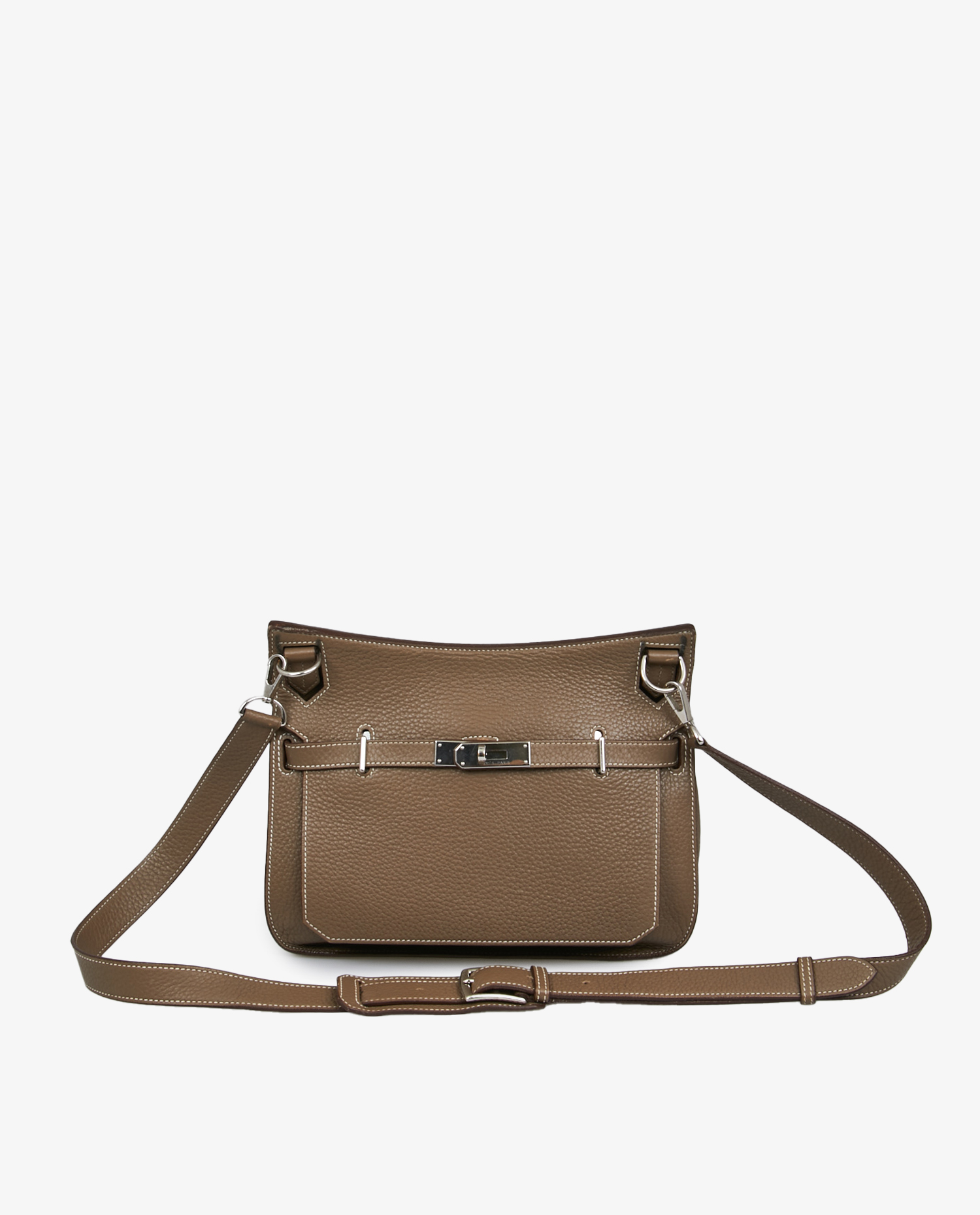 Togo leather is characterized by its suppleness and soft feel, while offering good resistance to wear and tear. The etampe color brings an elegant neutrality that’s easy to match. The bag is embellished with metal buckles and the famous turnstile clasp inspired by the Birkin and Kelly. The wide shoulder strap is adjustable with silver buckles for a precise fit. The edges and corners are slightly rounded.
