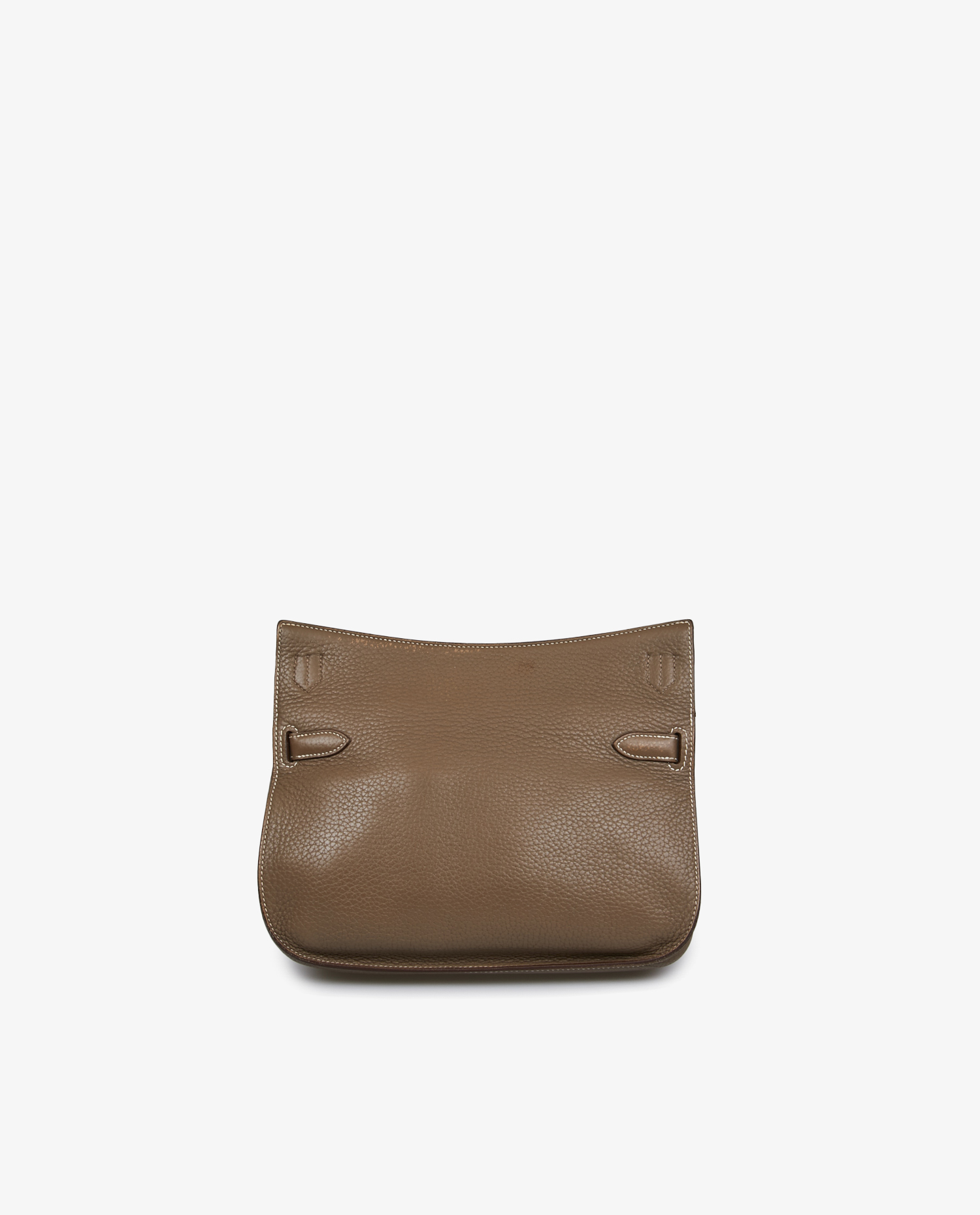 This Hermès Jypsière bag is crafted in etoupe-colored Togo leather with a distinctive grain characteristic of this supple, lightly textured leather. It features a trapezoidal, structured silhouette, combined with a metal clasp inspired by the house’s iconic models. The bag features a wide, removable and adjustable shoulder strap that can be worn as a shoulder bag or a cross-body bag, ensuring optimal comfort for everyday wear. Contrasting white stitching emphasizes the bag’s lines and highlights the quality of its assembly. The silver metallic palladium finish adds a discreet touch of elegance. In very good condition.
