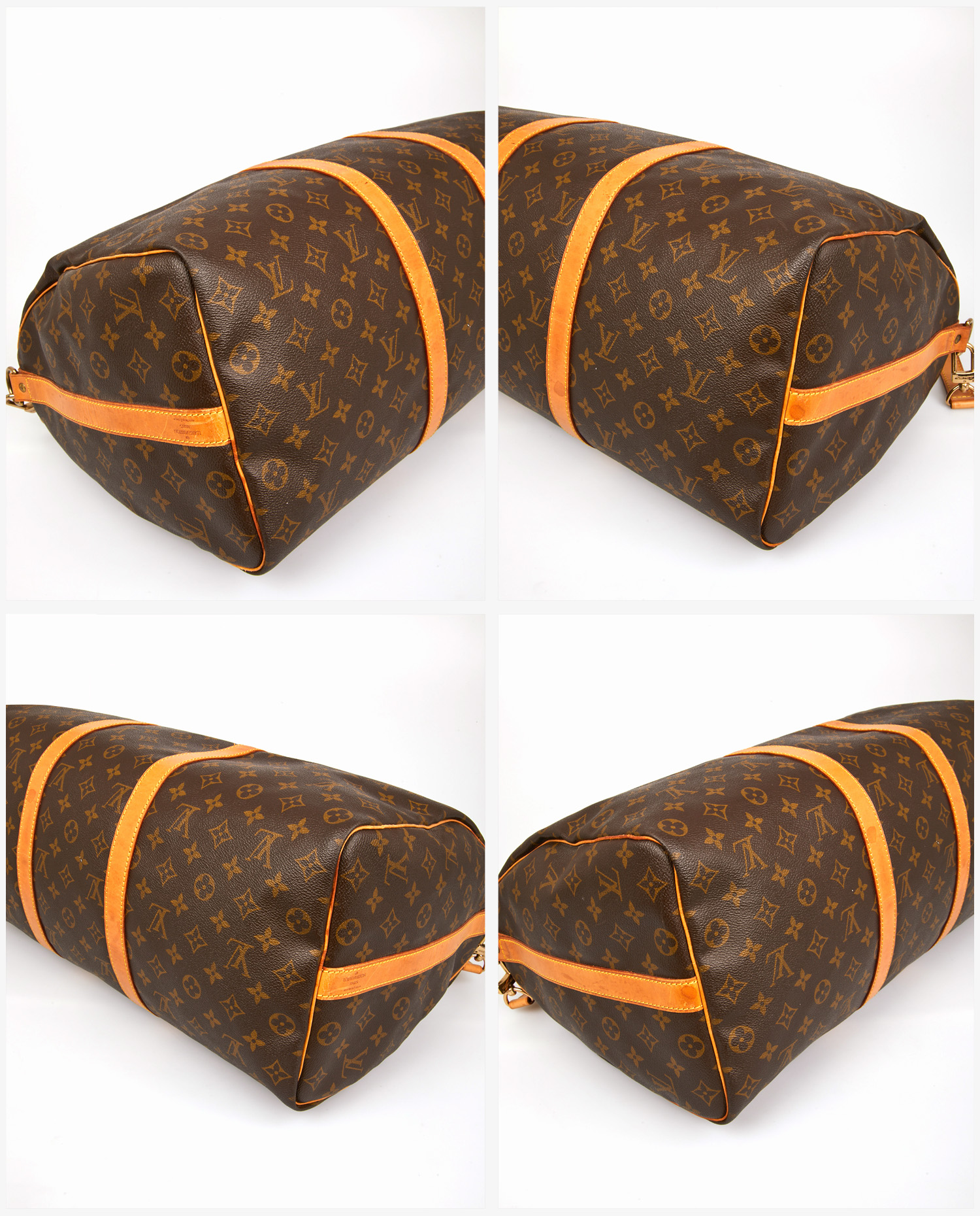 This Keepall is in very good vintage condition. The Monogram canvas is tight and intact. The natural leather shows a nice even patina, with a few visible signs of use, notably on the shoulder strap and handles, but no structural weakening. The zip slides perfectly. The corners are only slightly marked and the leather edges are well preserved.
