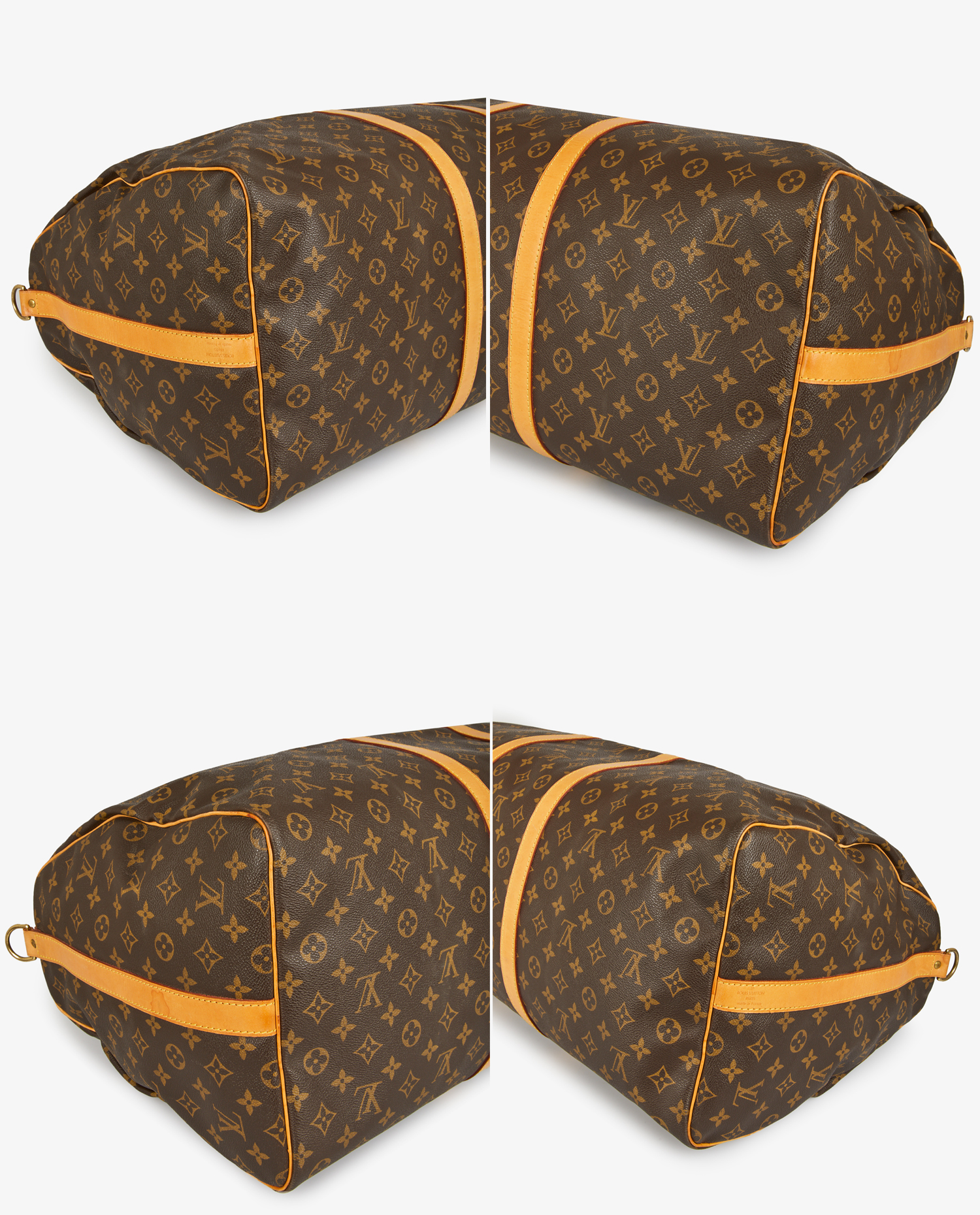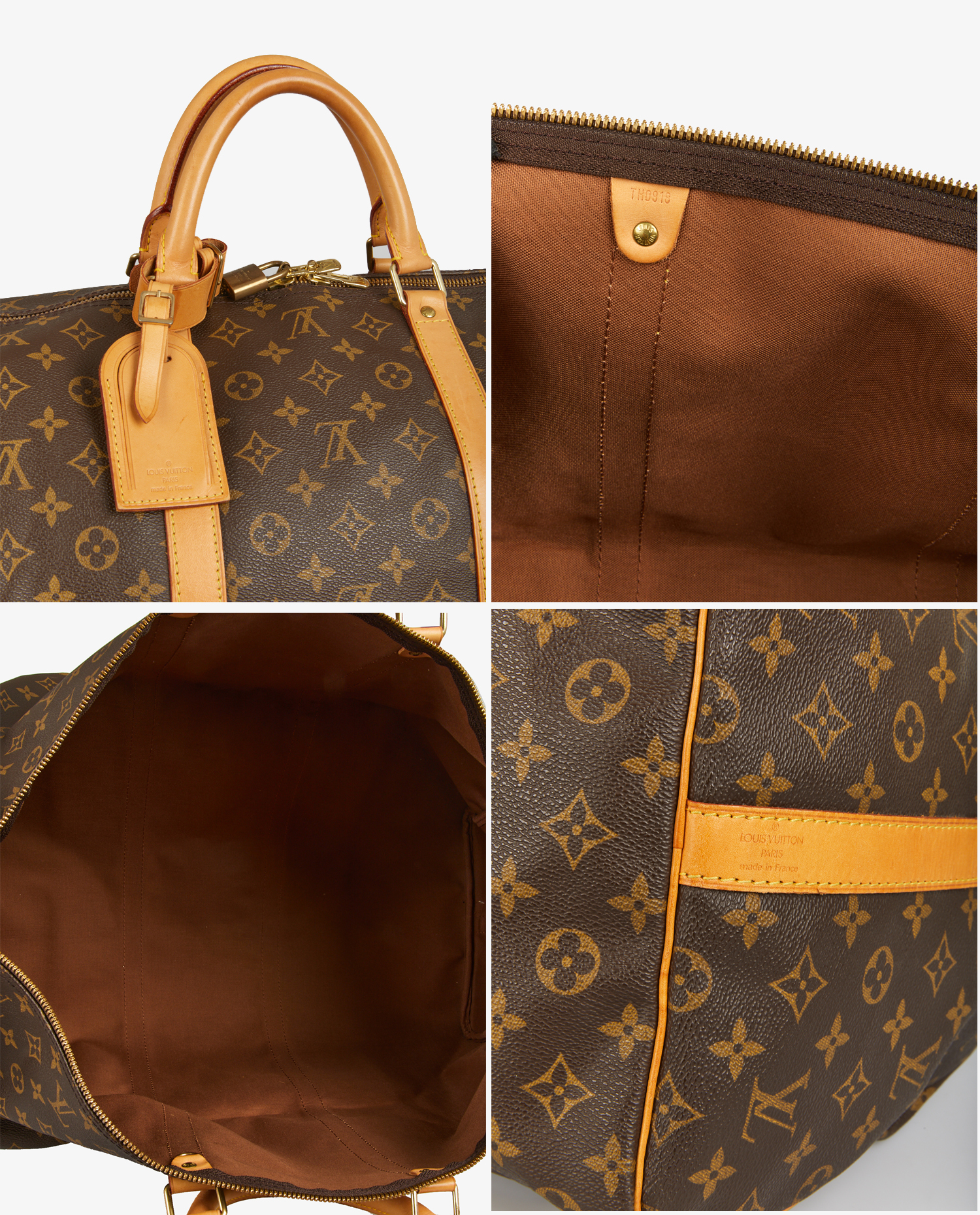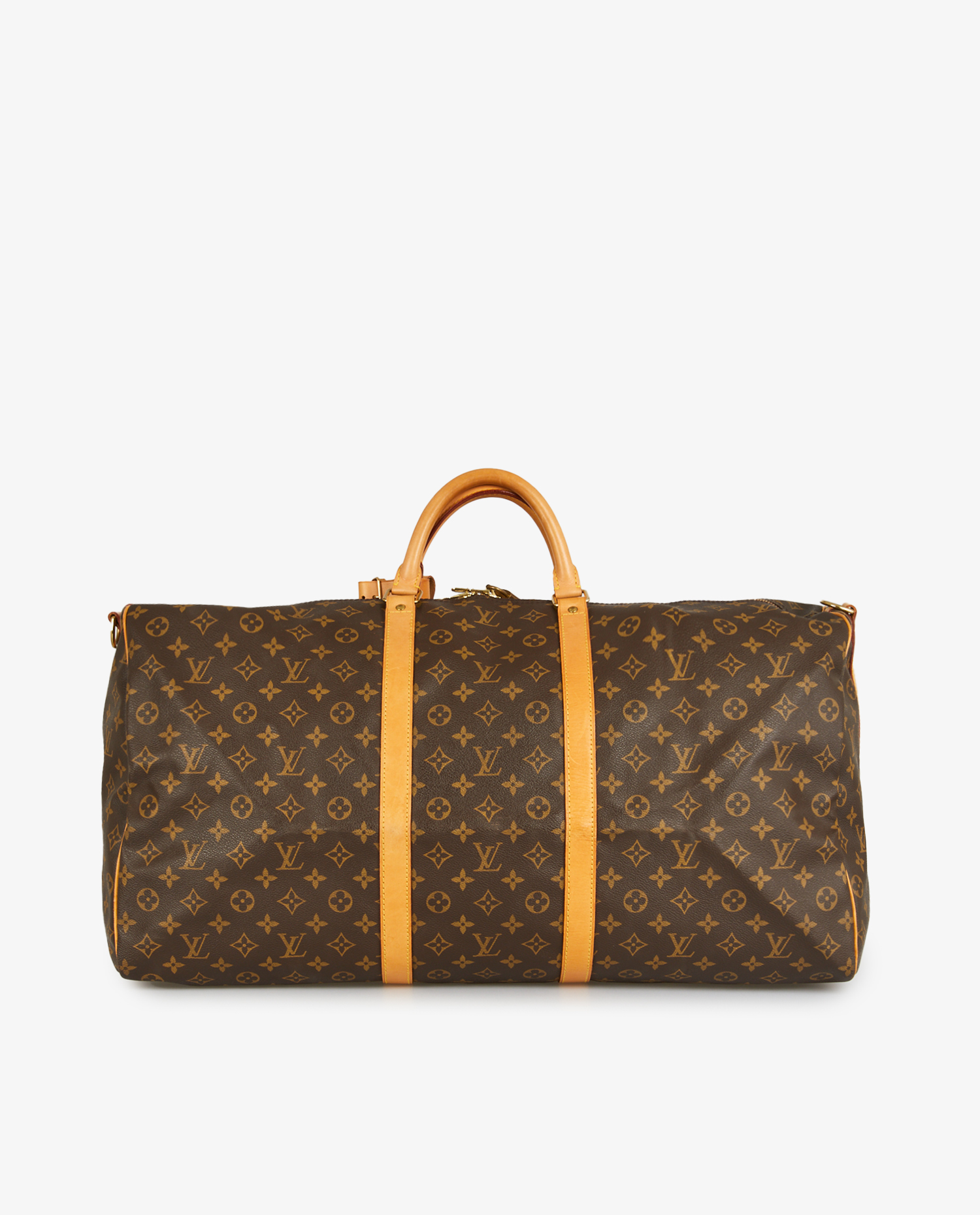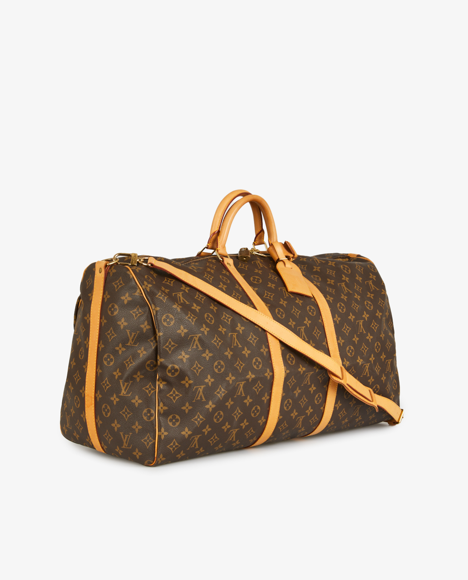Louis Vuitton Keepall 60 bag in monogram canvas with natural cowhide leather trim. Carried by hand or on the shoulder with removable, adjustable shoulder strap. In very good condition.