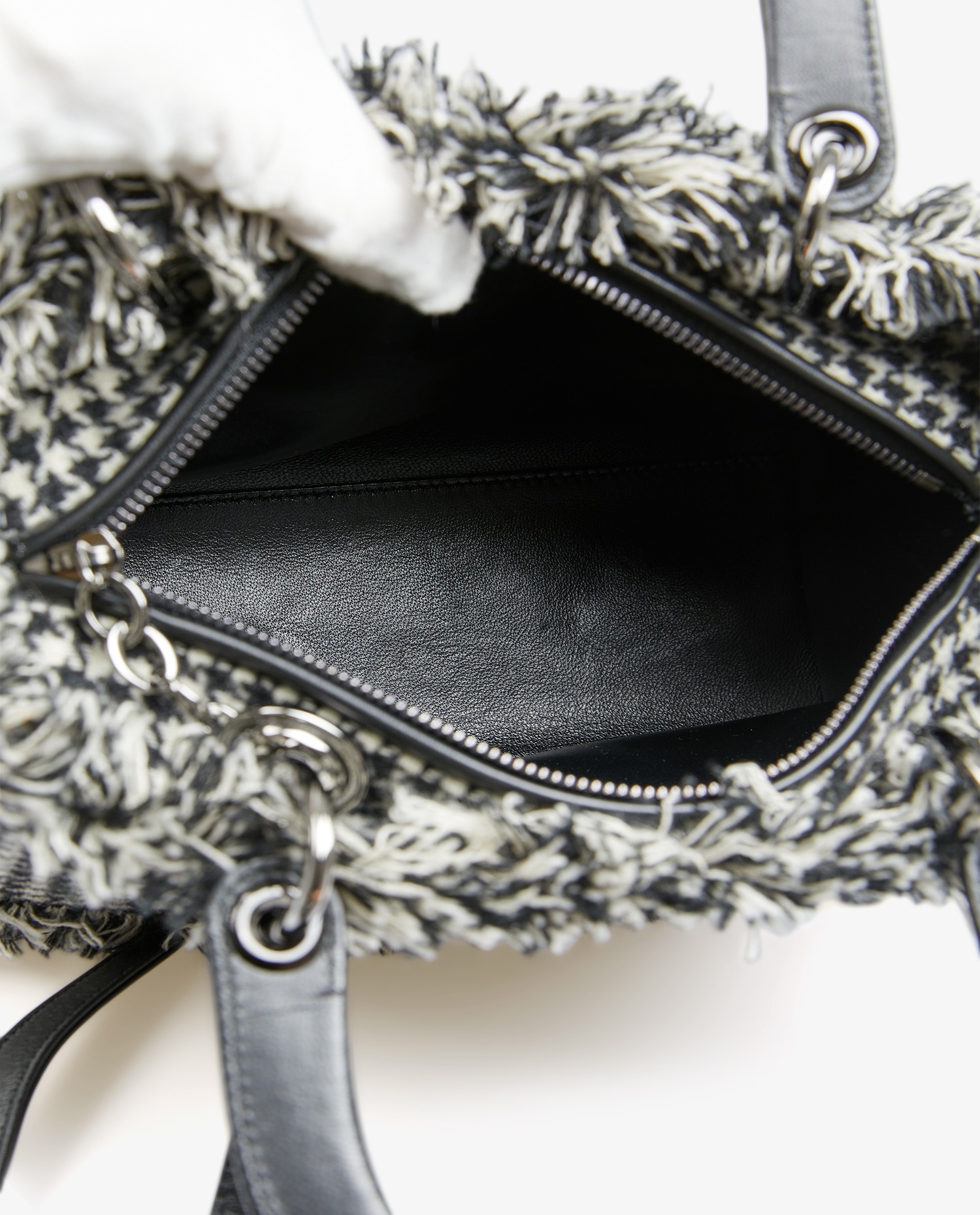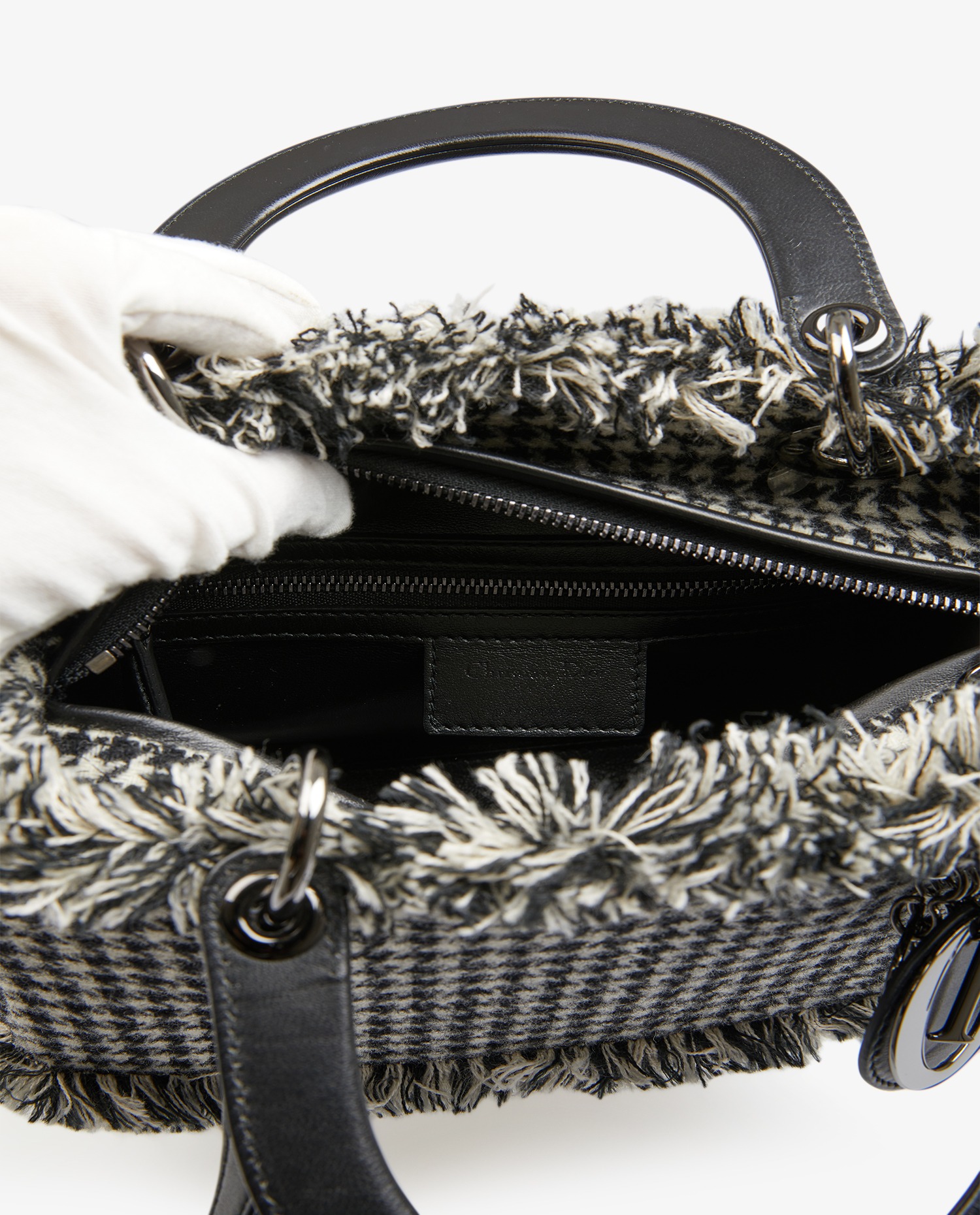 Lady Dior houndstooth bag by Maison Dior in white and black wool. Ruthenium jewelry. Central zip fastening. The interior is in black lambskin. It can be carried by hand or crossbody with a removable shoulder strap. In very good condition.