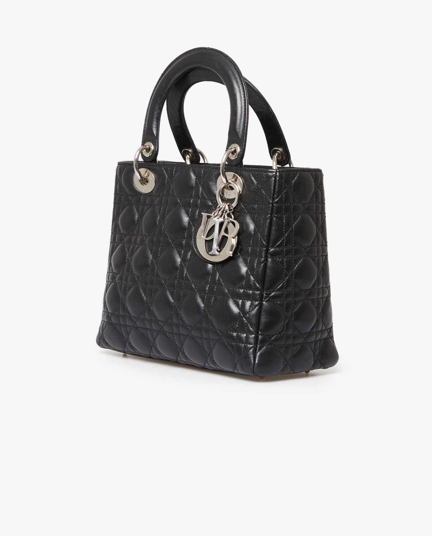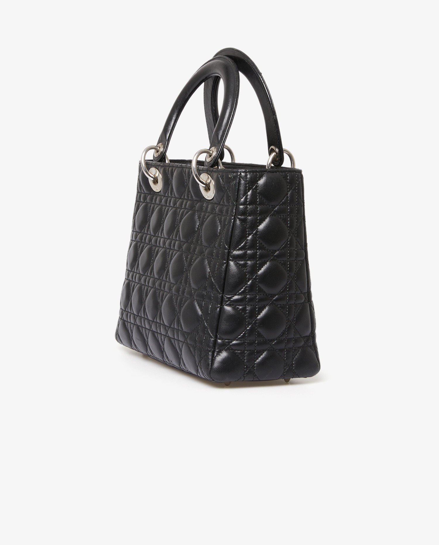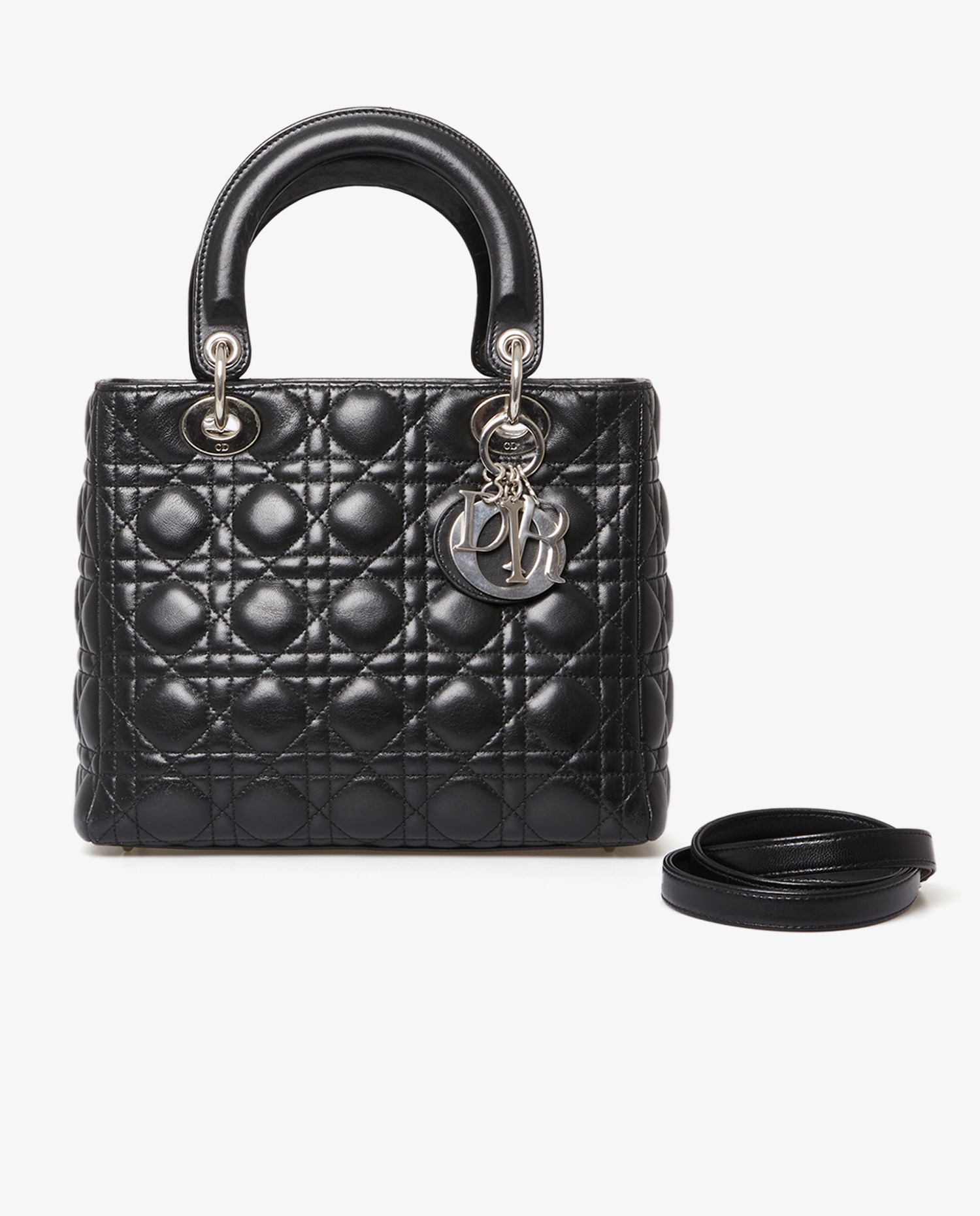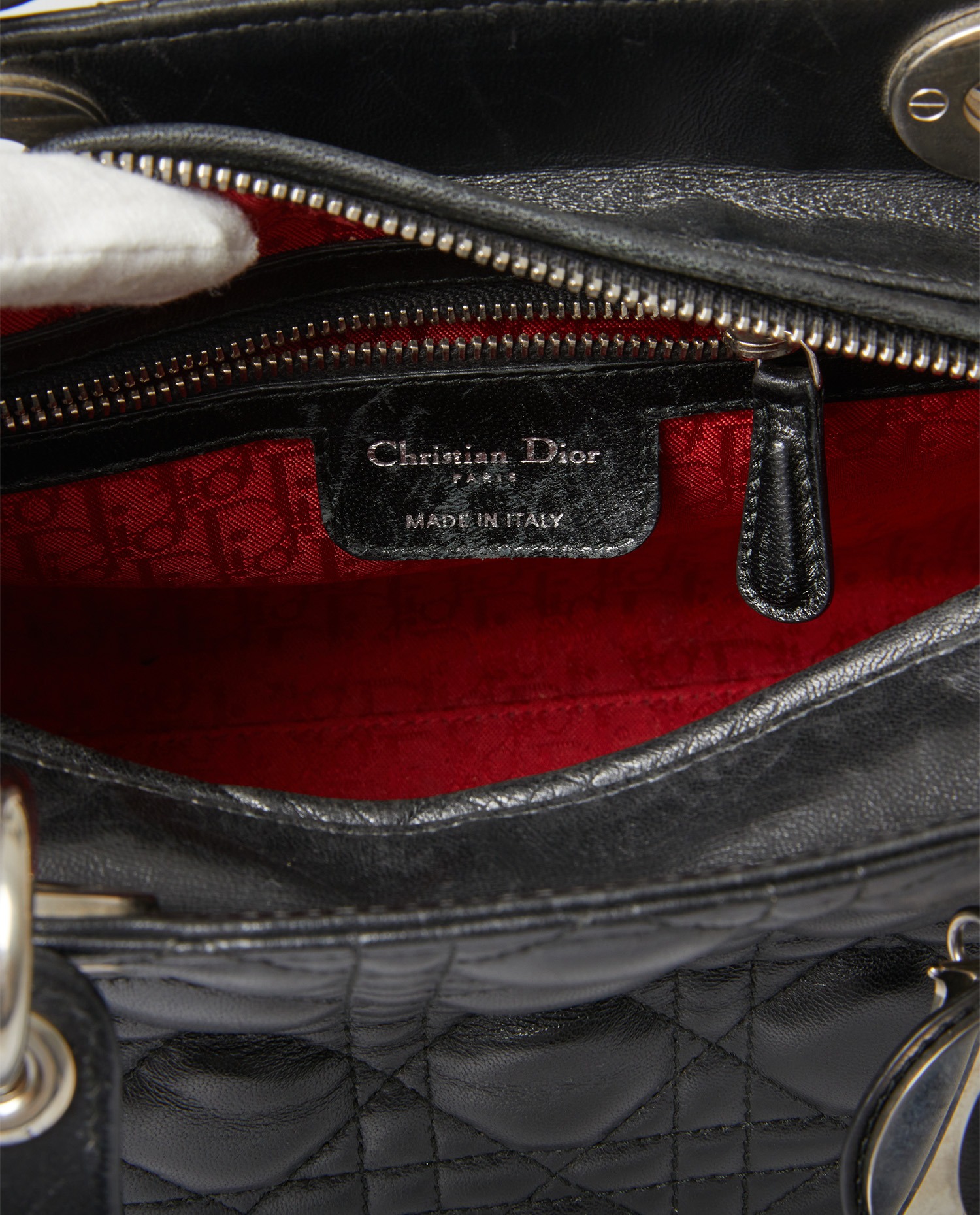 Lady Dior bag in black lambskin with stitching. It can be carried by hand or over the shoulder with a slim, removable shoulder strap. It measures 90cm. The interior is in red monogram canvas with a zipped pocket.
