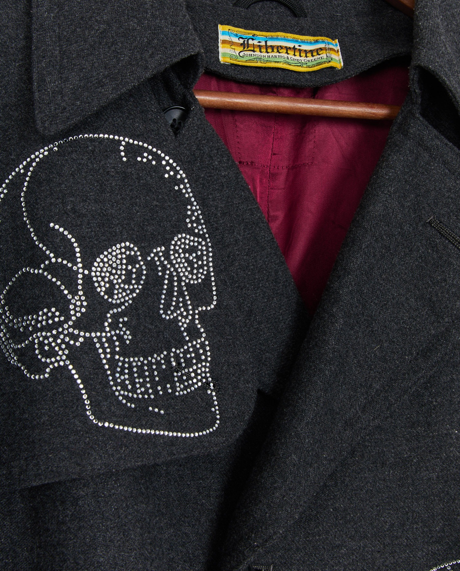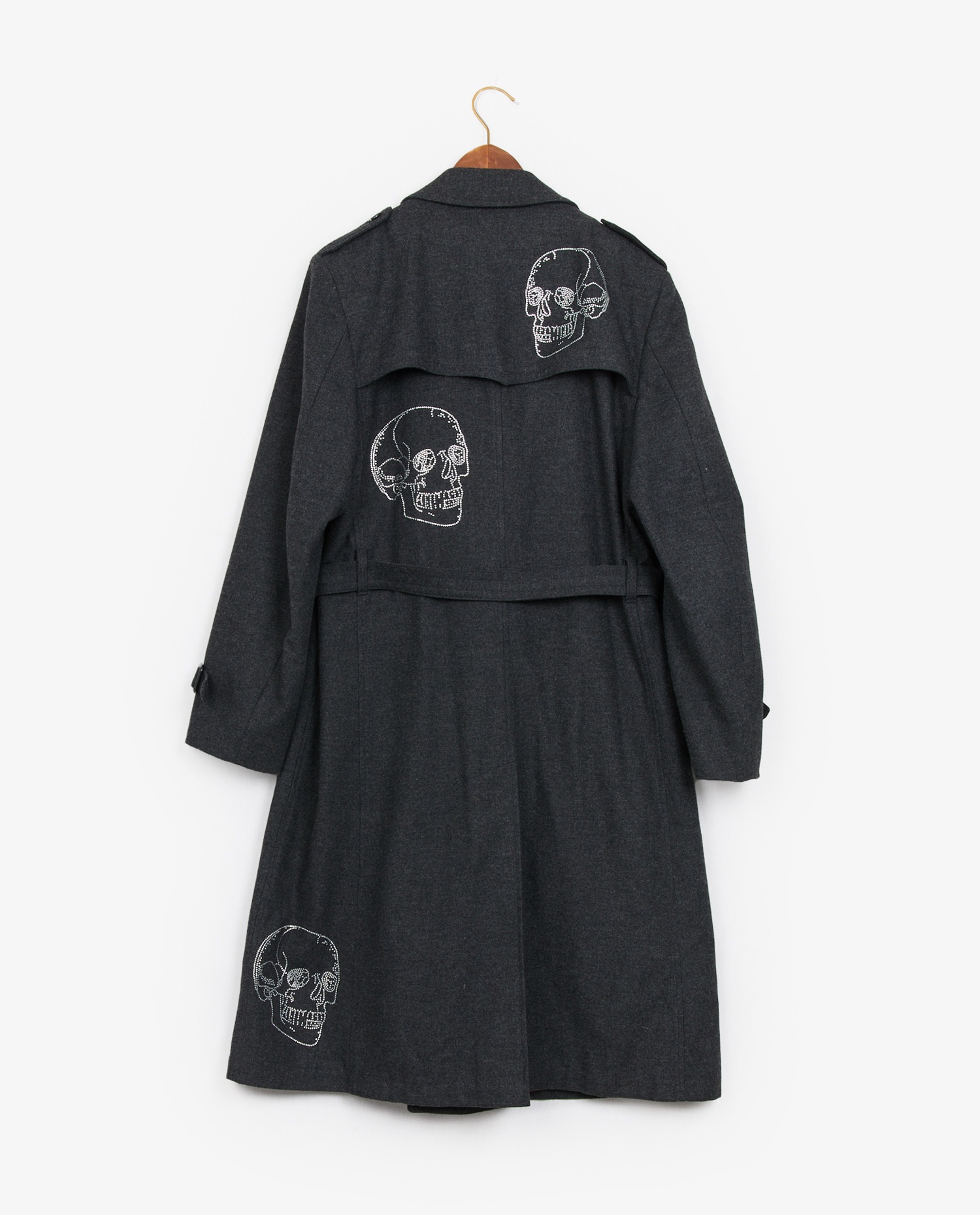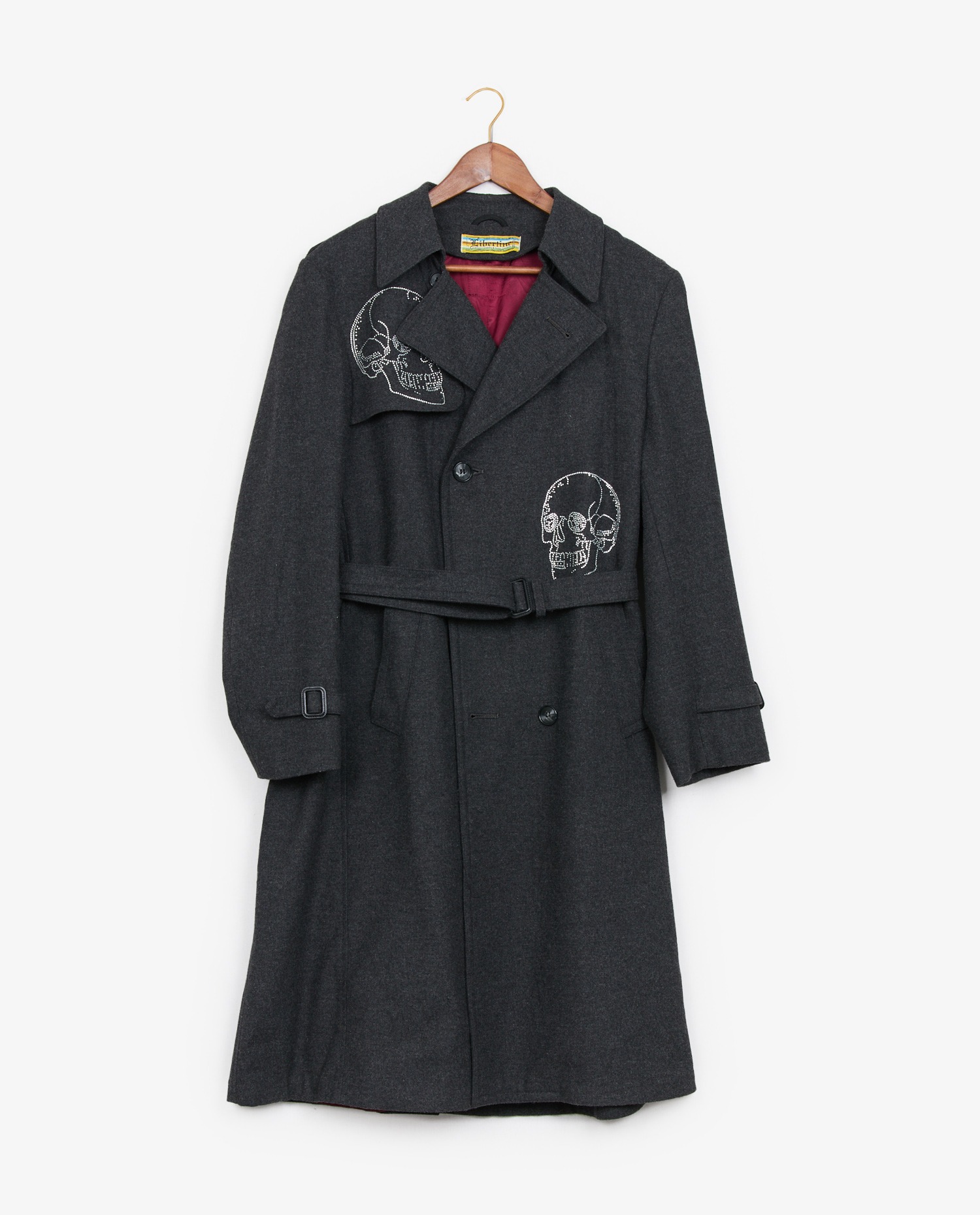 Libertine trench coat in grey wool. Rhinestone skull and crossbones. Size 50. In very good condition.