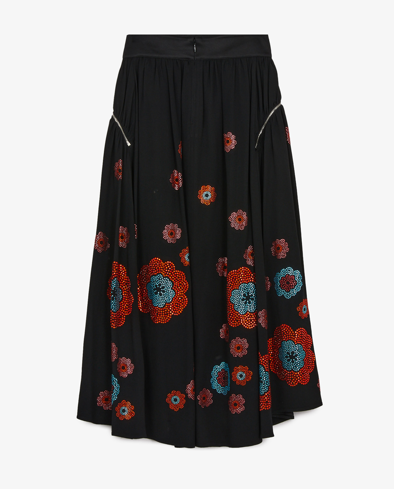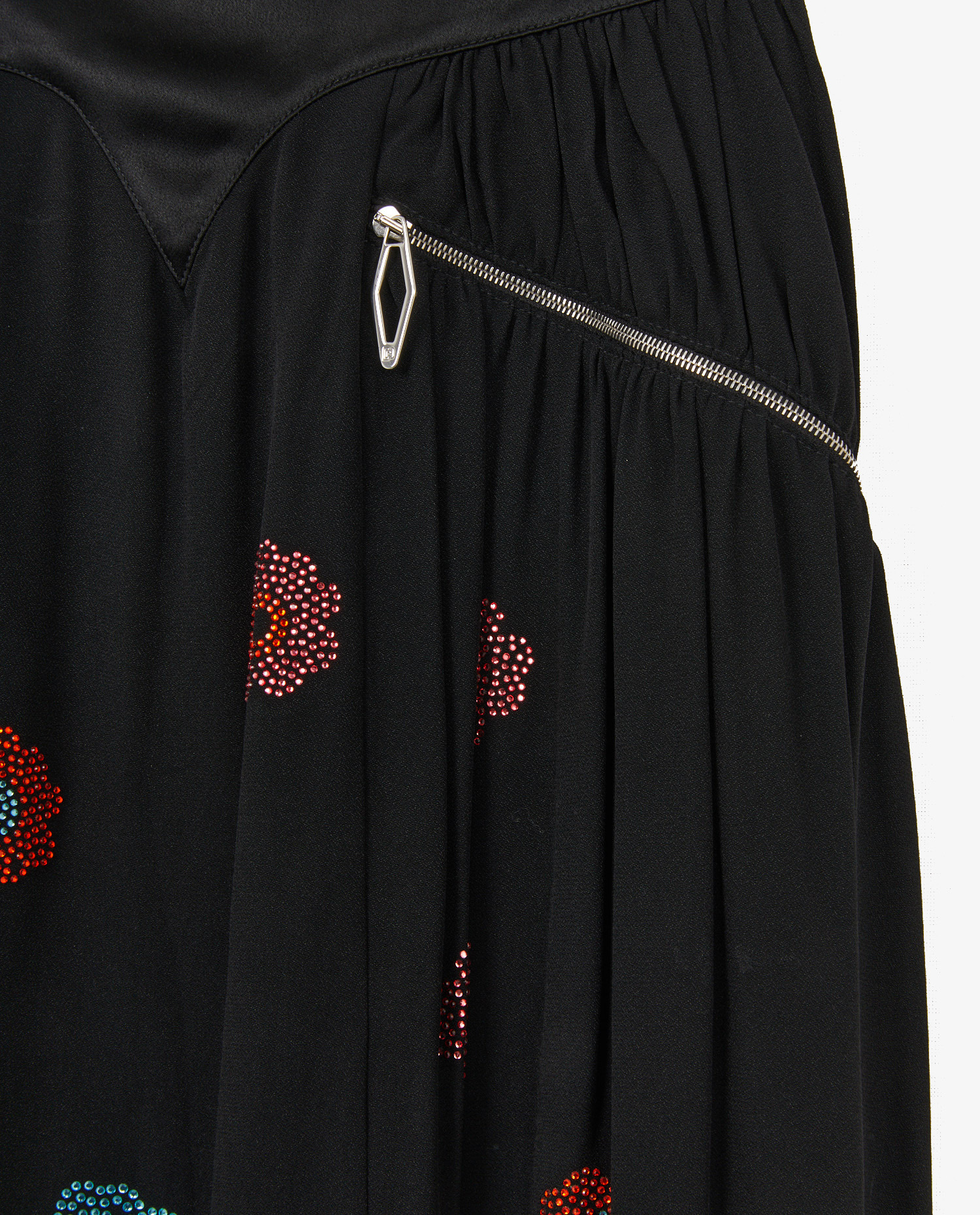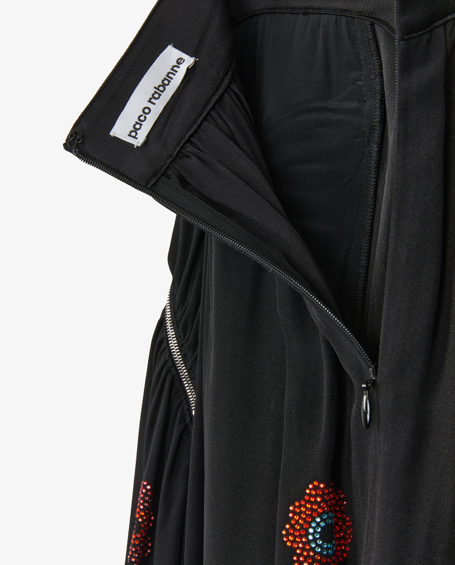 Paco Rabanne ruffled black long skirt with flower-shaped rhinestones. Two zipped side pockets. In very good condition.