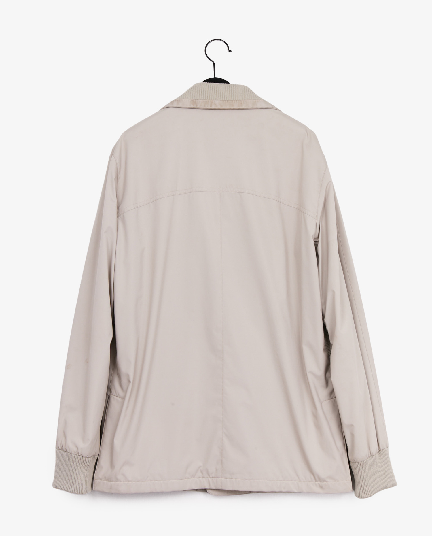 The smooth, dense light beige outer fabric is designed to withstand rain and wind, while maintaining a supple hand. The stand-up collar is partially in tone-on-tone rib knit, providing effective neck protection. The cuffs and inner hem are also rib-knit, for optimum fit and enhanced thermal insulation. The buttons are made of horn, attached to a reinforced placket. Two slanted side pockets with integrated flaps underline the garment’s functionality without breaking its clean lines.
