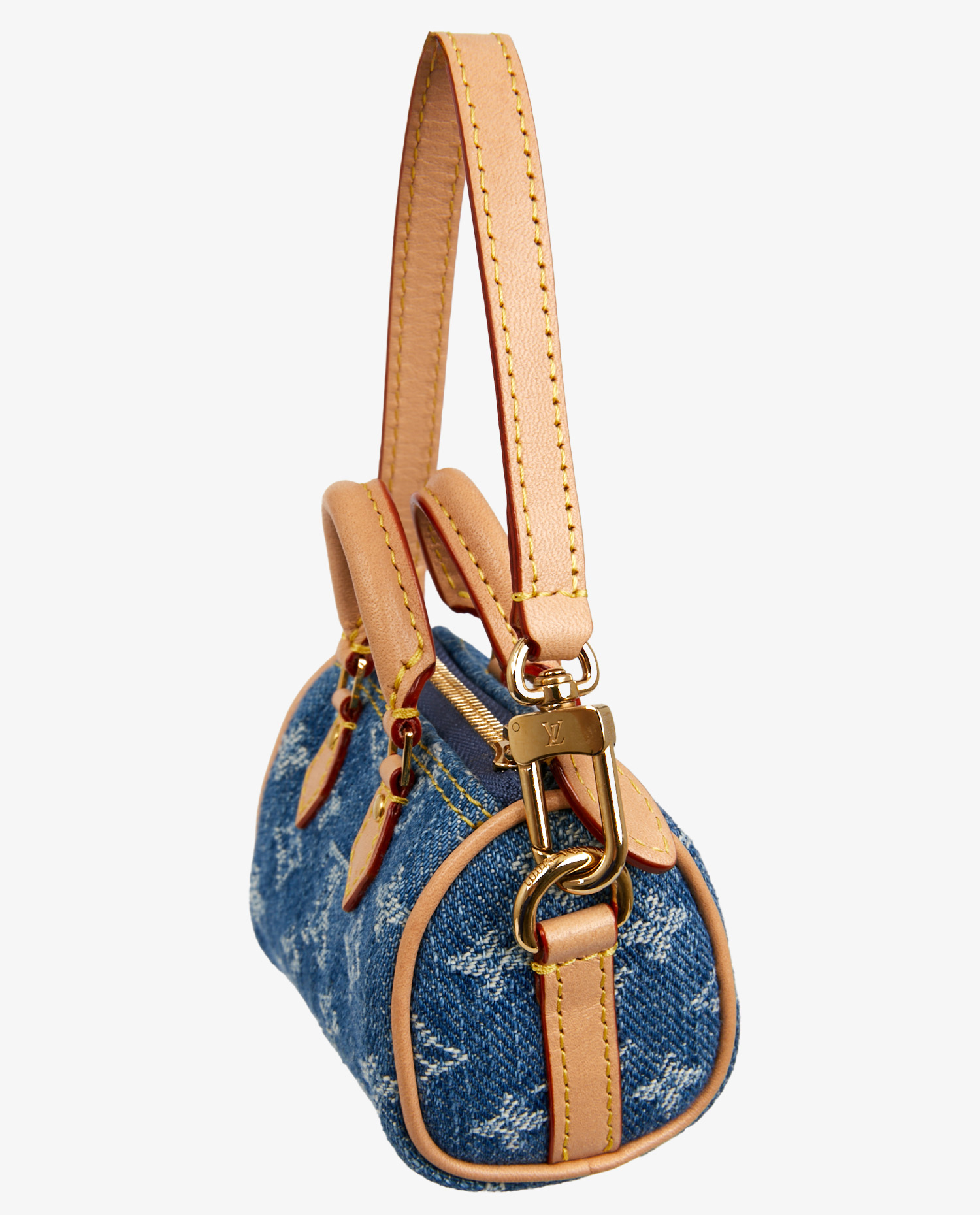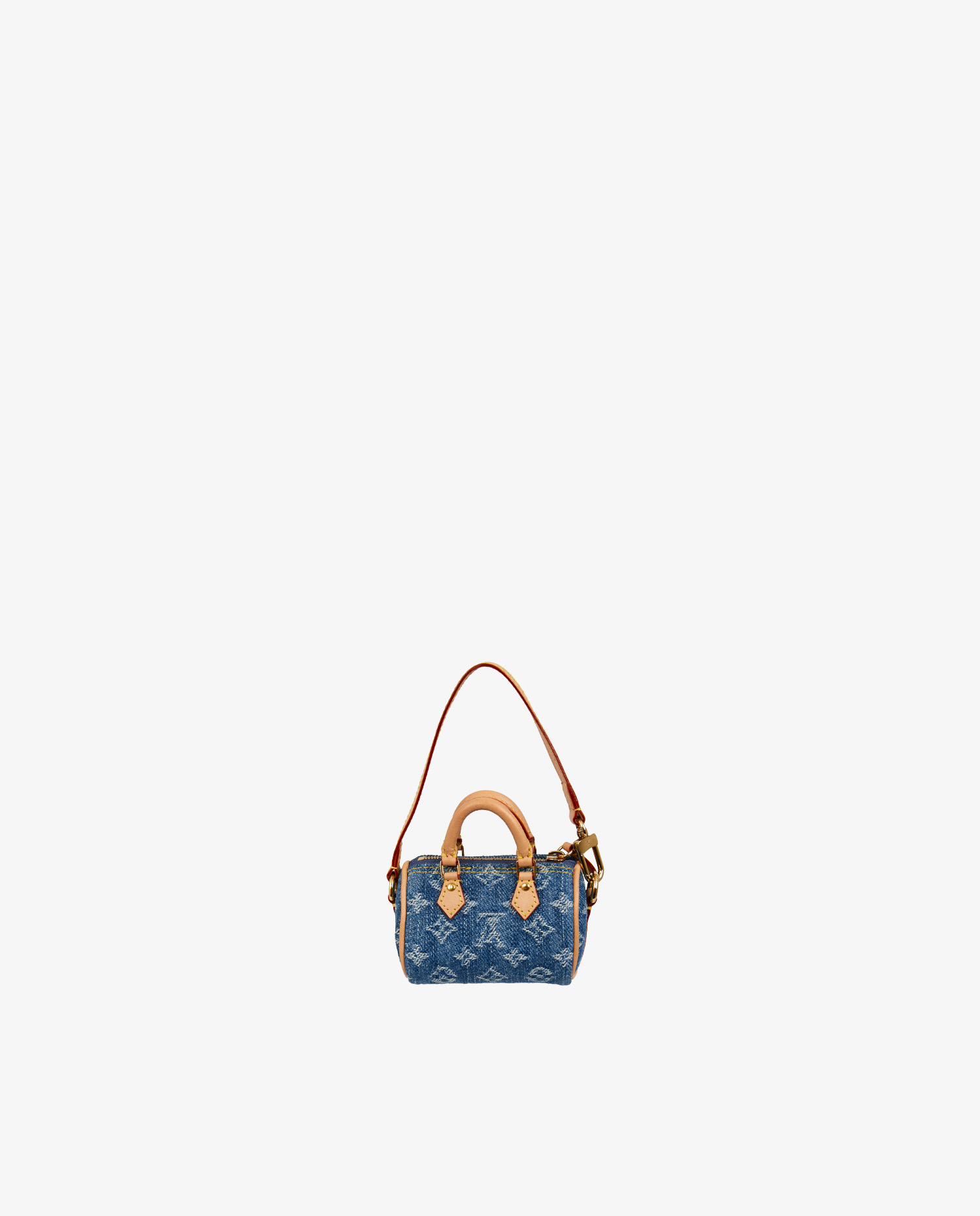 Monogram denim first appeared in Louis Vuitton collections in the early 2000s, under the artistic direction of Marc Jacobs. This bold choice of material was intended to modernize the brand’s image by introducing a more casual and contemporary dimension to the world of luxury. Denim is worked like a precious textile, with a deliberately controlled aged effect. The Monogram motif, emblematic of the brand since 1896, is embossed and deliberately faded for a vintage look. The nano format, meanwhile, is a miniaturized reinterpretation of the Speedy model, originally created in 1930 and popularized by Audrey Hepburn in the 60s. This jewel-like version of the bag combines the heritage of a legendary model with a boldly reinvented material.