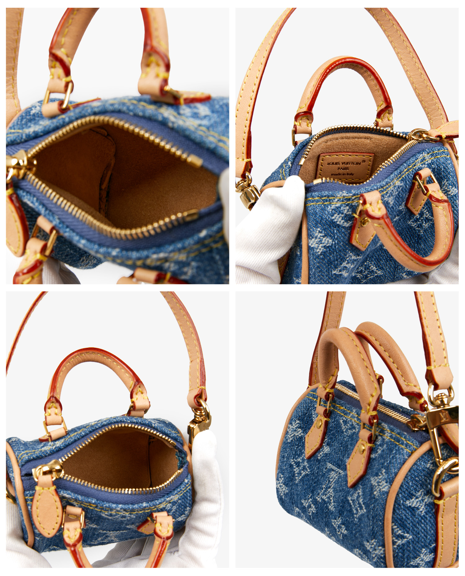 This jewel of a Louis Vuitton bag in Monogram denim, nano size, is a high-value hybrid piece for any collector or lover of luxury vintage accessories. It condenses the history of an iconic model – the Speedy – and the creative audacity of the house in a resolutely contemporary format. Its decorative appearance, relative rarity and impeccable condition make it a collector’s item that also retains its practical utility. Perfect as an accessory to clip to a larger bag, or to carry as a mini accent bag, it bears witness to a taste for detail, authenticity and timeless style typical of Louis Vuitton creations.