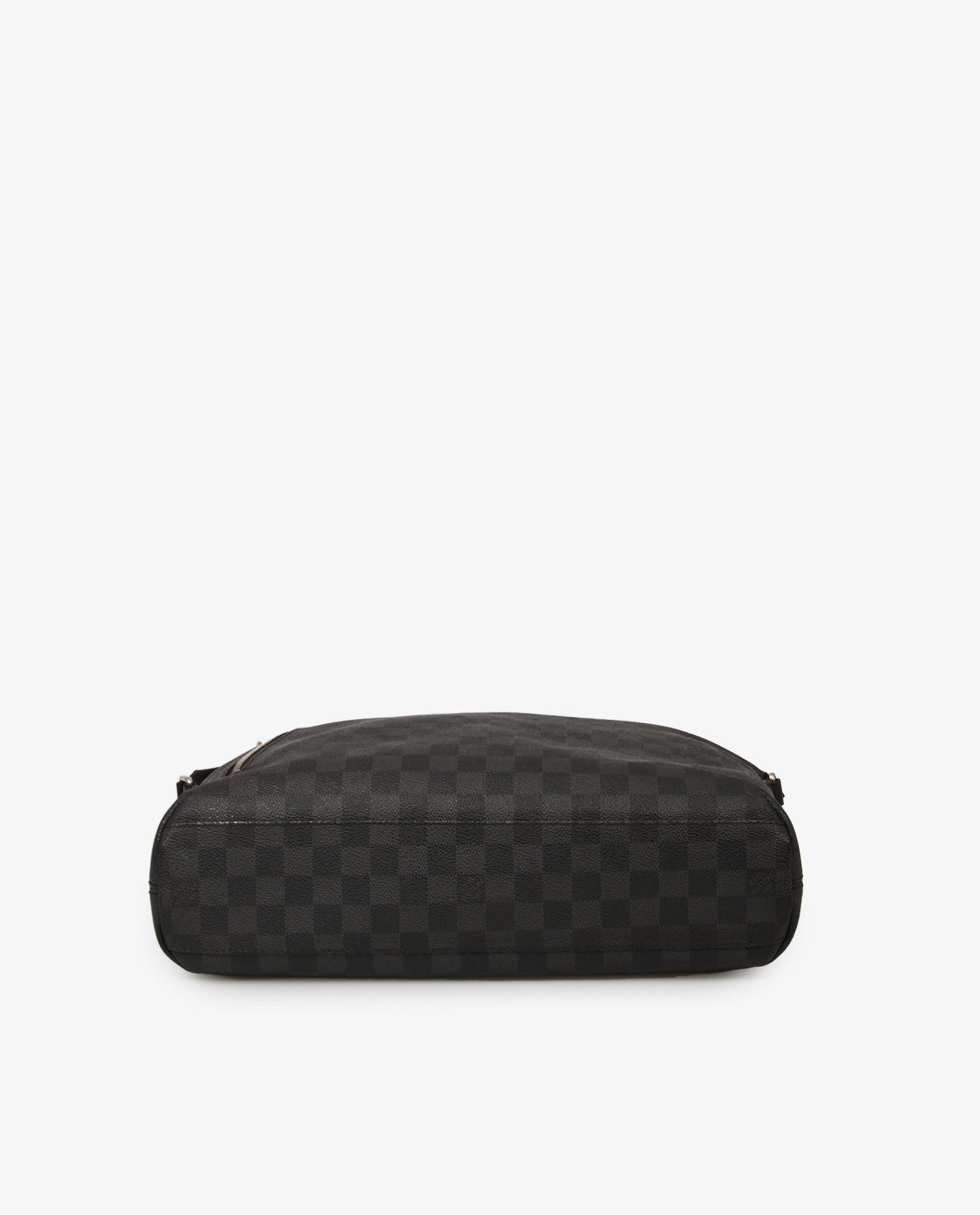 The Damier Graphite canvas features dark gray and black checkerboards printed on a coated canvas with a grained texture, resistant to water and scratches. The bag is adorned with smooth black leather trim on the sides and around the closures. The zippered exterior front pocket is highlighted by leather trim embossed with the Louis Vuitton Paris logo. The polished silver brass metal elements (zippers, shoulder strap attachment rings) show a few micro-scratches from use. The black canvas shoulder strap is adjustable, with the Louis Vuitton name woven in tone-on-tone.