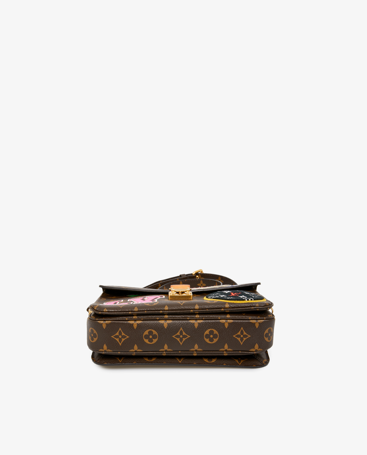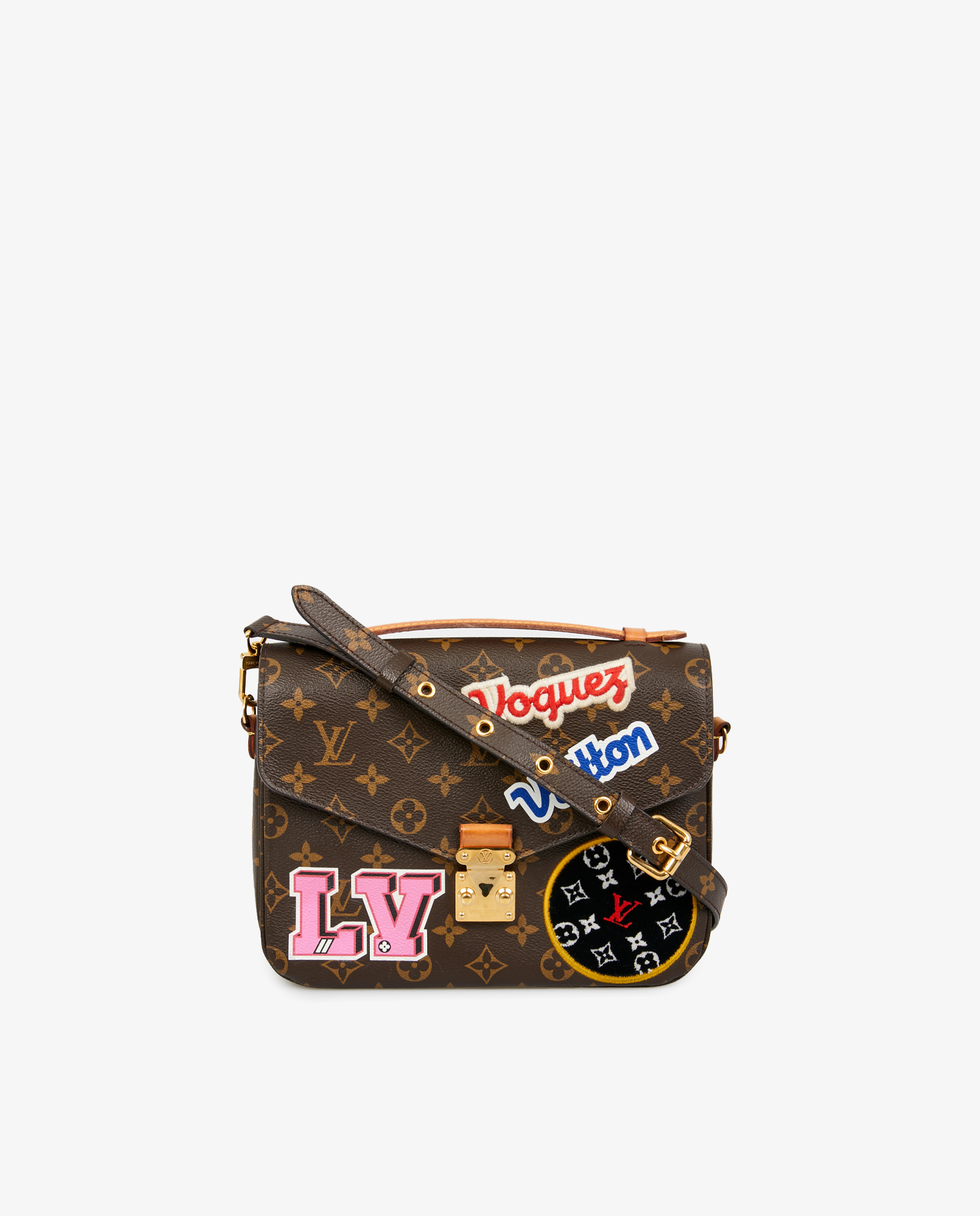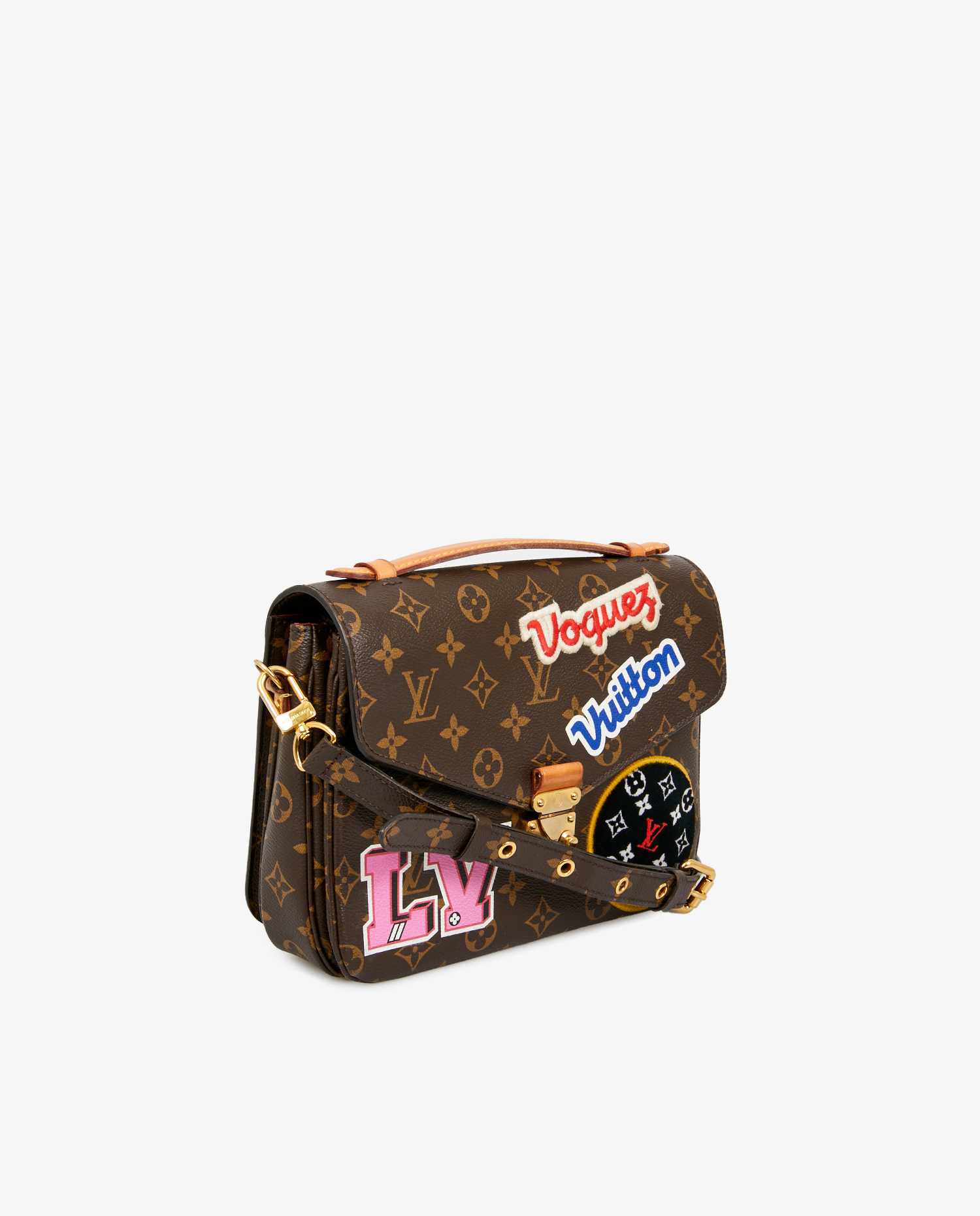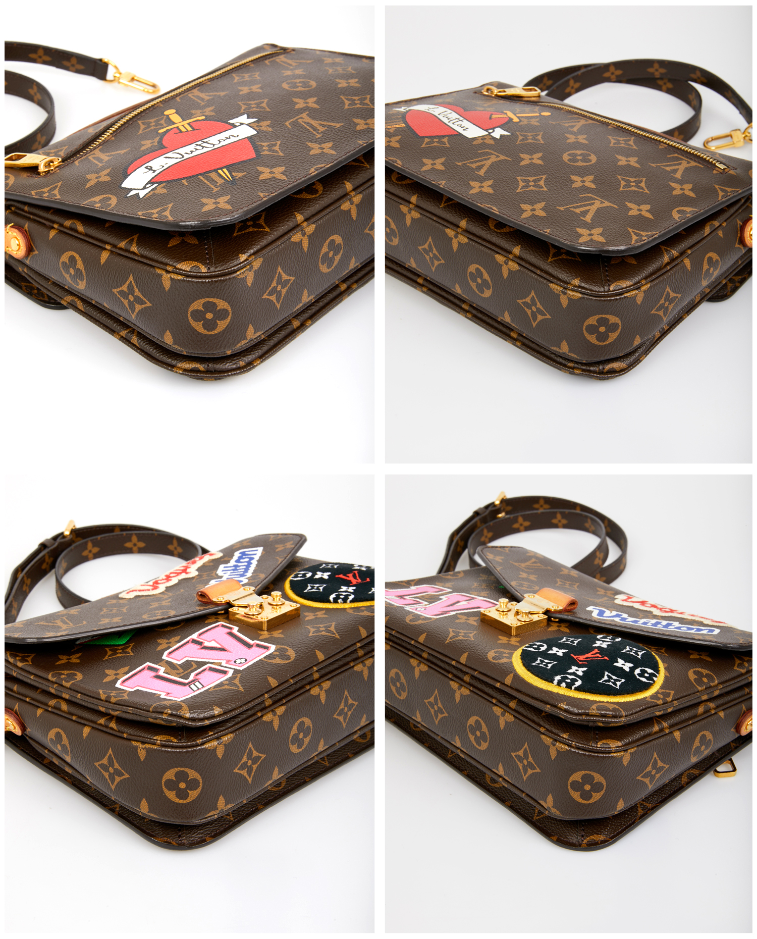 Louis Vuitton collector’s Metis bag in monogram canvas. A patchwork of different materials with the “LV” and “Vuitton” logo on the bag, giving it a more casual feel. The interior is in pink suede with 3 storage compartments. It can be carried by hand or crossbody with an adjustable, removable shoulder strap. In very good condition.