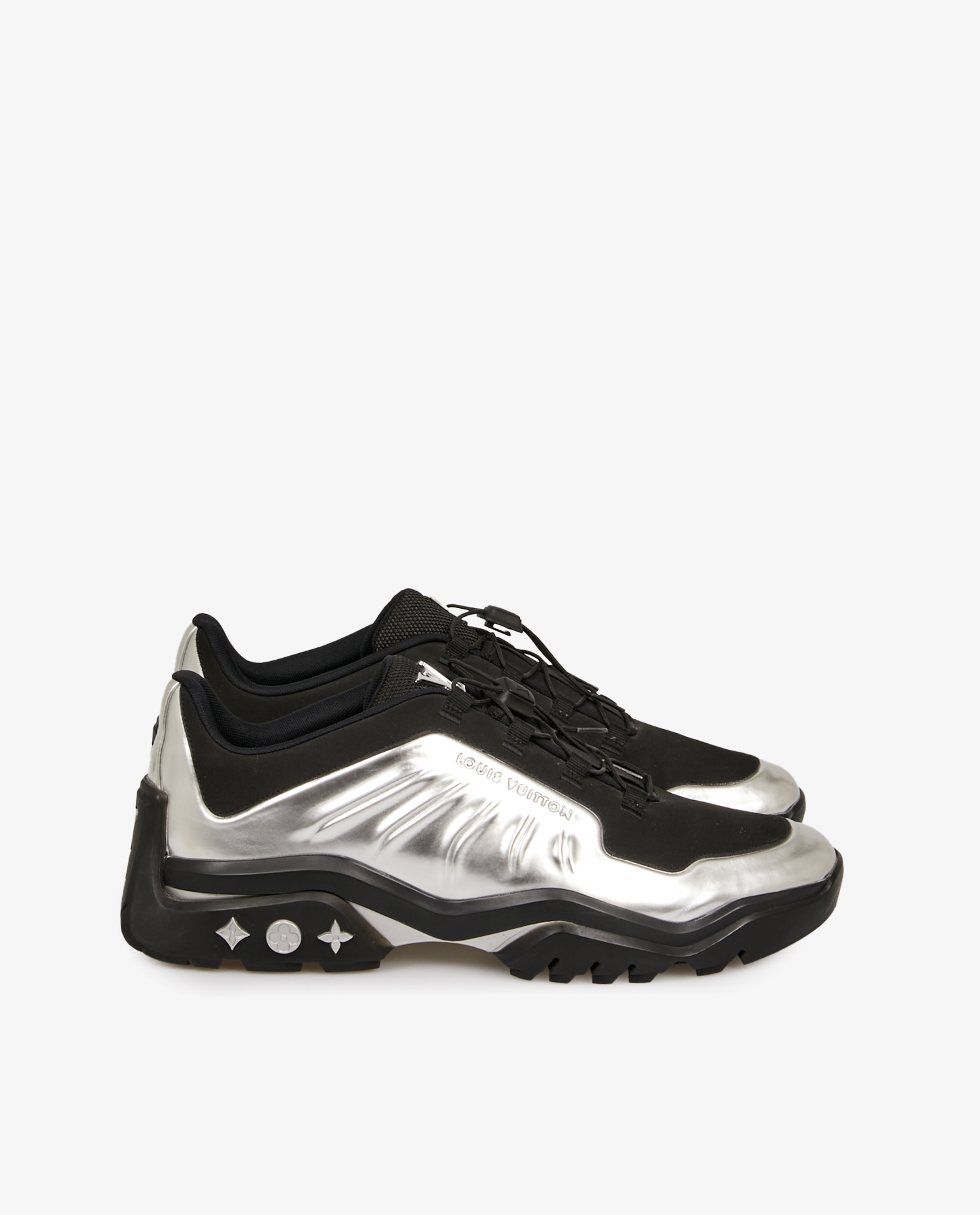 Inspired by the famous Air Foamposite, this futuristic sneaker was designed by Virgil Abloh for Louis Vuitton. Crafted in metallic silver canvas, it features a technical mesh tongue and laces evoking the world of hiking. The shock-absorbing rubber outsole is adorned with silver Monogram flowers, and the initials “LV” in silver metal are embossed on the tongue.