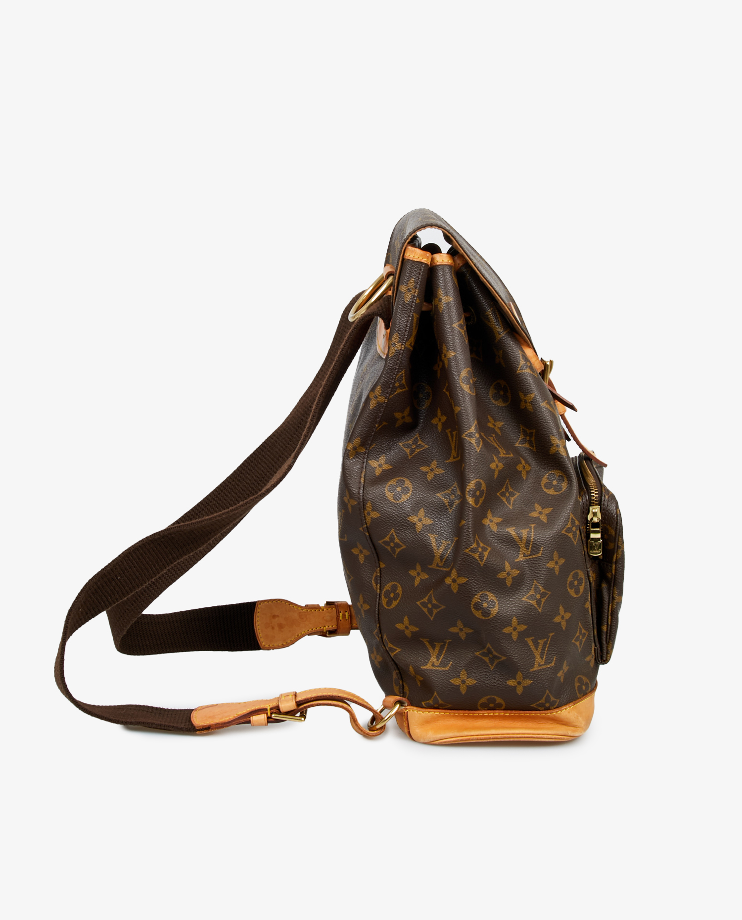 Vintage Louis Vuitton backpack in monogram canvas and cowhide leather trim. The fittings are in gilded metal. Medium size. In very good condition. Slight patina of the leather and wear marks from use, giving it a vintage feel. See photos.