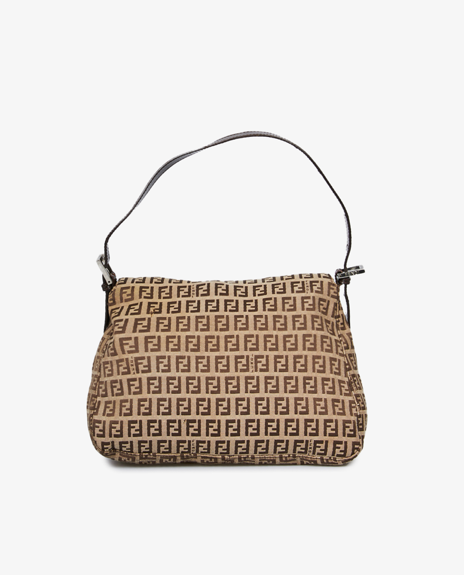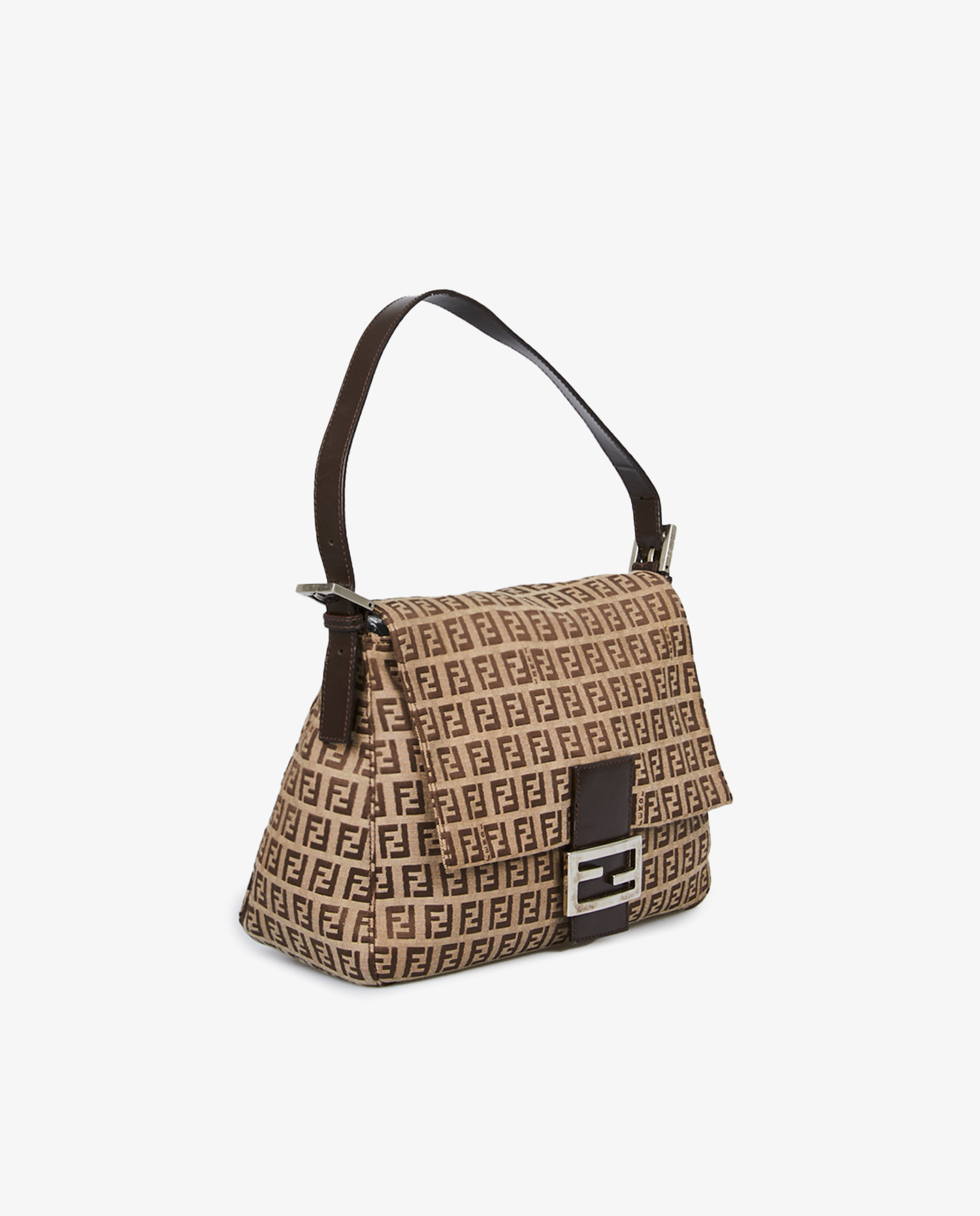 Mamma Fendi bag in monogram canvas. Shoulder bag with brown leather handle. Snap closure. In very good condition. A tear is visible on the back of the bag.