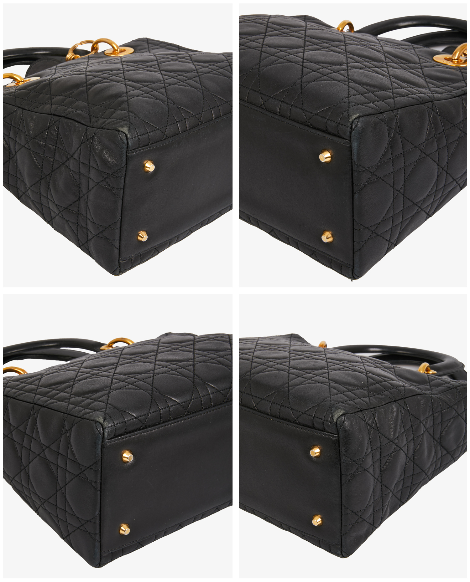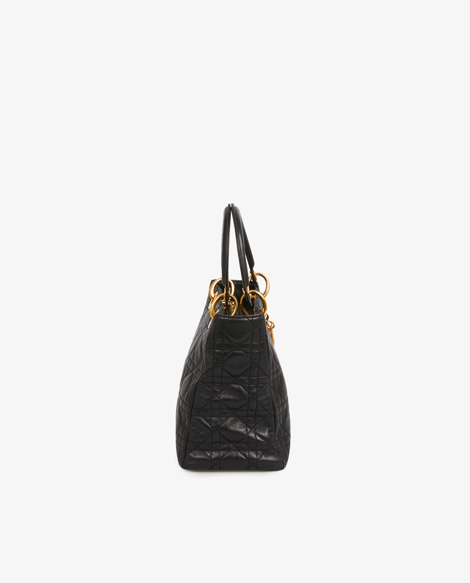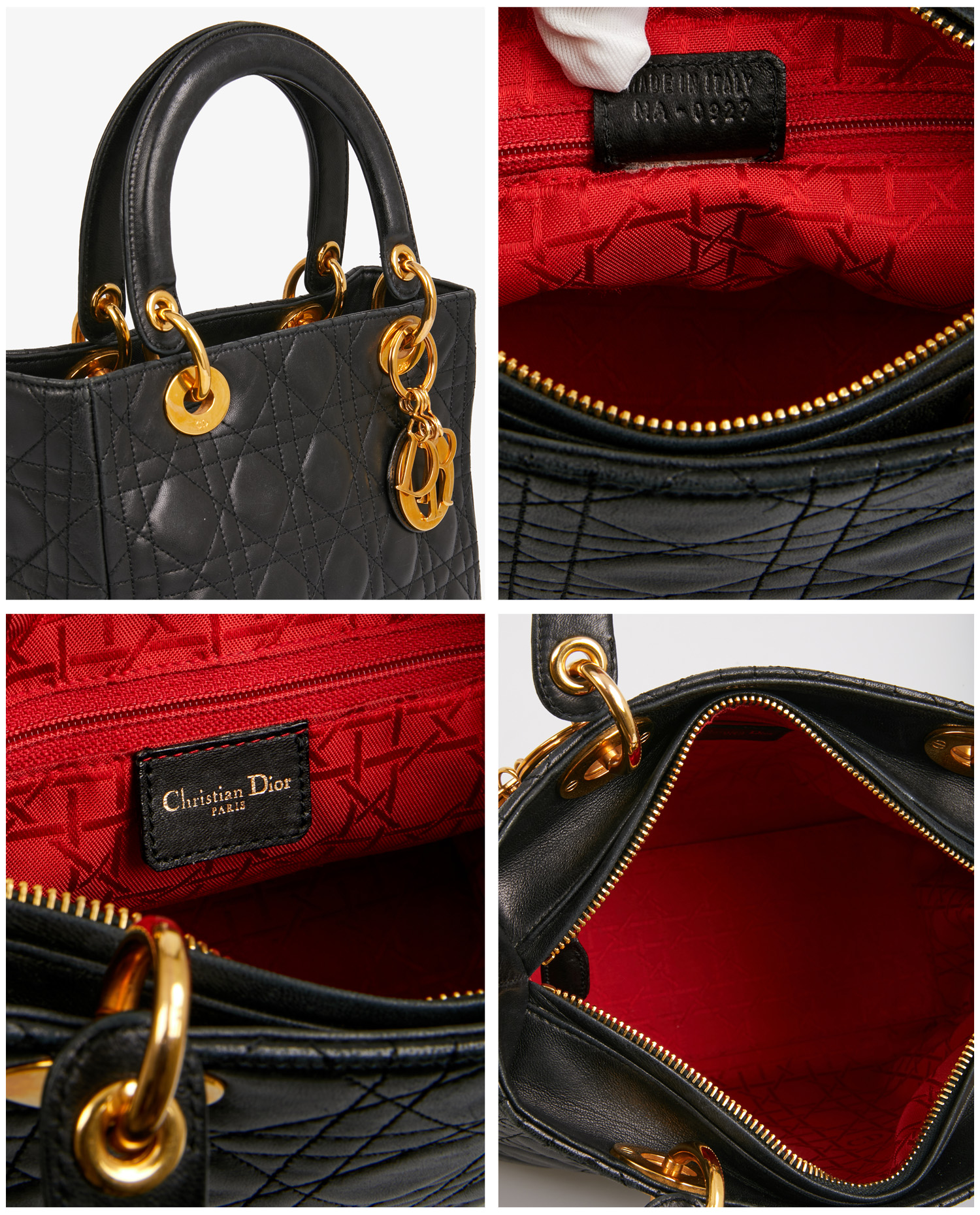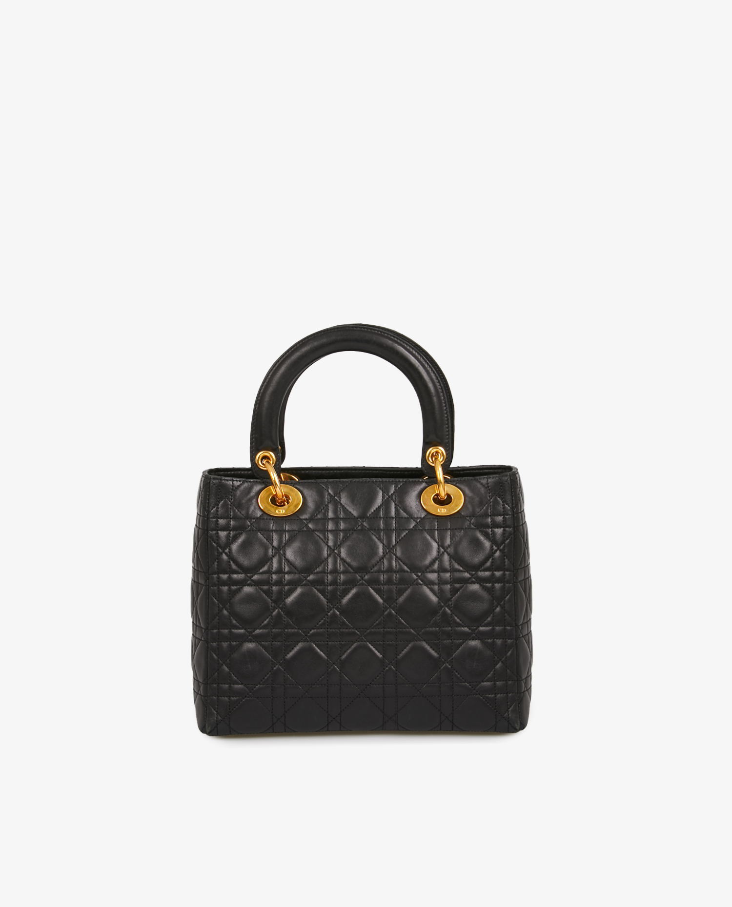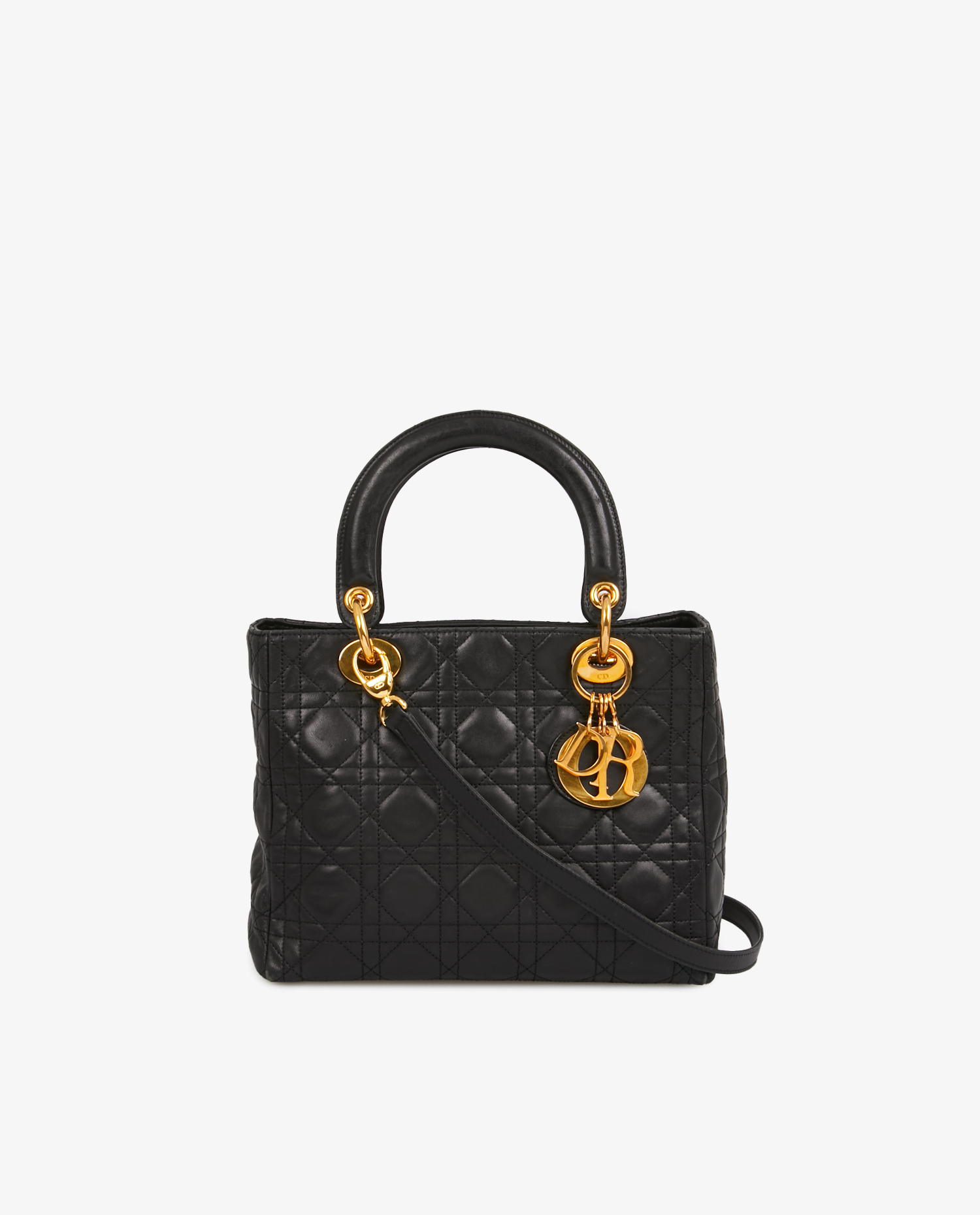 Vintage Lady Dior bag in quilted lambskin with black Cannage stitching. Gold metal D.I.O.R charms on front. Zipper closure. Carried by hand or on the shoulder, or as a crossbody with a removable shoulder strap (90cm). In very good condition. A few scratches on the jewelry.