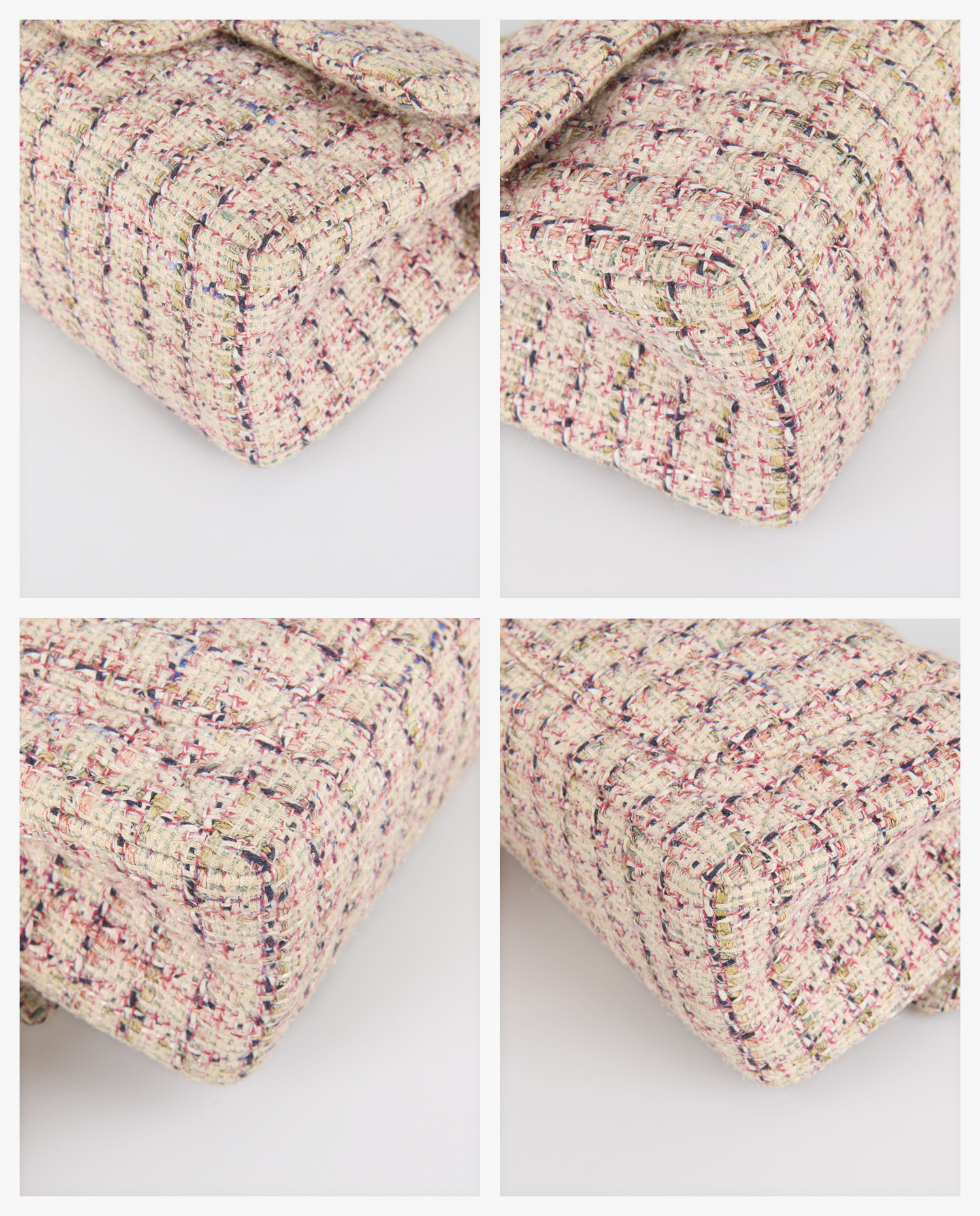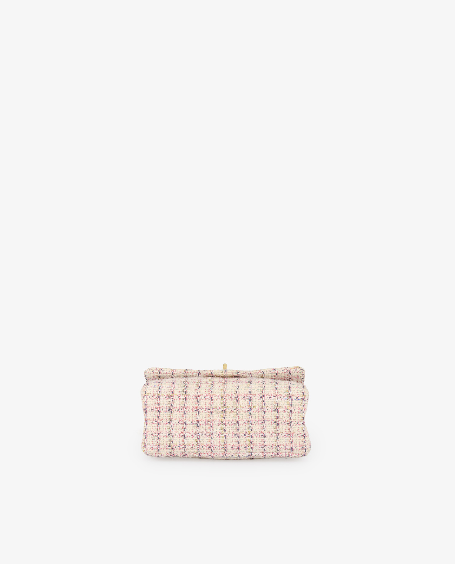 The tweed features a dense, textured weave, blending wool and cotton yarns in pastel tones with a grid structure. The patinated gold metal clasp adds a vintage touch and contrasts subtly with the softness of the textile material. The gold chain, with flat links and no interwoven leather, can be worn on the shoulder or crossed. The back of the bag has no pockets, highlighting the regularity of the weave. The finishes are clean, with attention paid to the alignment of the pattern on the different sides.