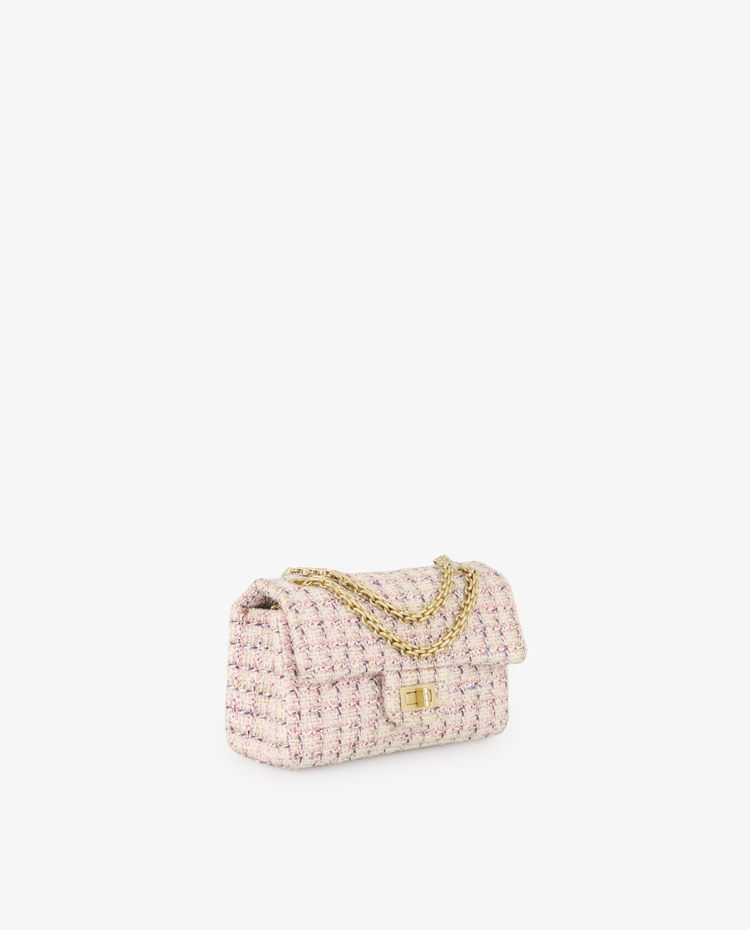Created by Gabrielle Chanel in February 1955, the 2.55 bag takes its name from the date of its creation. It was originally distinguished by the introduction of a metal chain shoulder strap, an innovation that freed up the hands at a time when bags were only carried by hand. The Mini version, launched much later, takes up the key elements of the historic model: leather-free chain, rectangular clasp, clean lines. The use of tweed, Chanel’s signature material since the 1920s, reinforces the link between tradition and modernity in this revisited model.