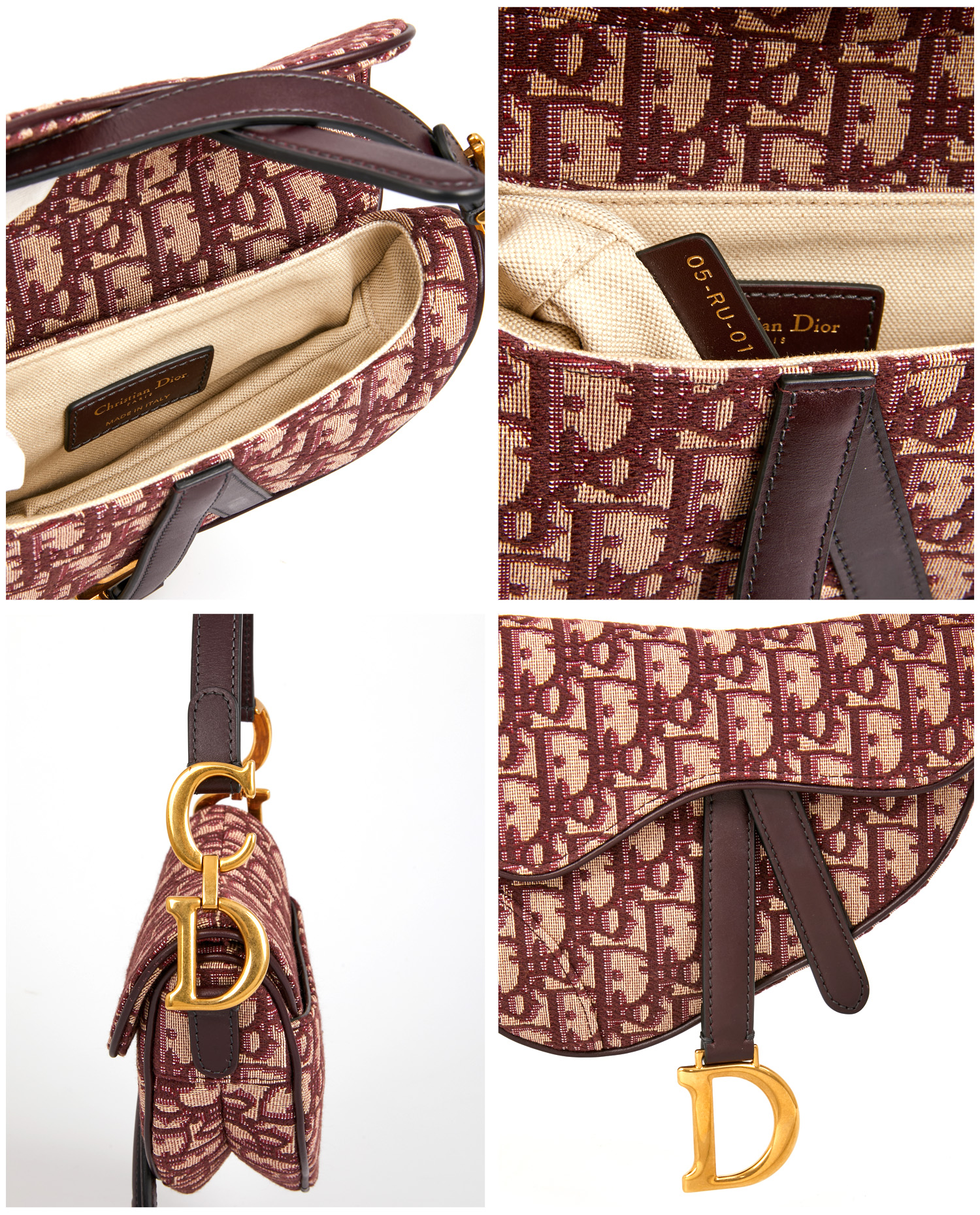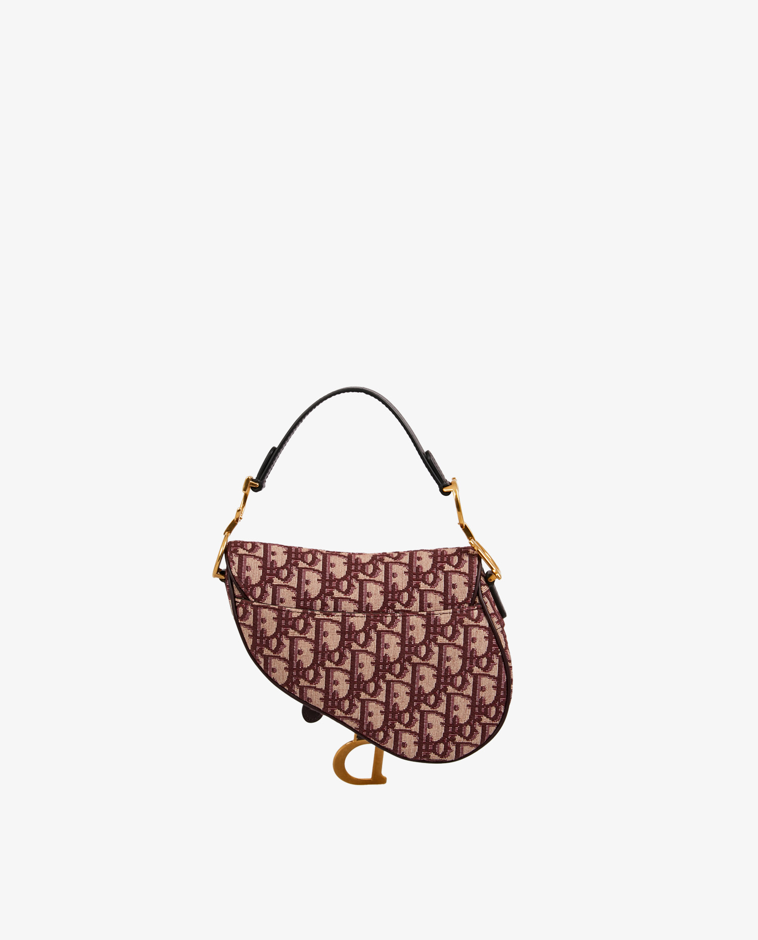 Saddle Christian Dior mini bag in burgundy Dior oblique jacquard canvas. Antique gold metal jewelry. Magnetic closure. Finished in calf leather. Hand-carried. In very good condition.