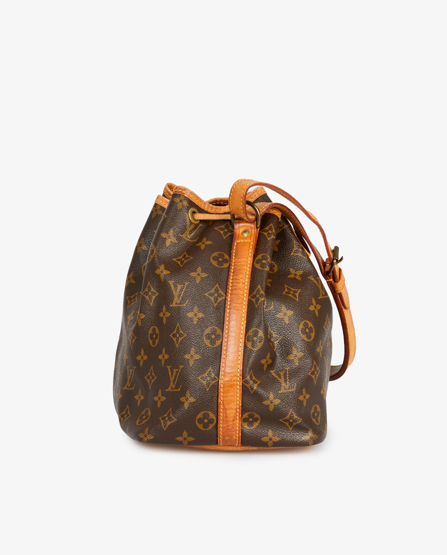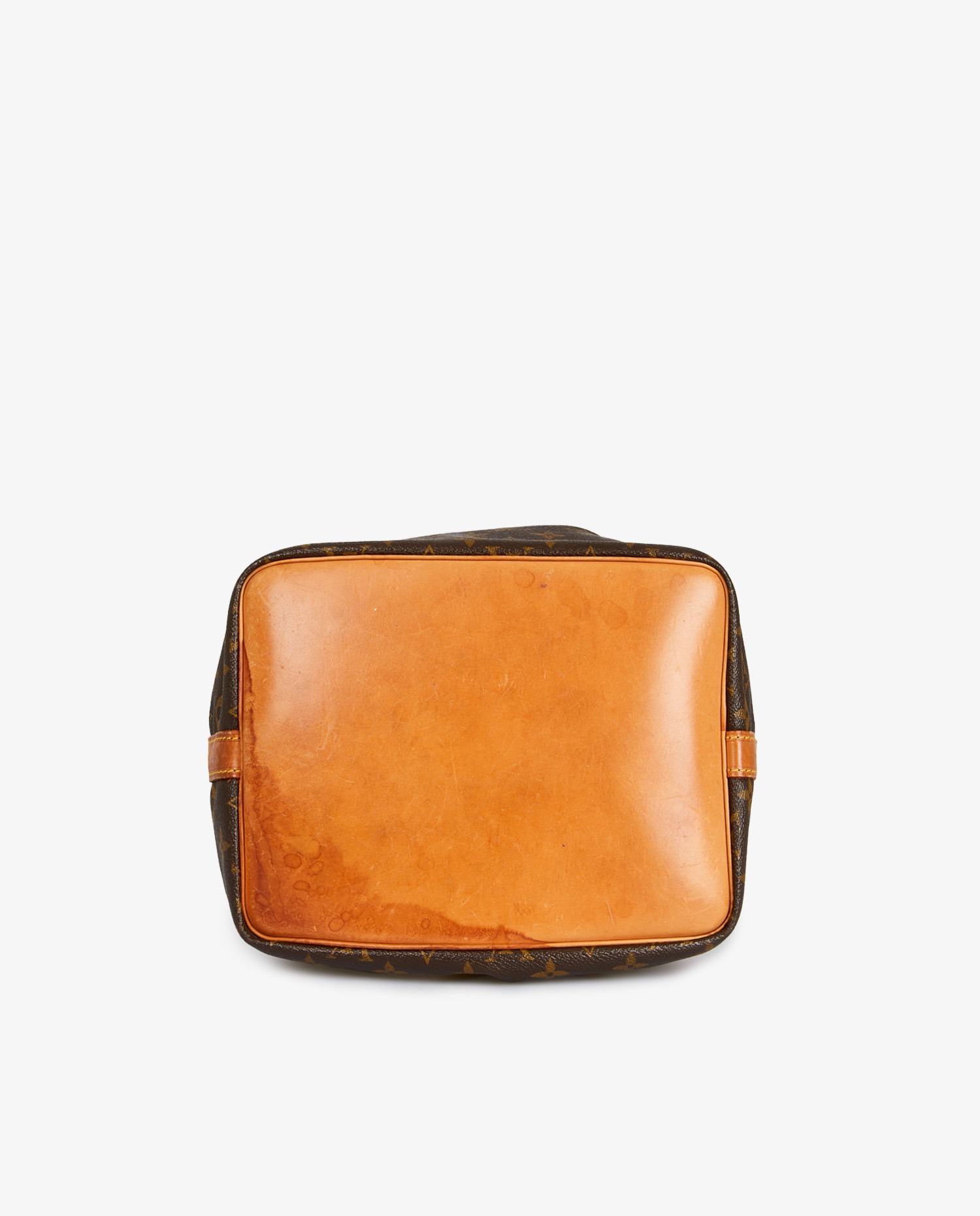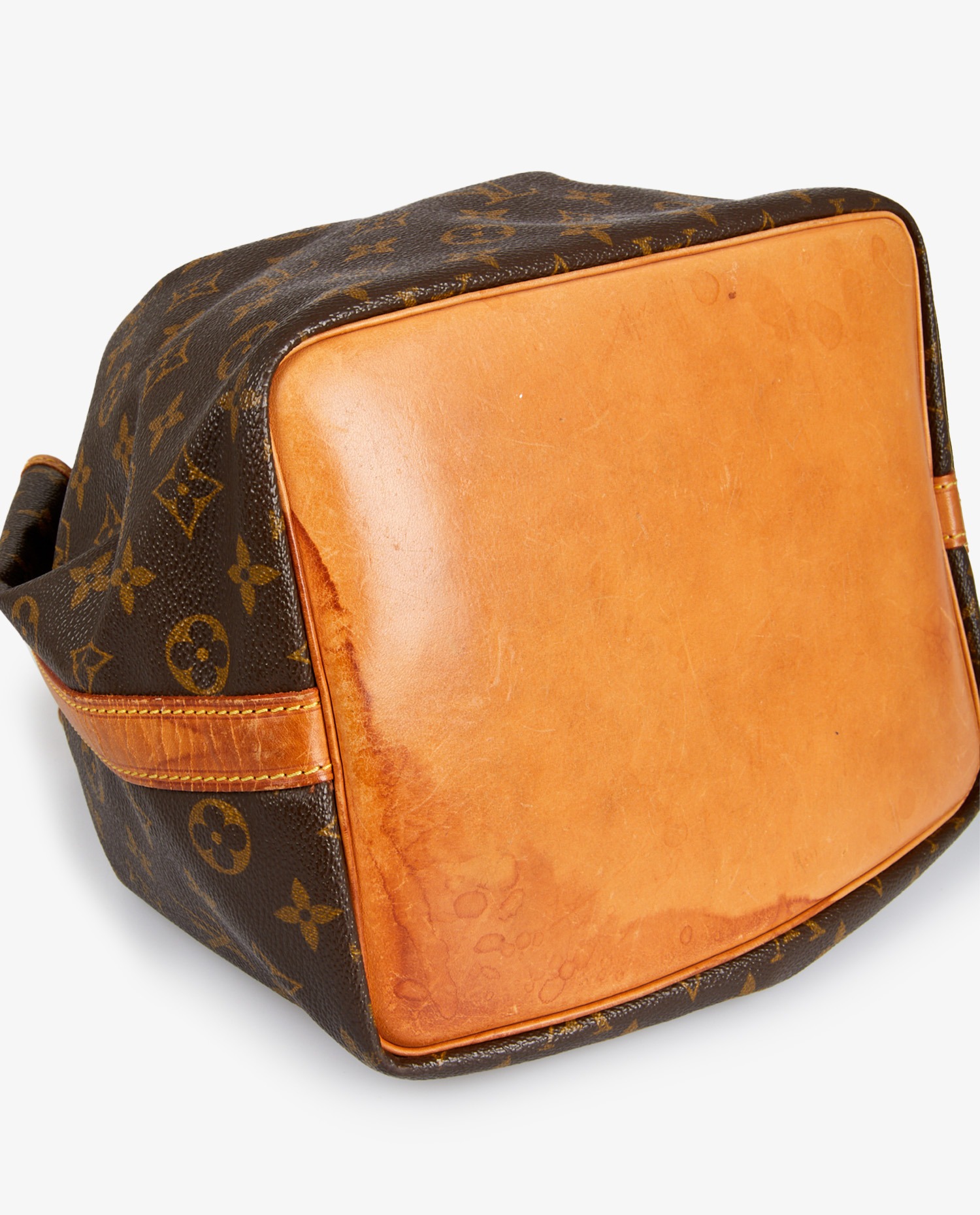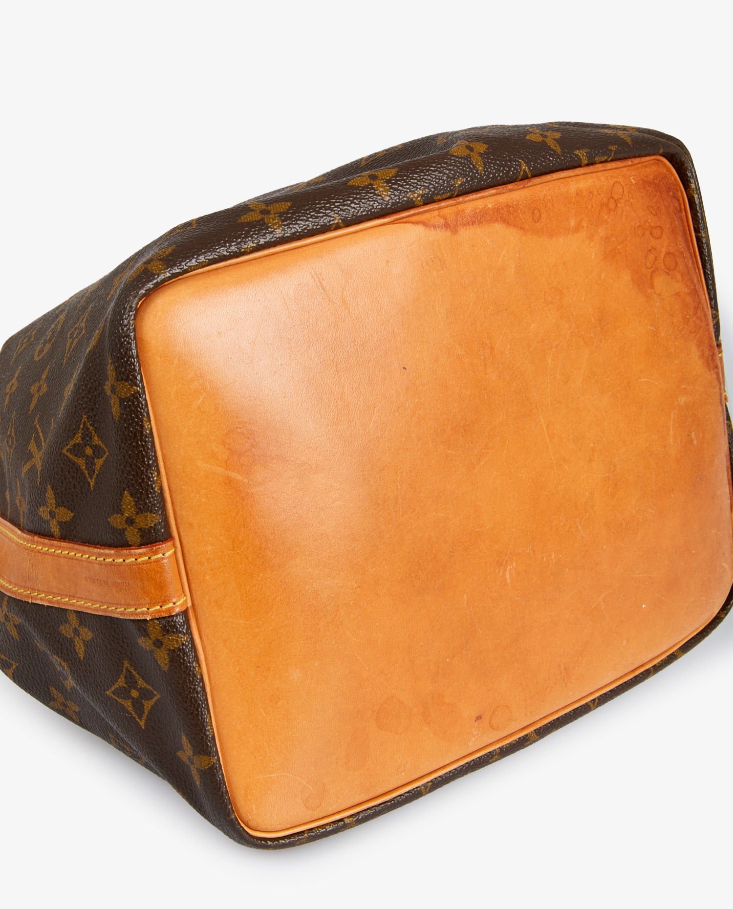Louis Vuitton Noé small bag in monogram canvas and natural cowhide. The interior is in brown fabric. Shoulder-worn (68cm). In good condition. The leather has a patina and a stain is visible on the underside of the bag.