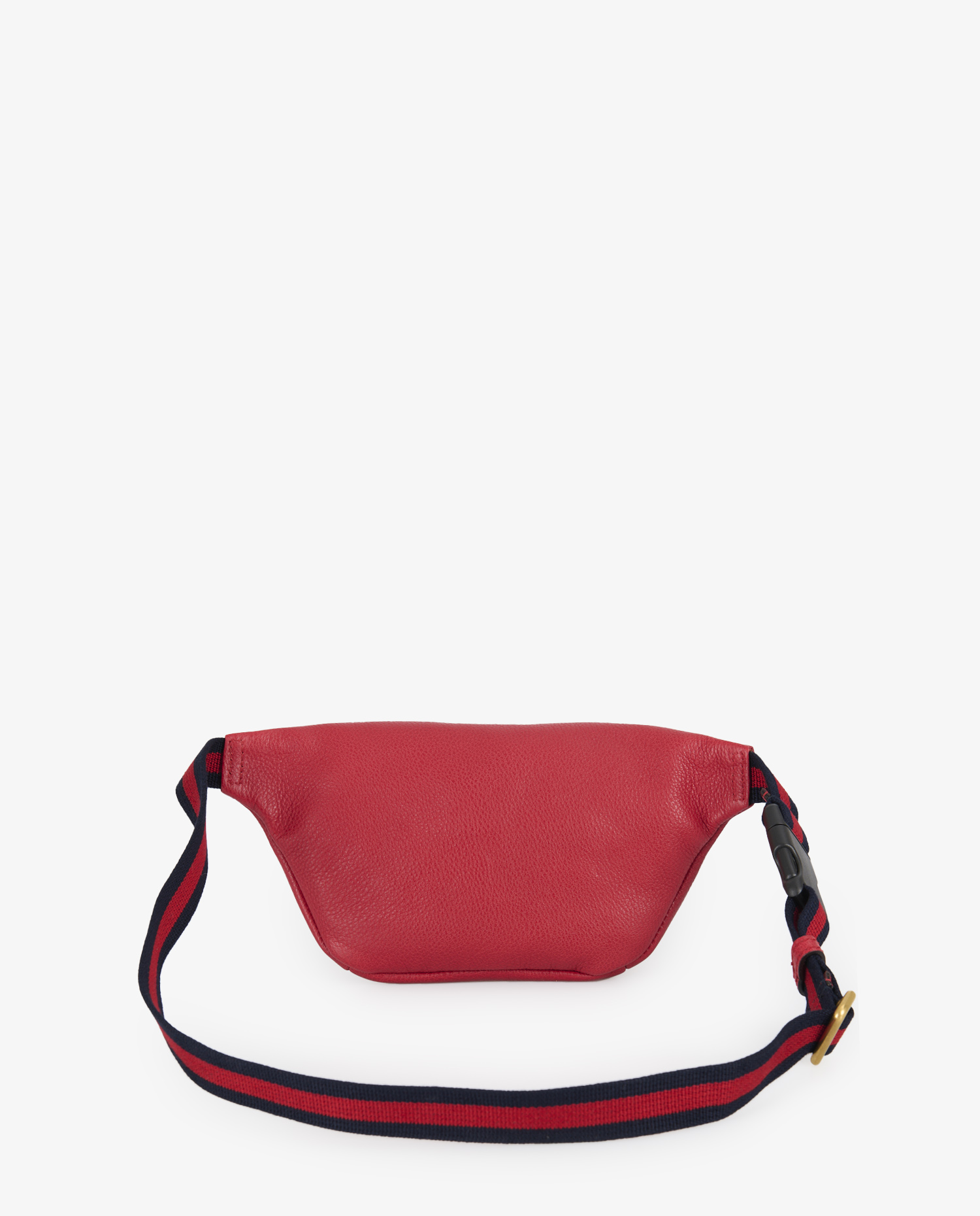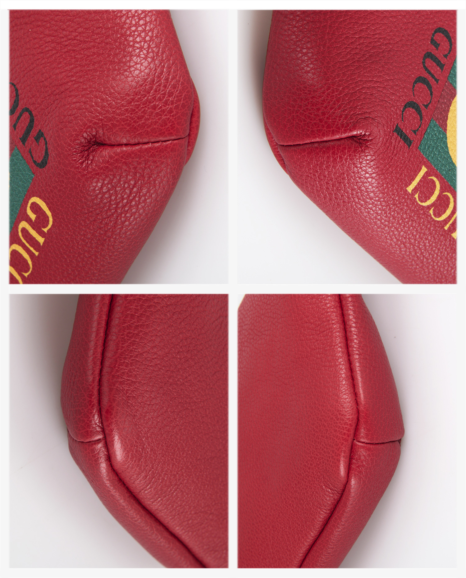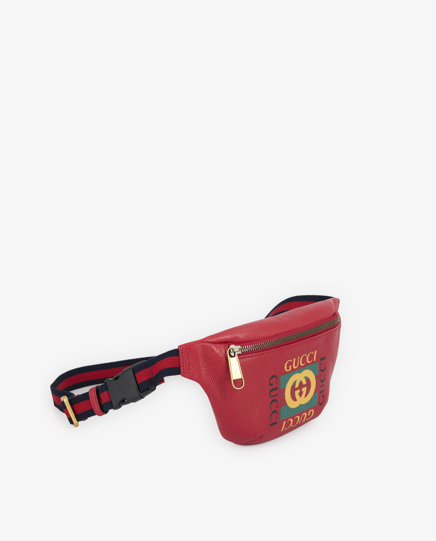 Red grained leather features a distinctive texture, both supple and durable, with a matte finish. Visible stitching reinforces the corners and ensures lasting strength. The GUCCI logo is printed four times around the interlaced central GG emblem, in a symmetrical design typical of the ’80s. The gold zipper is accompanied by a sturdy metal zip. The navy blue and red striped canvas shoulder strap features a brass buckle adjustment and a black clip clasp for a secure hold.