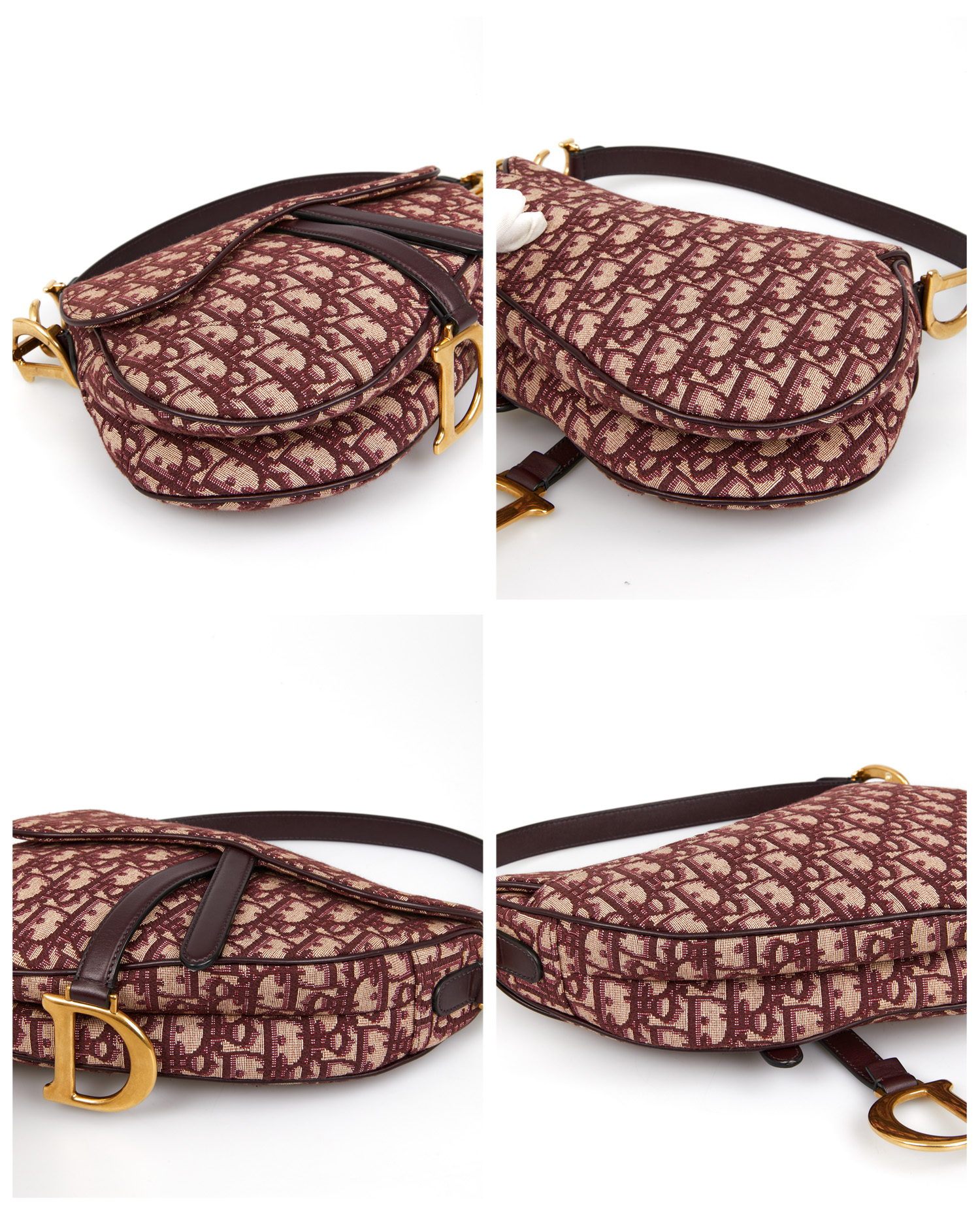 The bag is crafted in thick jacquard canvas, enhanced by the precisely woven burgundy and beige Dior Oblique motif. Its curved shape hugs the side of the body perfectly when worn on the shoulder. The asymmetrical stirrup-shaped flap, typical of the model, closes with a concealed magnetic system. Two side straps hold the golden “C” and “D”, adding a discreet yet emblematic signature. The short shoulder strap is in smooth burgundy leather with sturdy metal fasteners, for a structured shoulder carry.